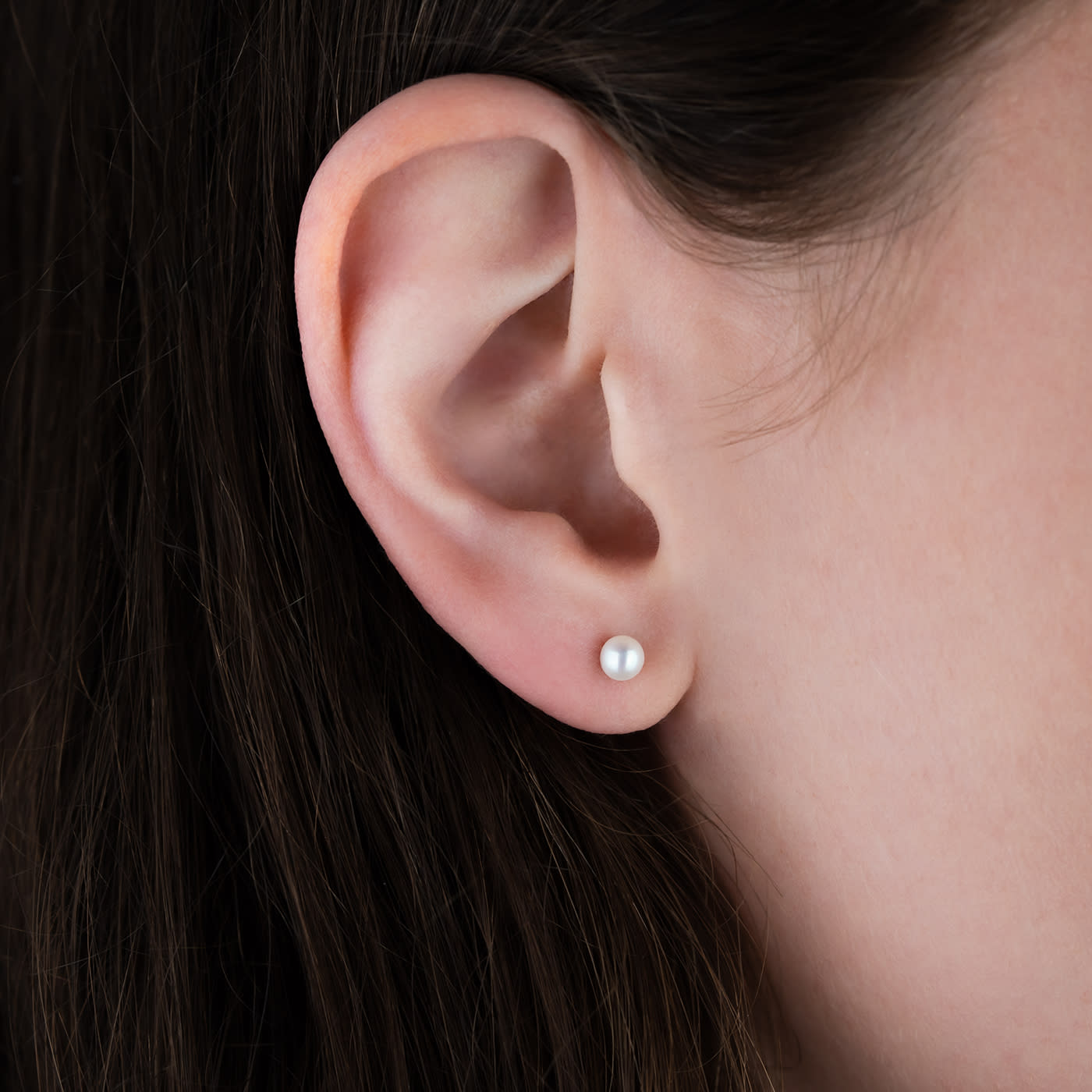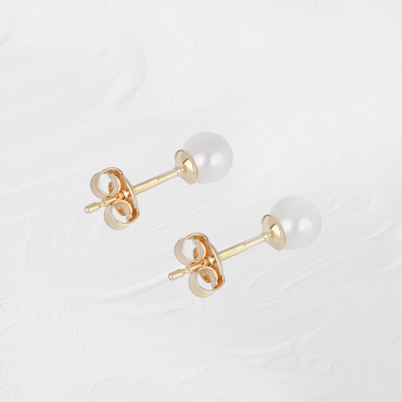 These brand new fresh water pearl earrings feature a round 4mm pearl in 9ct yellow gold