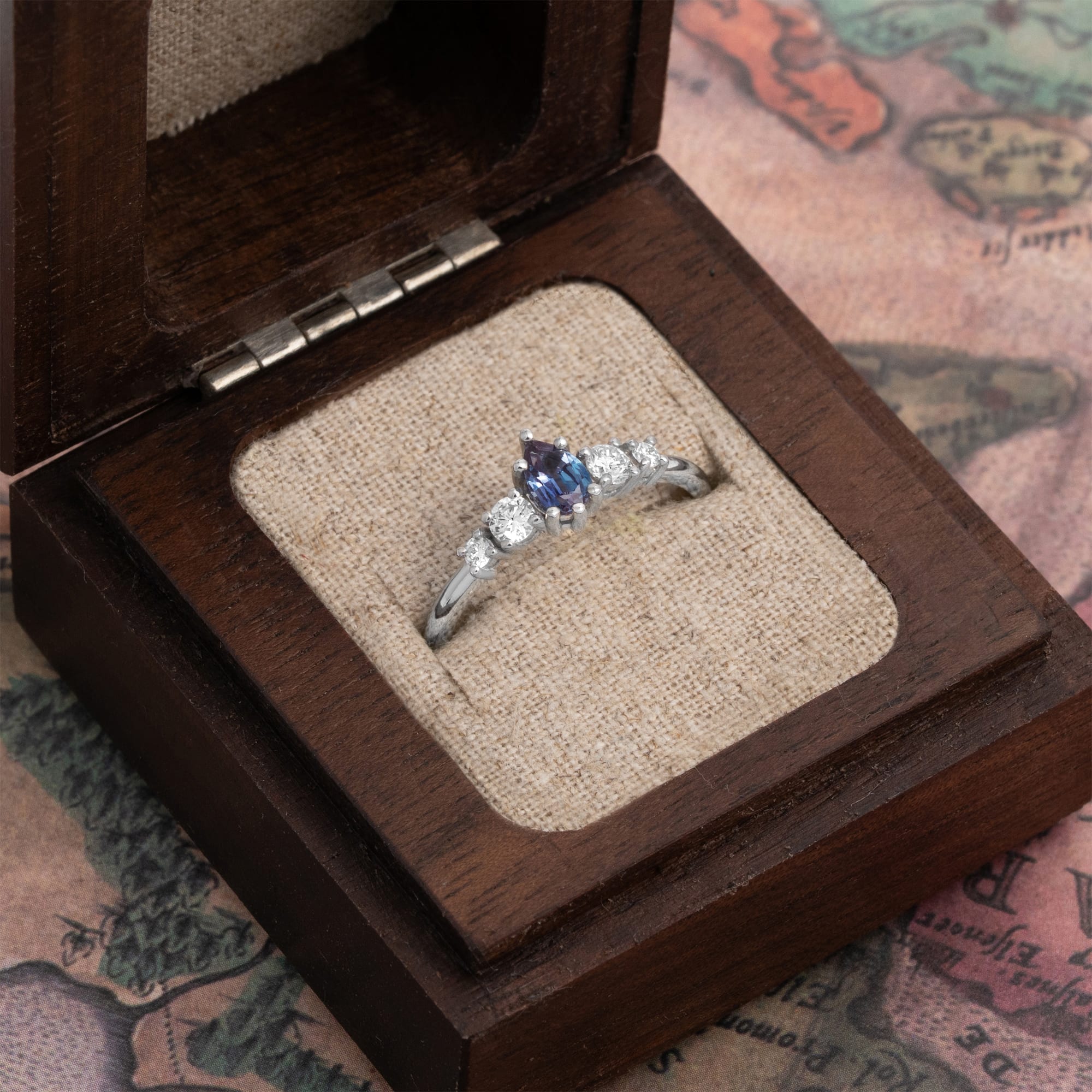 Description: This five-stone engagement ring features a central pear-cut lab-grown Alexandrite stone, claw set in a low-profile mount. Four graduated brilliant-cut lab-grown diamonds flank the centre stone. The design provides an elegant and sleek presentation suitable for daily wear.