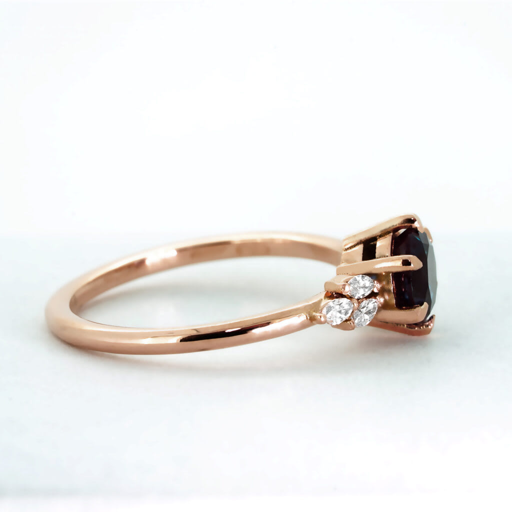 This brand new stunning ring features a central round cut lab grown Alexandrite, that has been claw set with 6 marquise cut diamonds in a floral style setting!