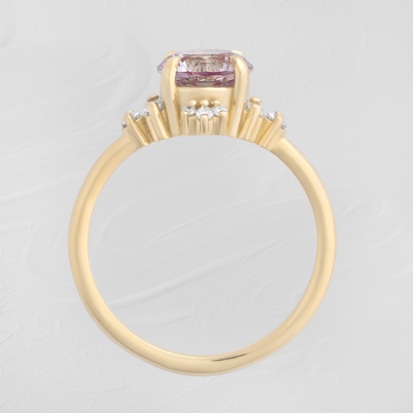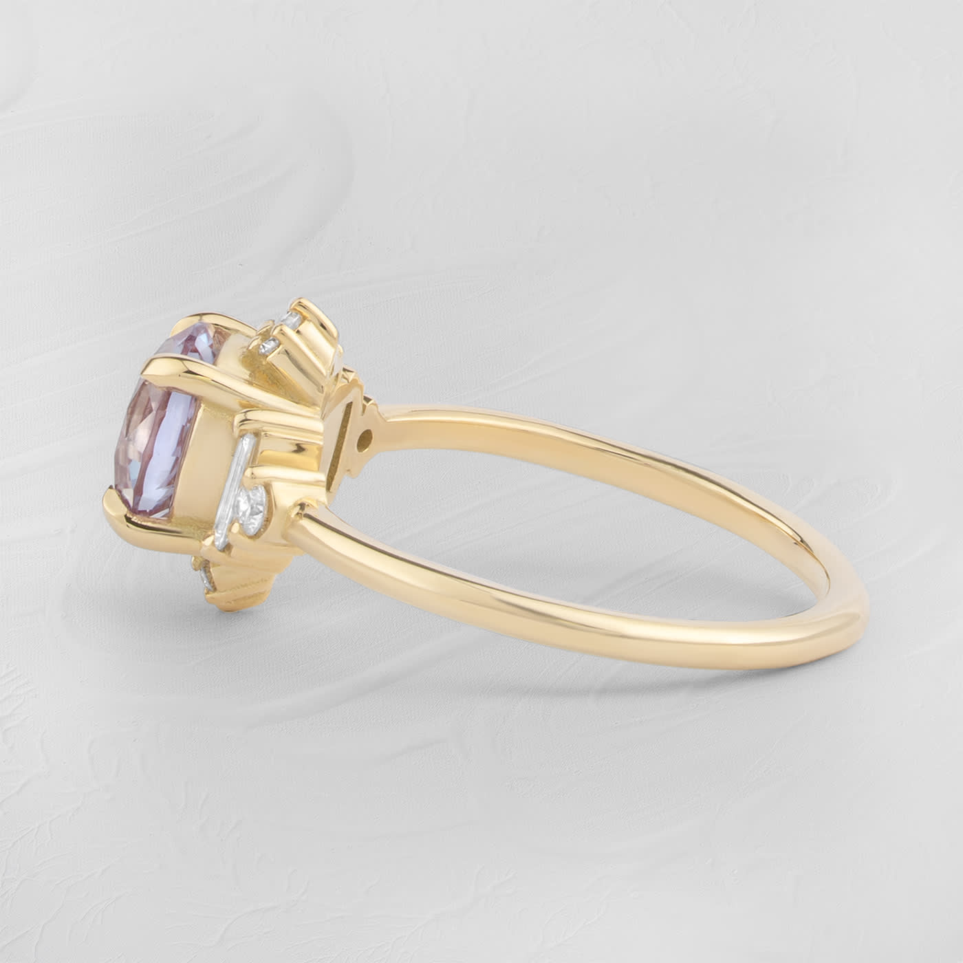 This cluster engagement ring features a lab grown brilliant cut Alexandrite, framed by a halo of lab-grown round and baguette accent diamonds. This Alexandrite is unique in that it displays a light pastel hue rather than the traditional deep purple/red. We recommend viewing this stone in person to appreciate the full array of colours, as it is very difficult to capture on camera. The design utilizes an antique-inspired setting. The ring is constructed with a low-profile setting, ensuring the fine jewellery sits close to the finger.