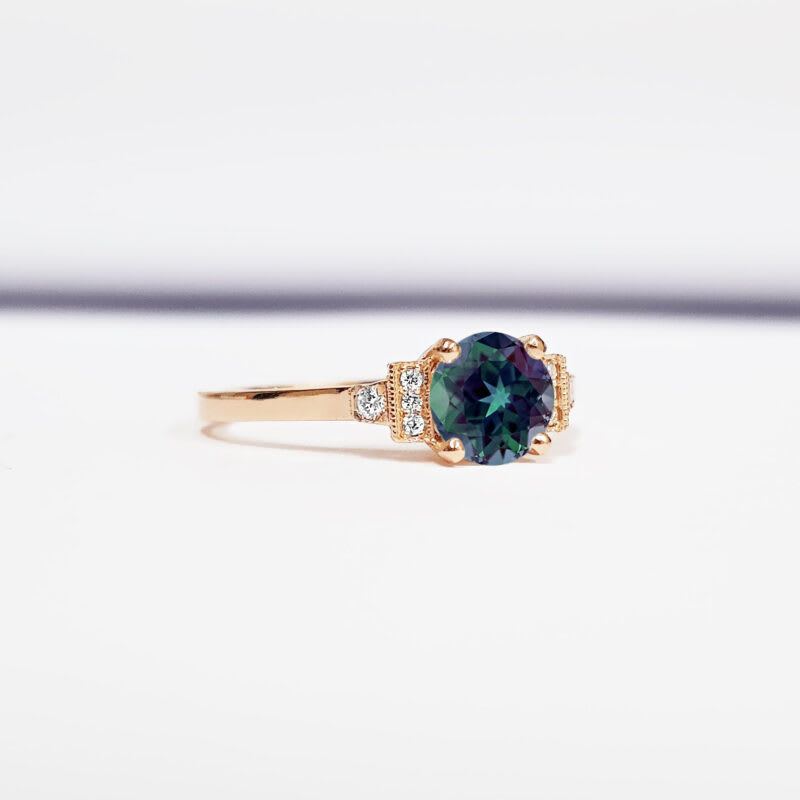 This brand new stunning ring features a central 1 carat lab grown alexandrite, set in a stunning antique 1920s inspired mount.