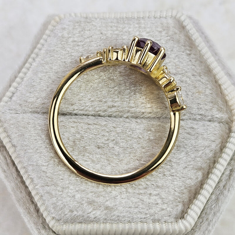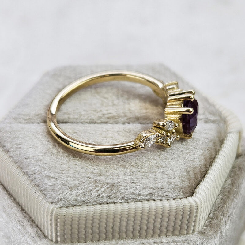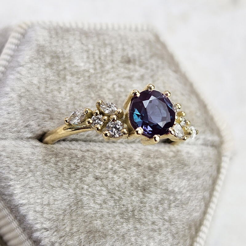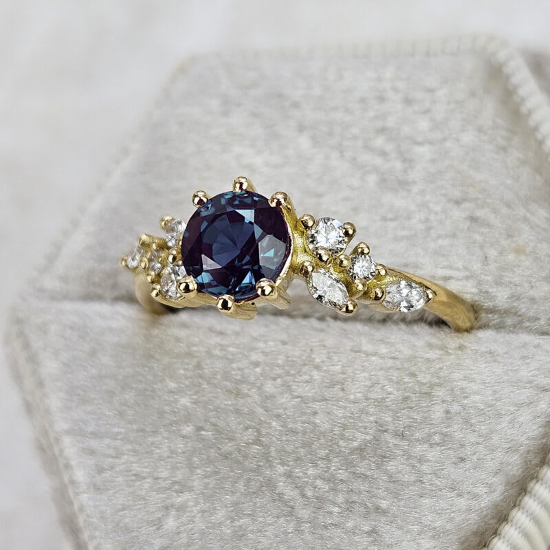 This brand new ring features a mesmerizing round cut lab grown Alexandrite, set with a mixture of marquise and round cut diamonds in a flowing, floral inspired pattern. The ring is designed to be low profile from the finger.
