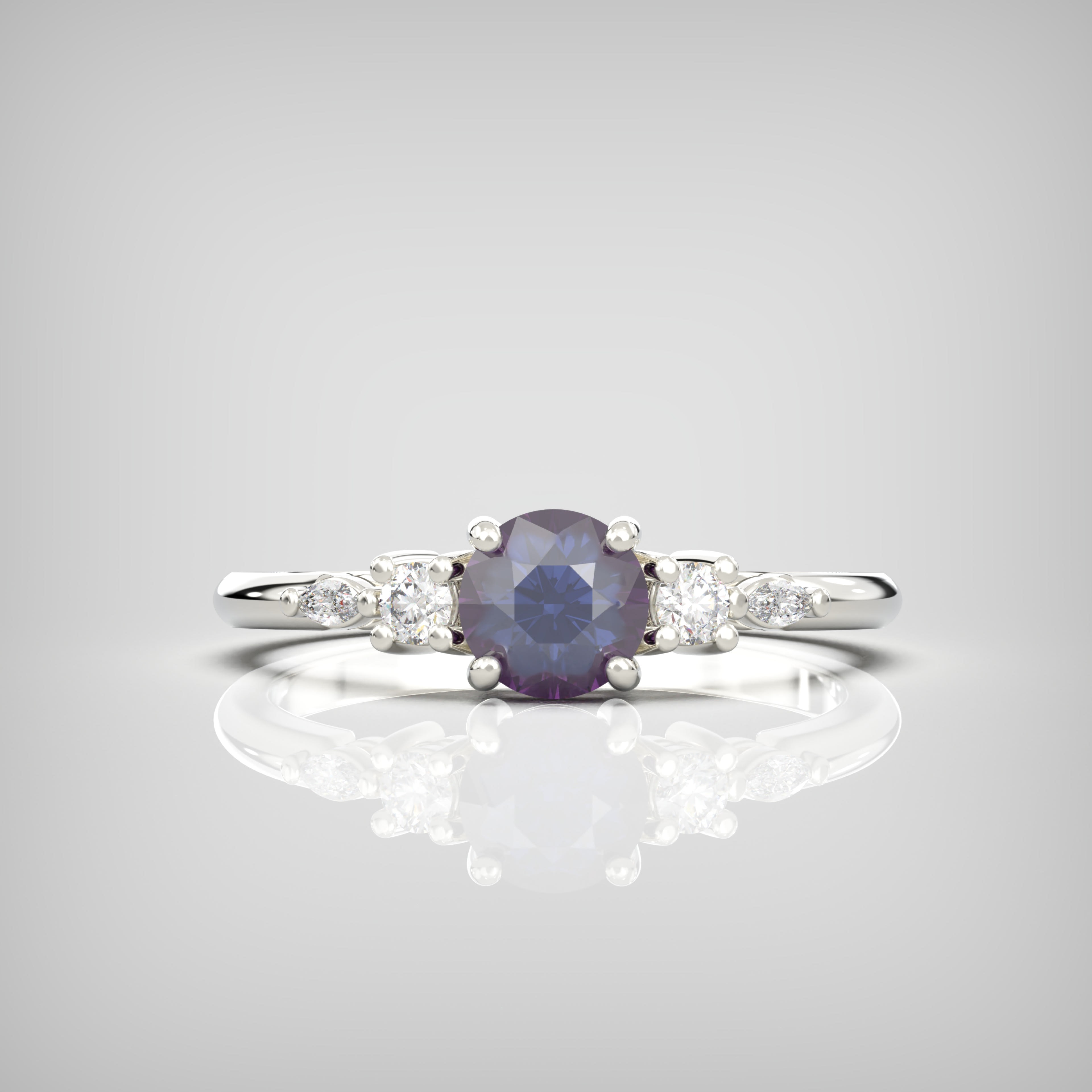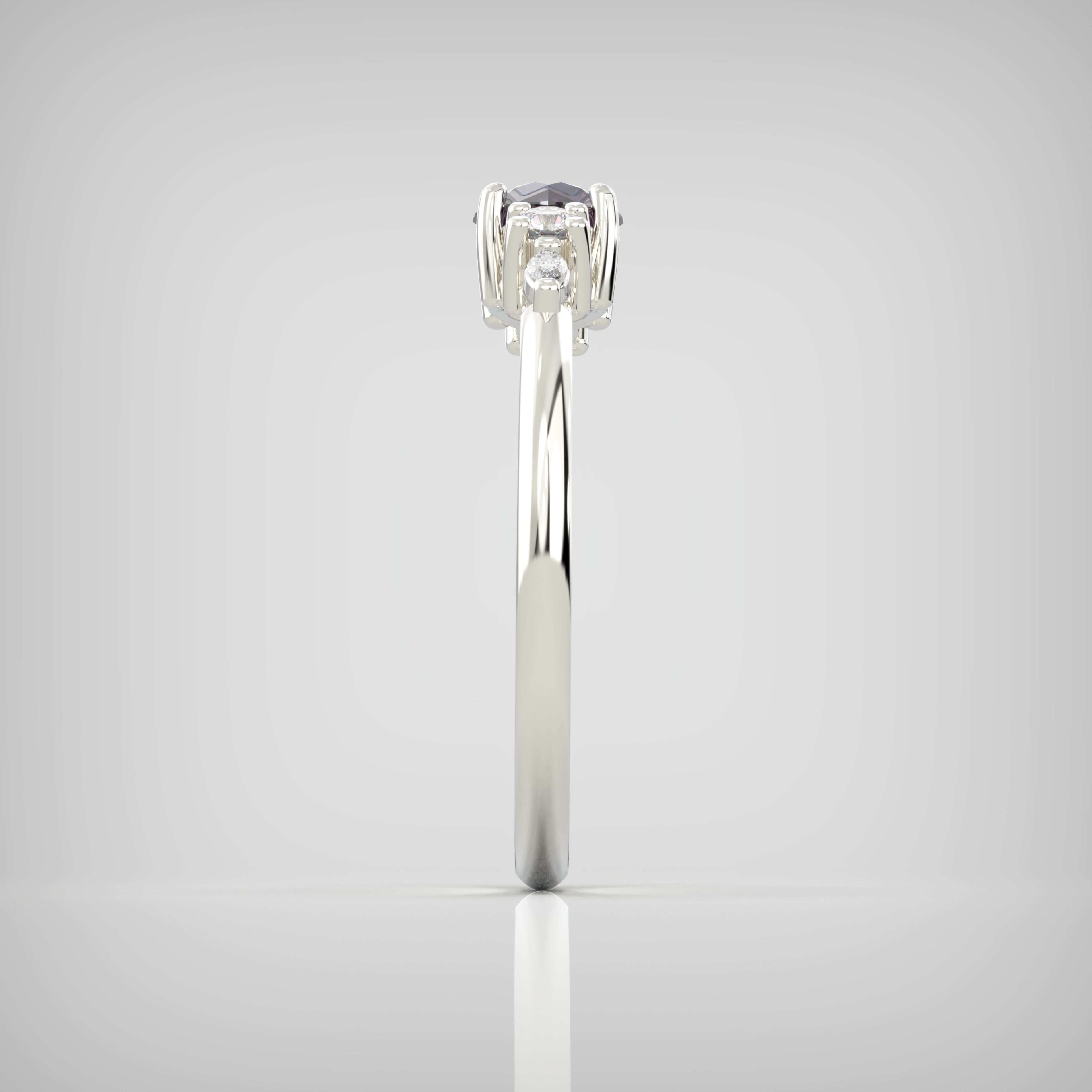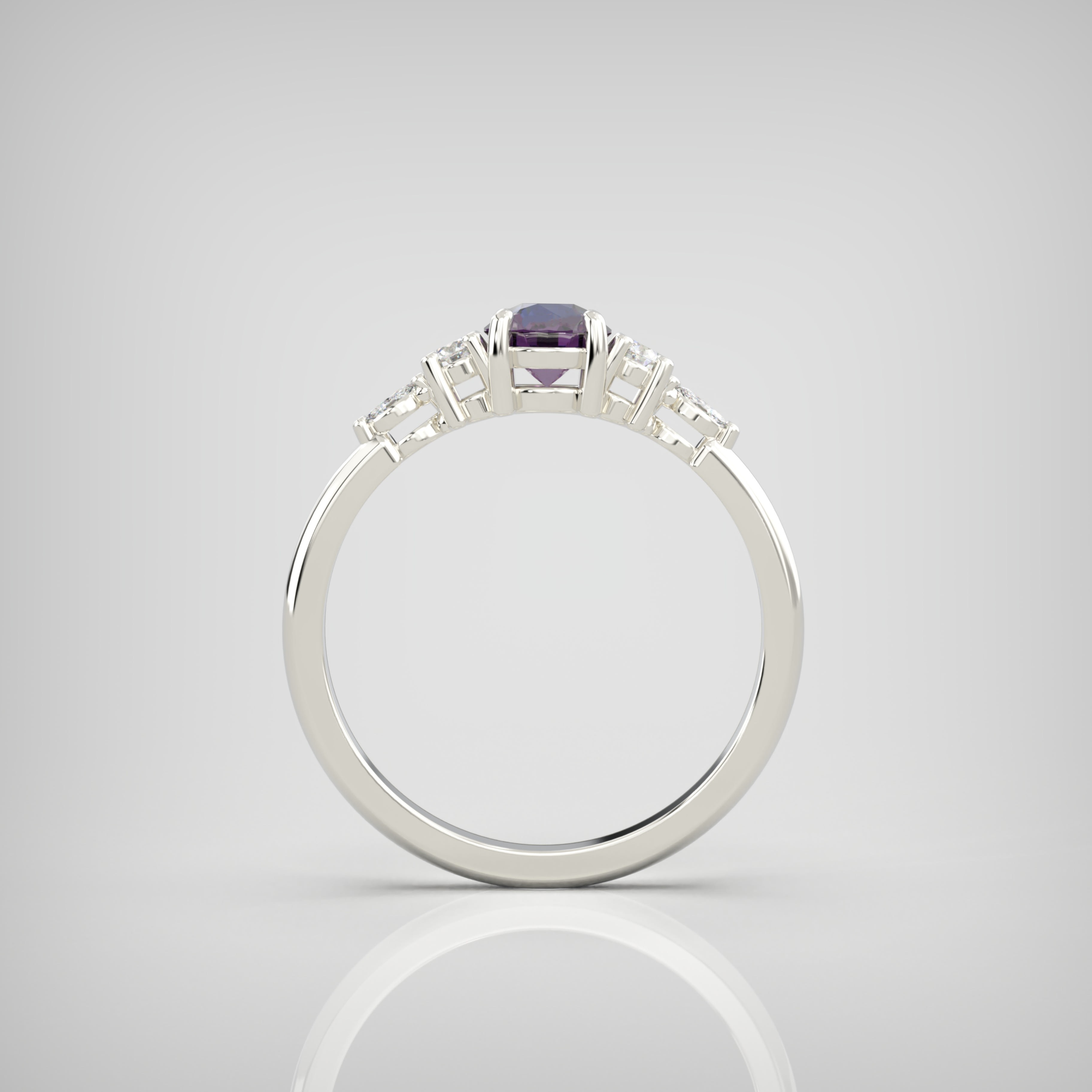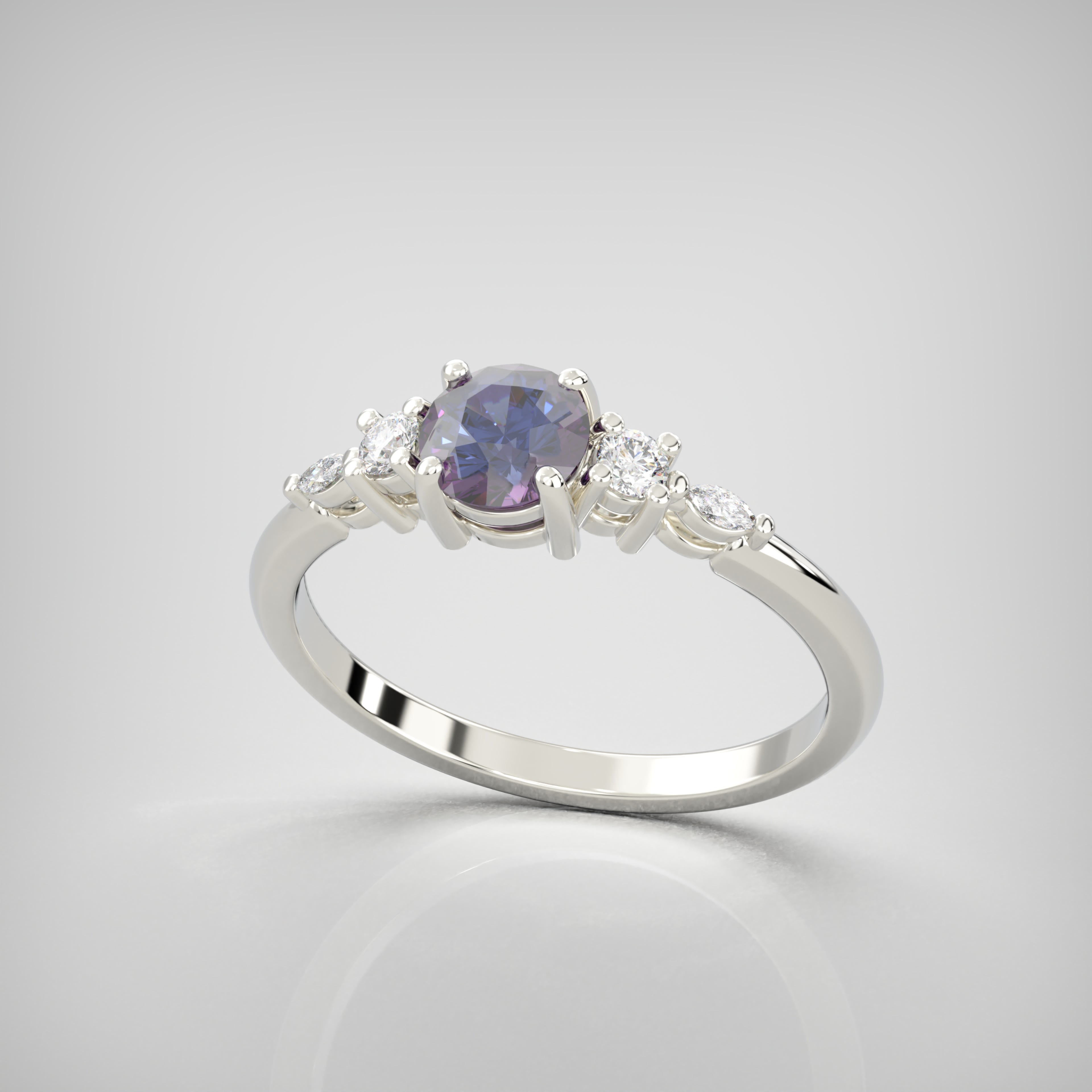 Elegant yet captivating, this platinum ring features a remarkable alexandrite center stone, accented by two round and two marquise white diamonds in a classic, low-profile setting. Known for its dramatic color change—from teal-green in daylight to purplish-red under incandescent light—alexandrite brings a sense of mystery and transformation to this refined design.