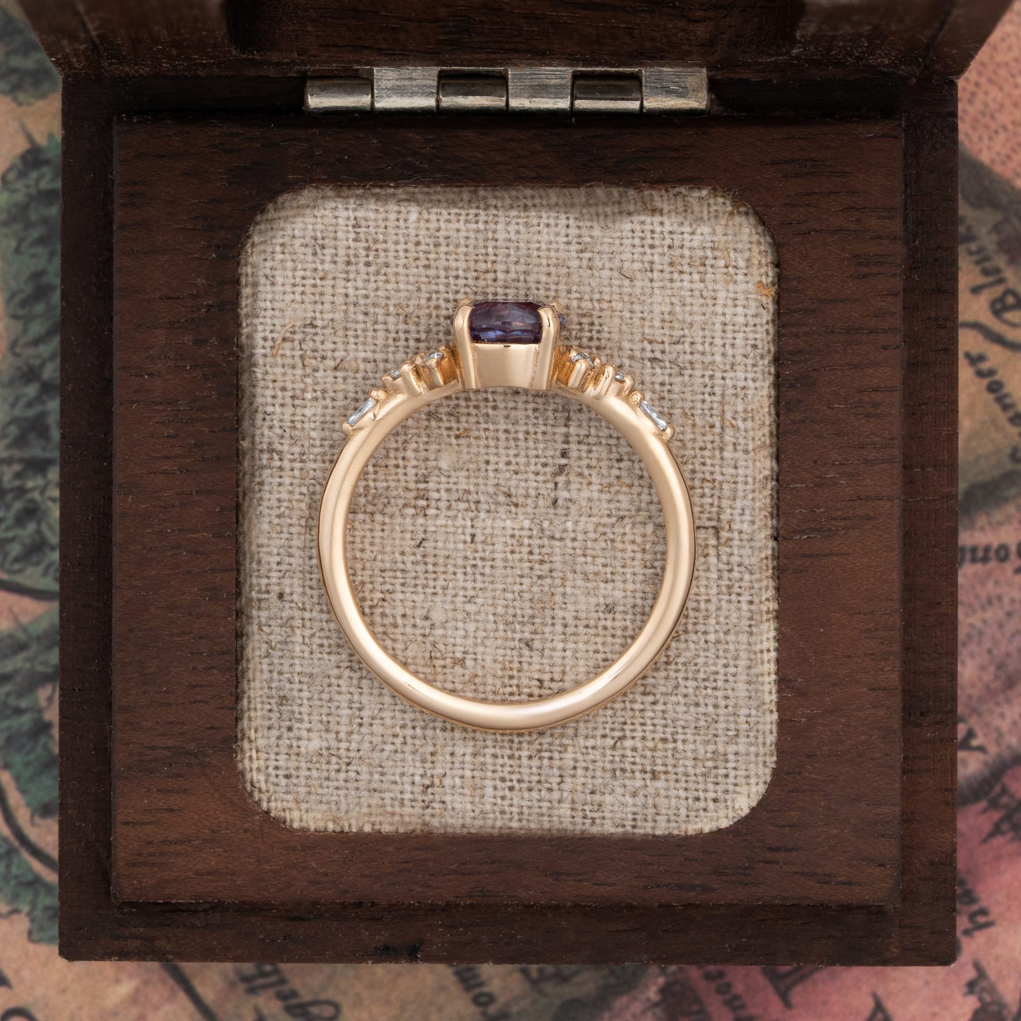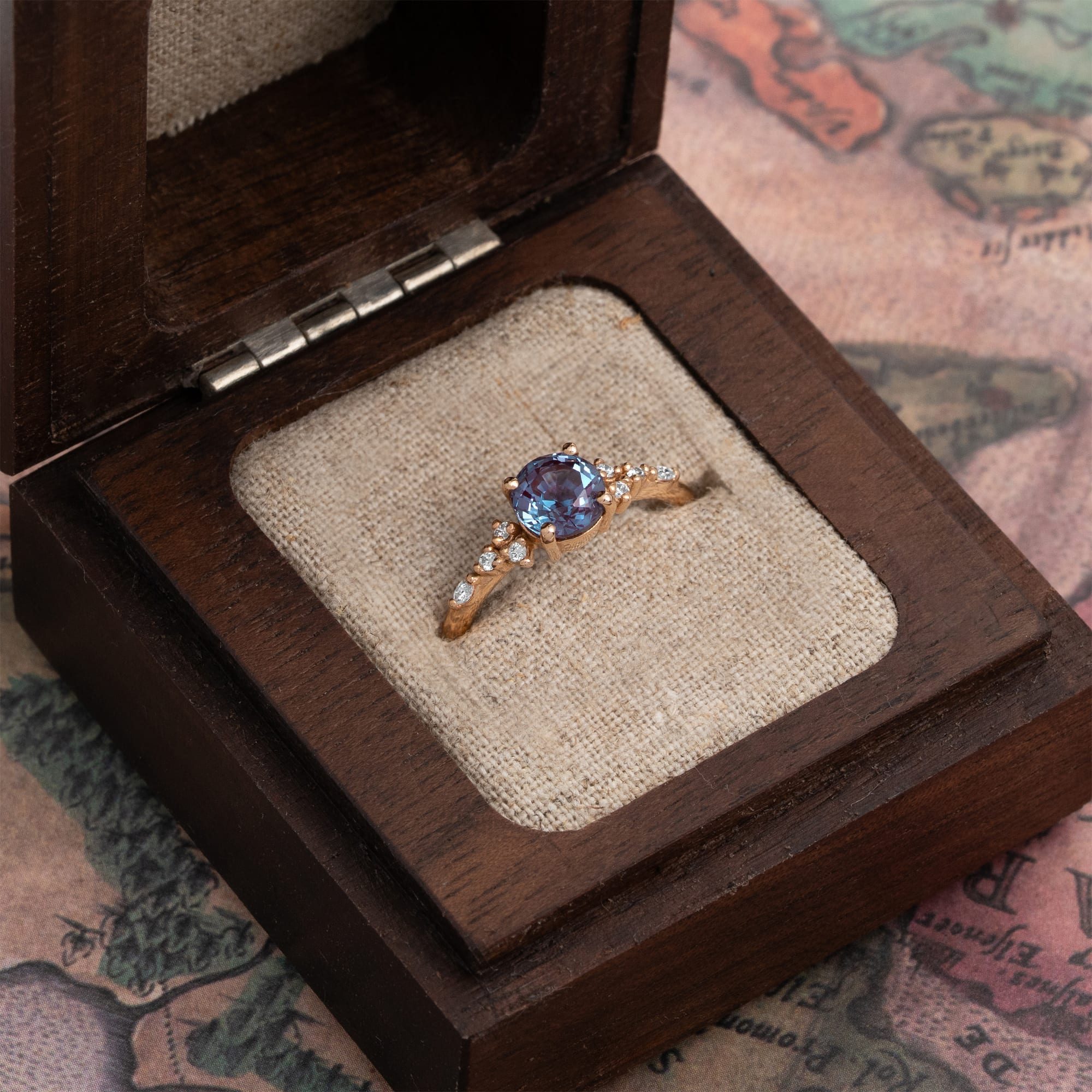 Metal Options: The default metal for this Alexandrite and diamond ring is Rose Gold 18k. Alternative metal choices, including Yellow Gold 14k, White Gold 18k, and Platinum 950, can be selected when adding to the basket.