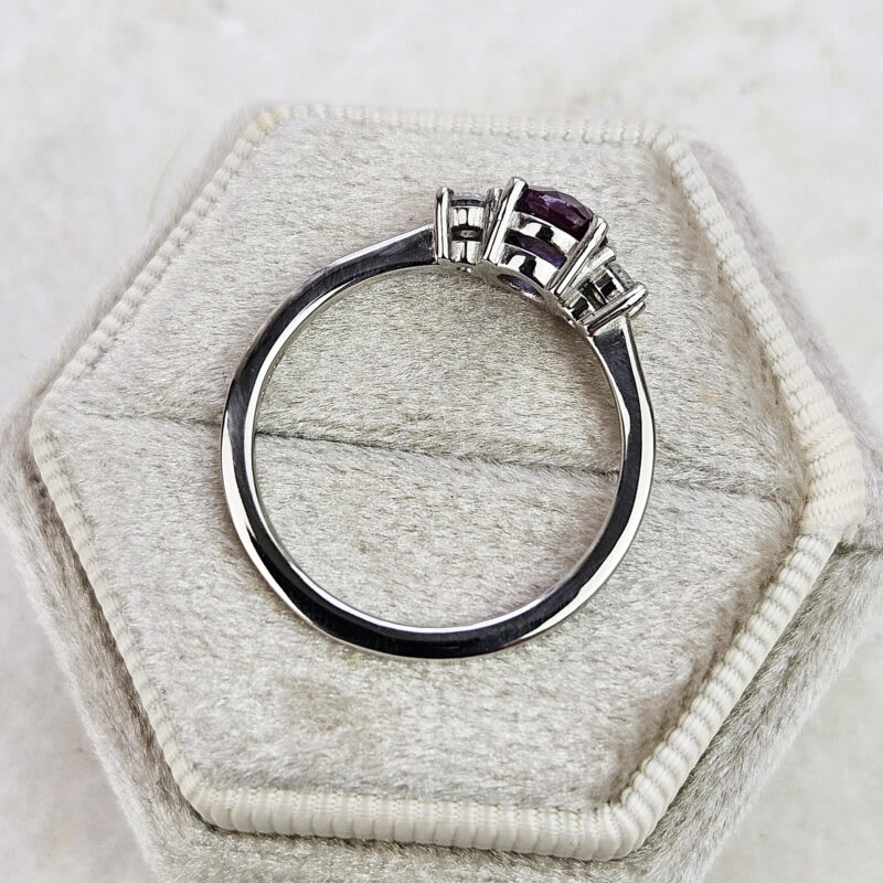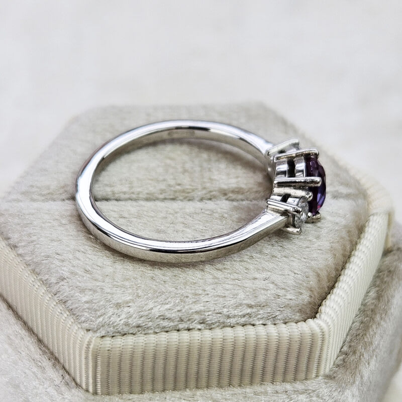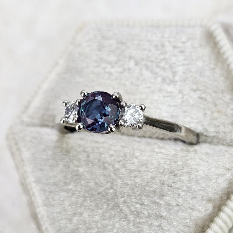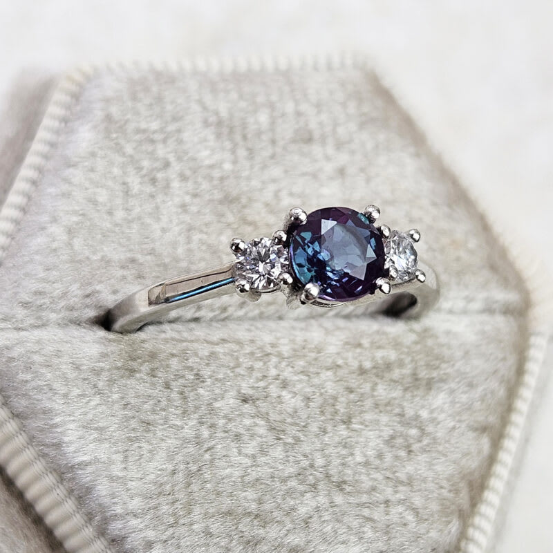 This beautiful ring features a central round cut lab grown Alexandrite, flanked by two brilliant cut lab grown diamonds in a classic low profile platinum setting!