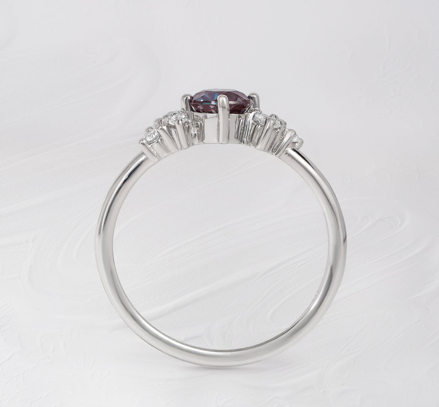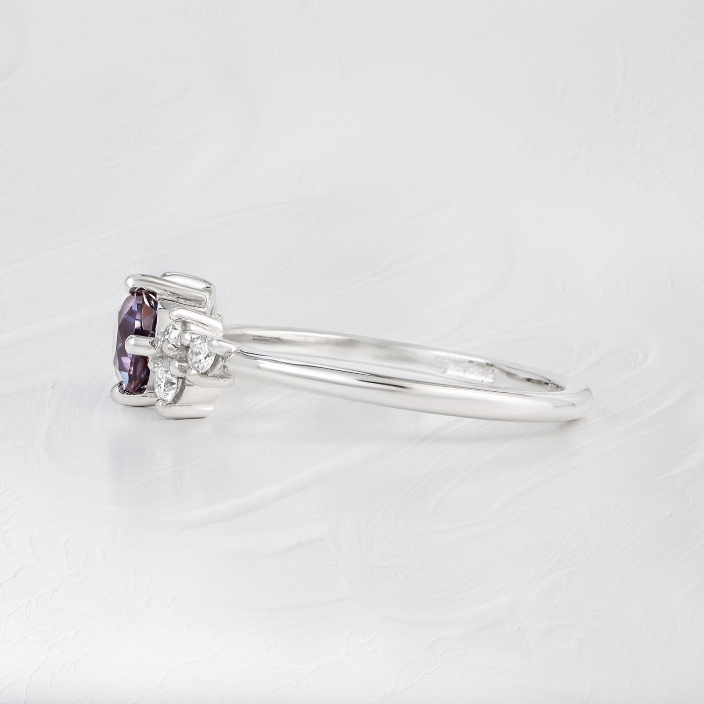 Delicate and timeless, this floral-inspired cluster ring features a vivid lab grown Alexandrite centre stone, encircled by a graceful arrangement of white diamond accents, pictured in platinum.