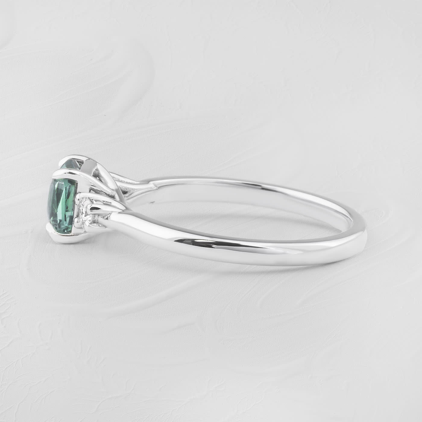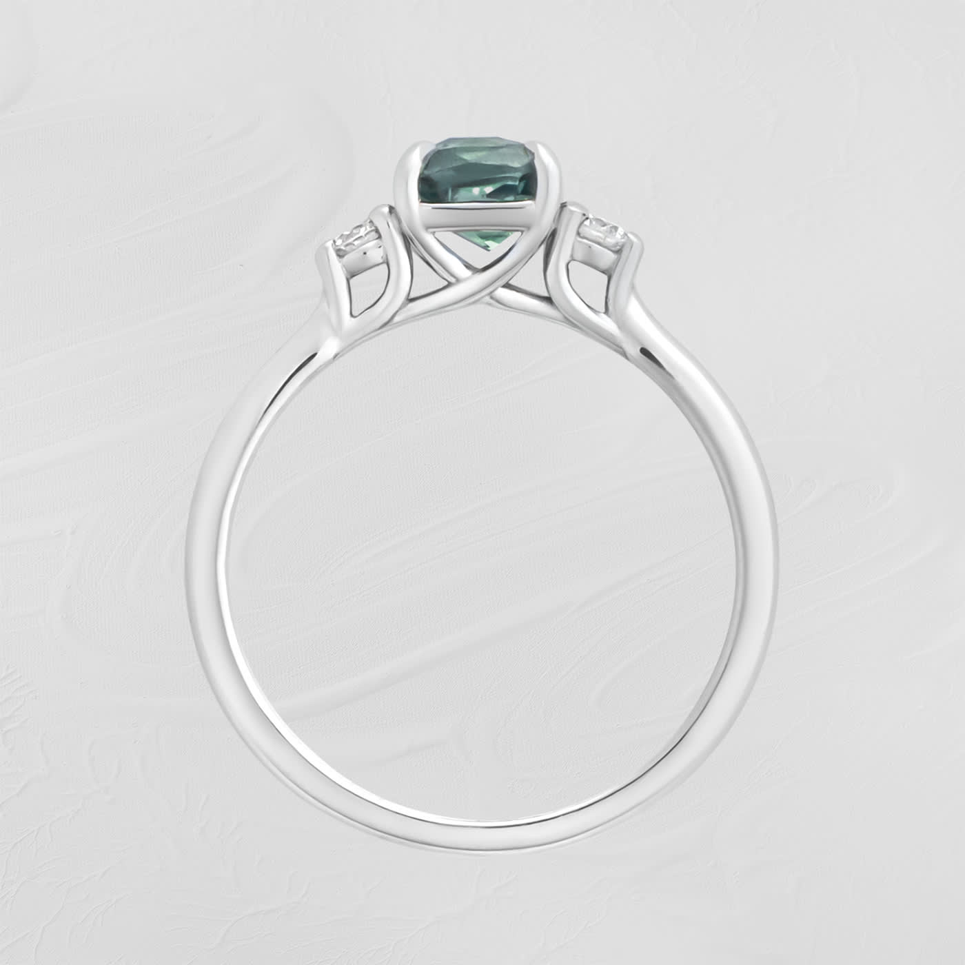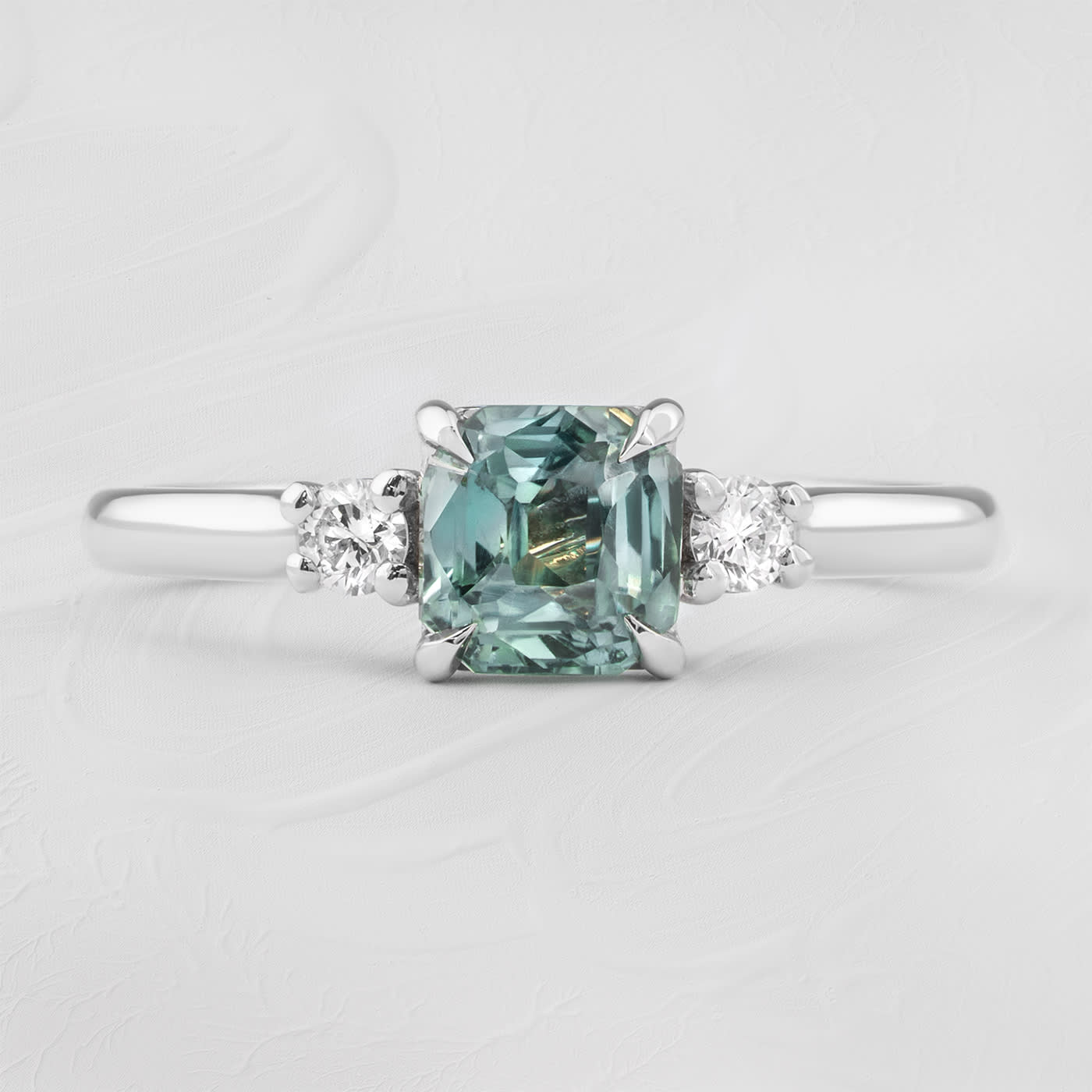 This trilogy engagement ring features a central old-style emerald cut icy teal sapphire, secured by talons in a trellis setting. The central sapphire is flanked by two lab-grown round accent diamonds. The design balances secure stone setting with an elegant profile.