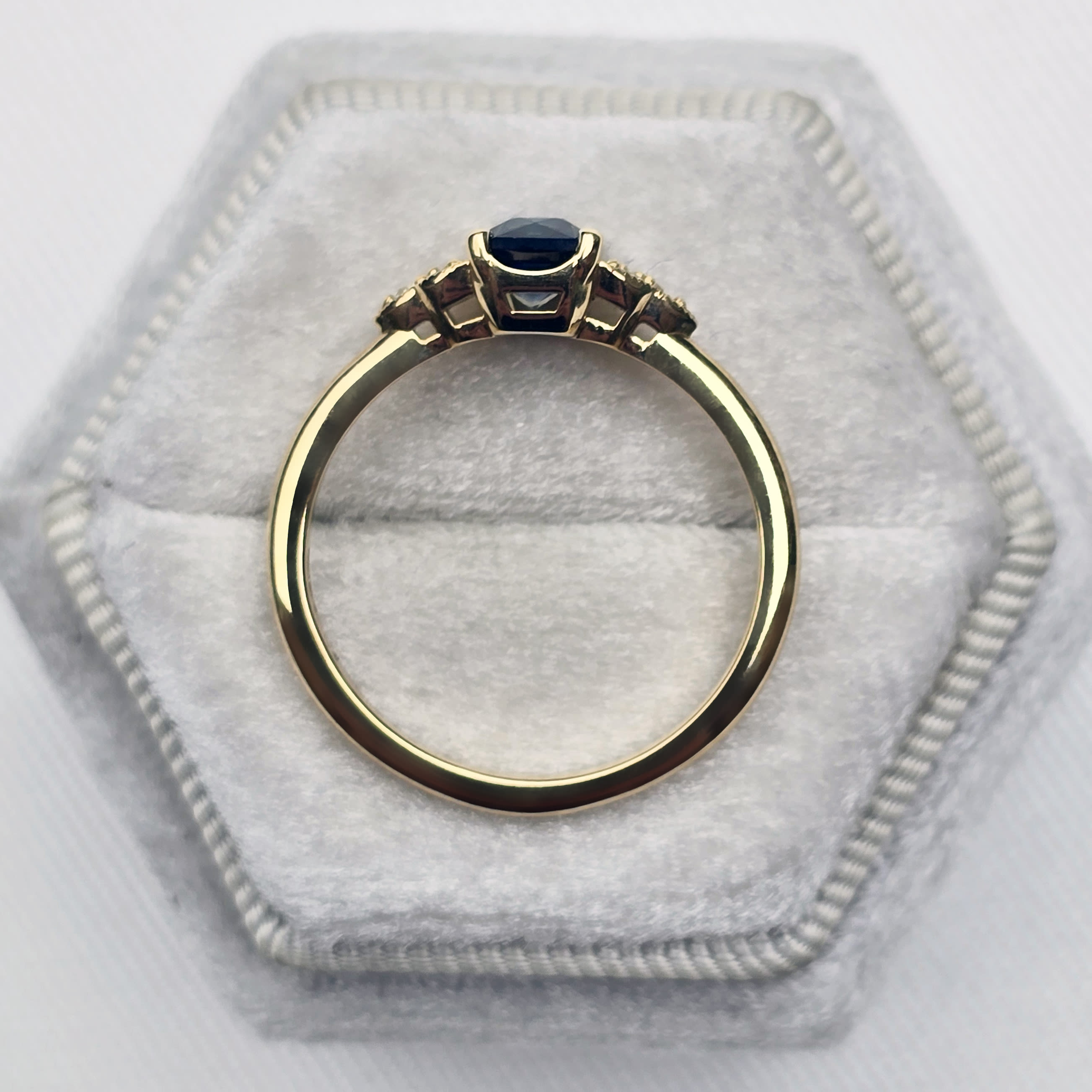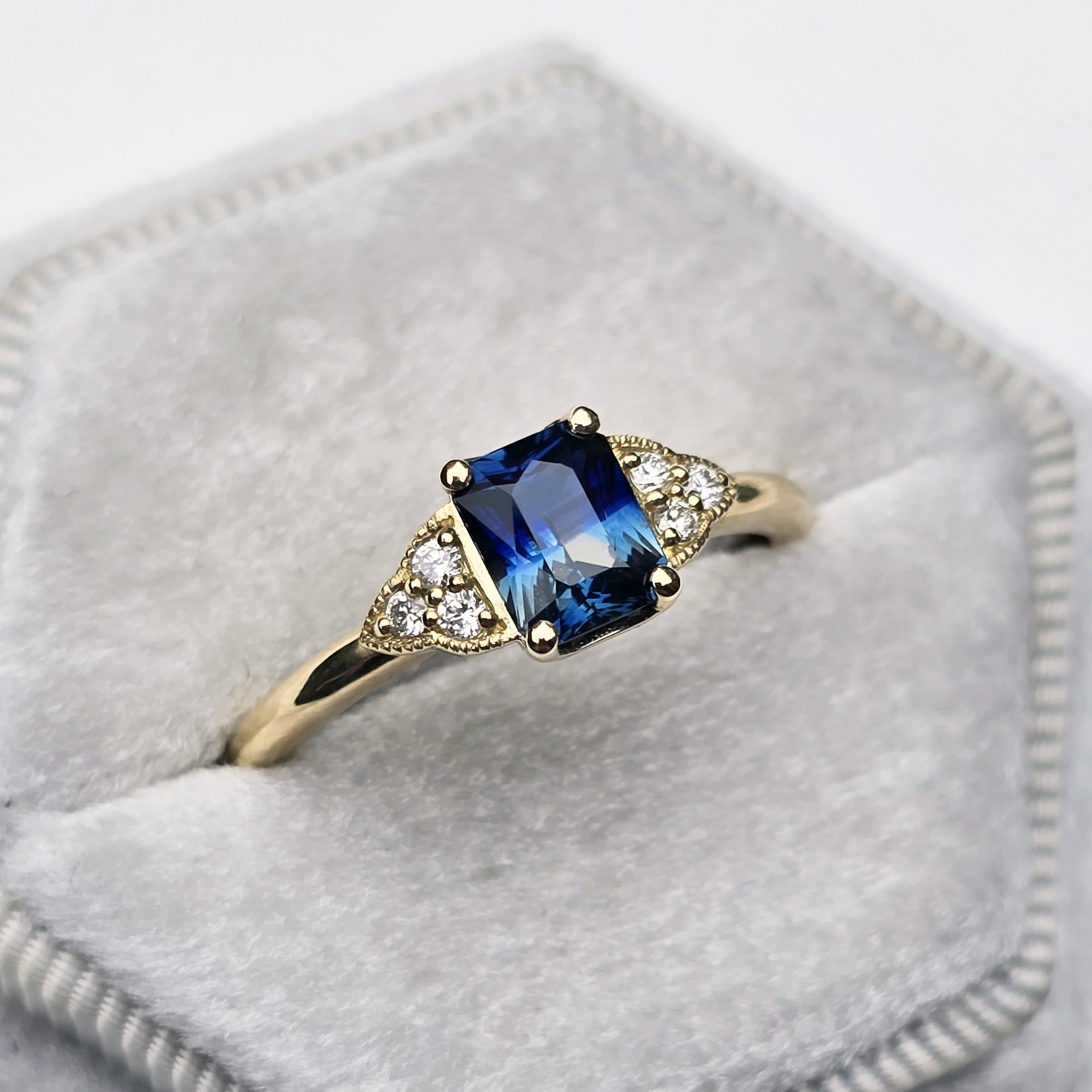 Description: This antique-inspired engagement ring features a natural 1.17ct bi colour Sapphire centre stone in a radiant cut. The setting includes six brilliant cut accent diamonds with a 0.06ct total carat weight, offering an elegant seven-stone configuration. The band has a width of 1.5 mm and is created in 18ct yellow gold, suitable for daily wear.