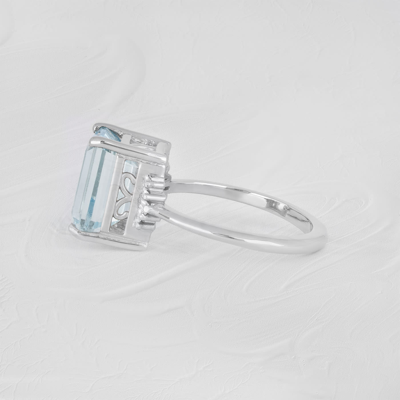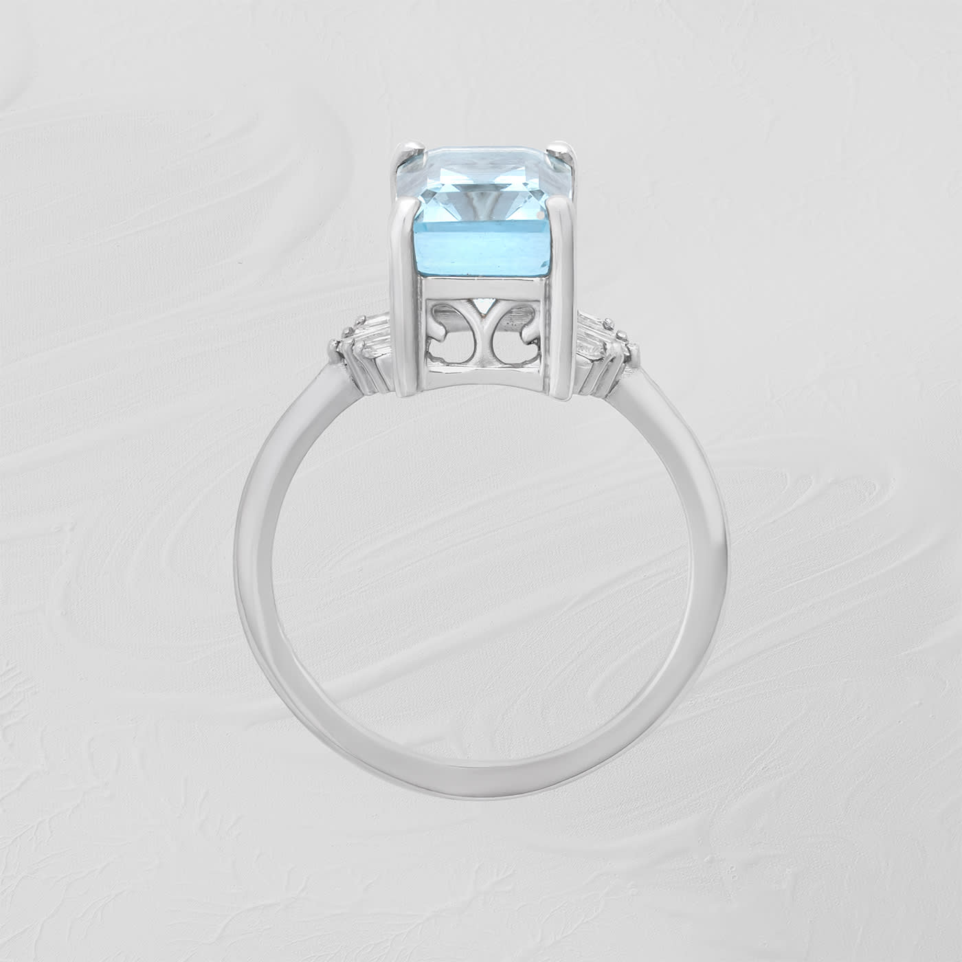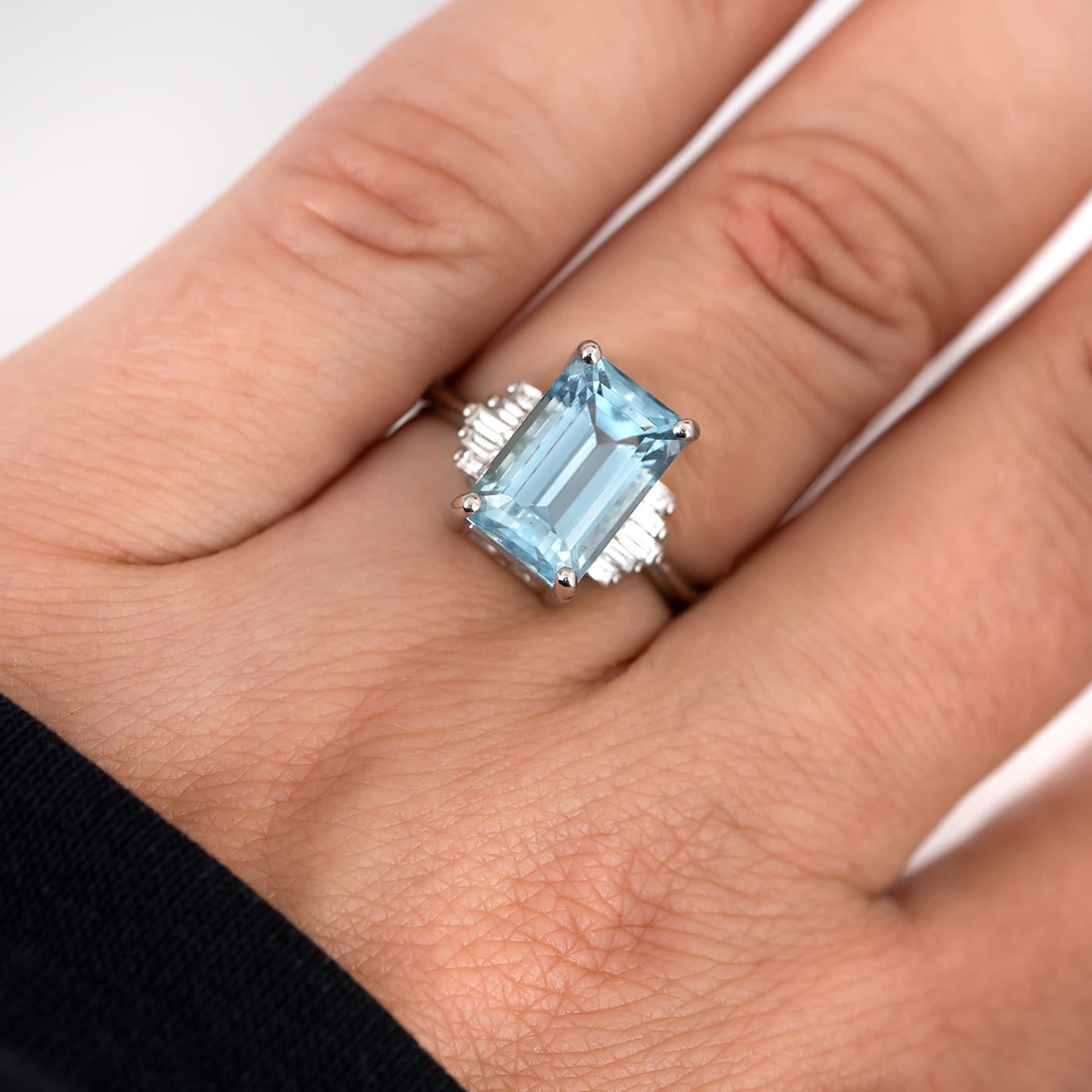 Description: This Aquamarine and diamond engagement ring features a central 4.4-carat emerald cut Aquamarine secured by prong setting. The centre stone is flanked by an Art Deco arrangement of baguette cut white accent diamonds. This fine jewellery piece is crafted entirely in Platinum 950.