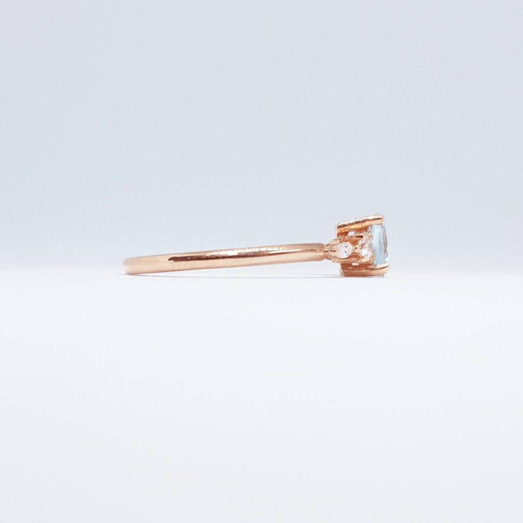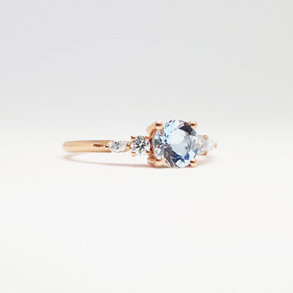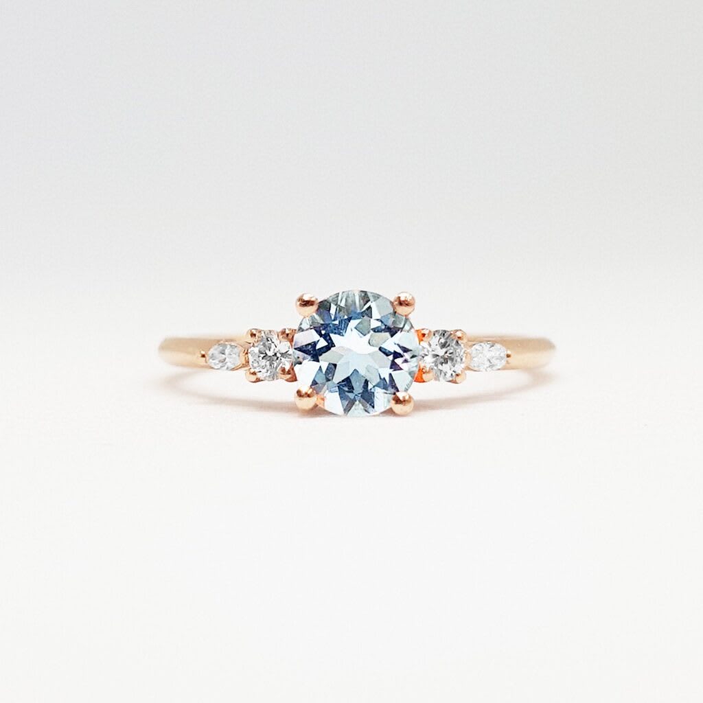 This brand new stunning ring features a central round Aquamarine, set in a stunning antique inspired mount that has been studded with brilliant and marquise cut diamonds!