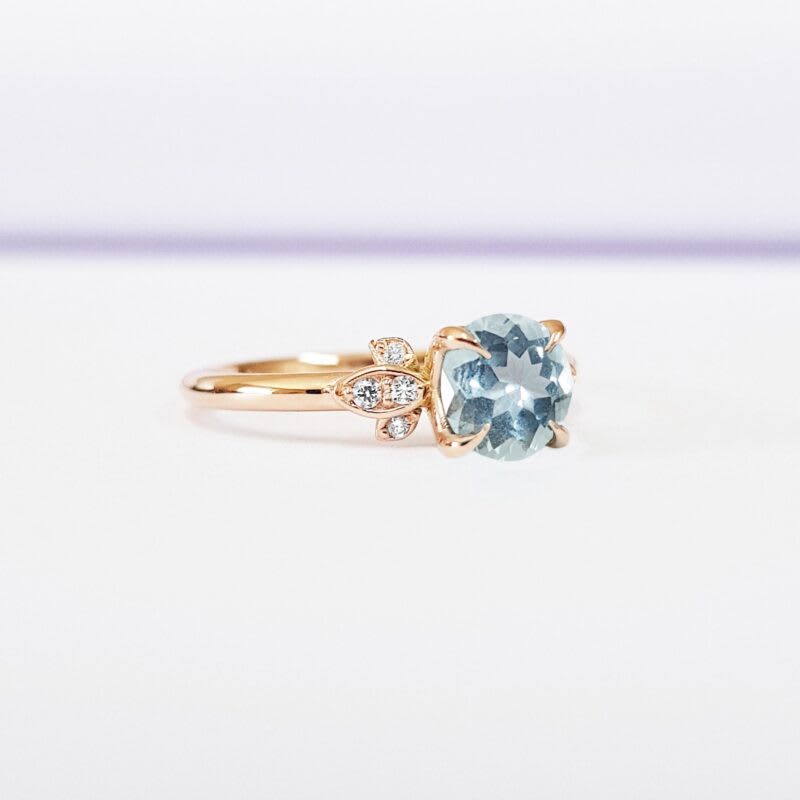 This brand new stunning ring features a central 0.75 carat aquamarine, set in a stunning antique inspired mount that has been studded with brilliant and marquise cut diamonds!