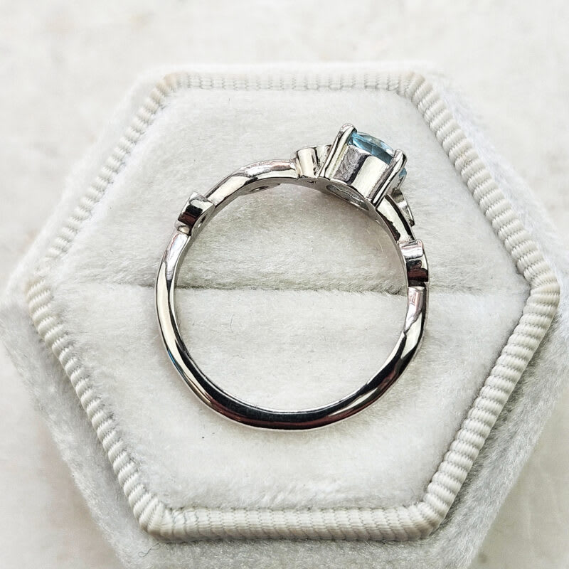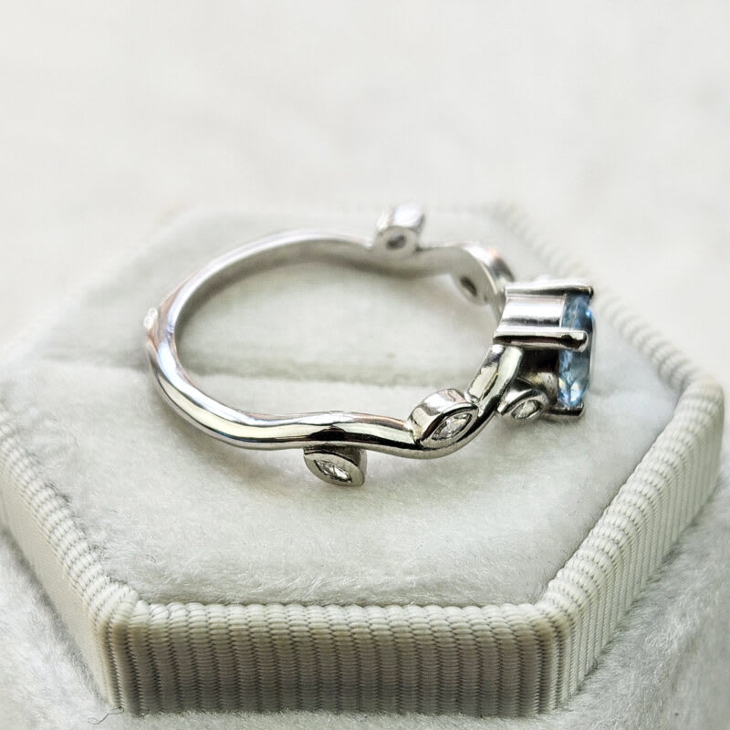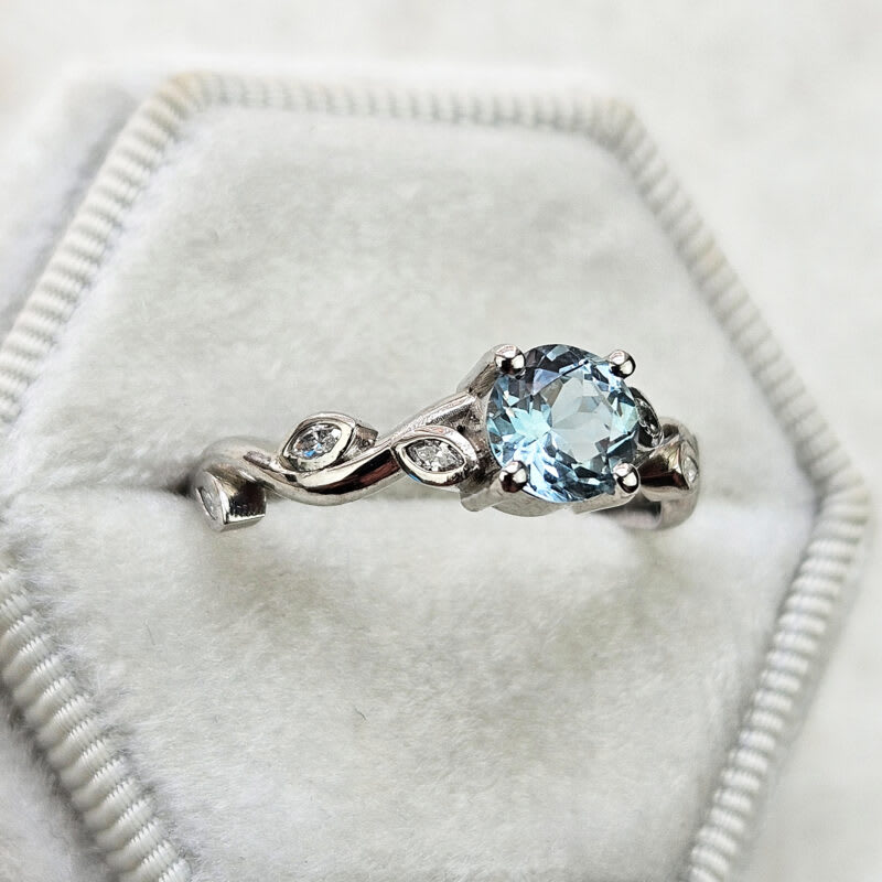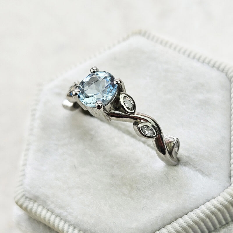 This elegant ring features a central round cut aquamarine, that has been 4 prong set in a classic basket setting. The weaving band of the ring has been adorned with rubover-set marquise cut diamonds to resemble leaves on a vine!