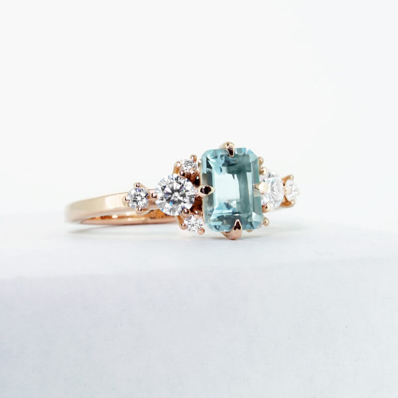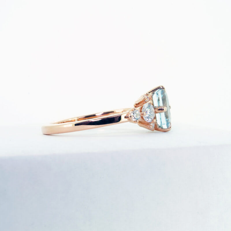 This brand new stunning ring features a central 1 carat emerald cut aquamarine, claw set in a stunning amtoqie inspired mount that has been set with a further 8 brilliant cut moissanites! Center Aquamarine: 1 carat, AAA quality, 7x5mm Accent Moissanites: 0.4 carats total, D/E/F colour, VVS clarity Band thickness: 1.5 mm Metal: Gold or Platinum