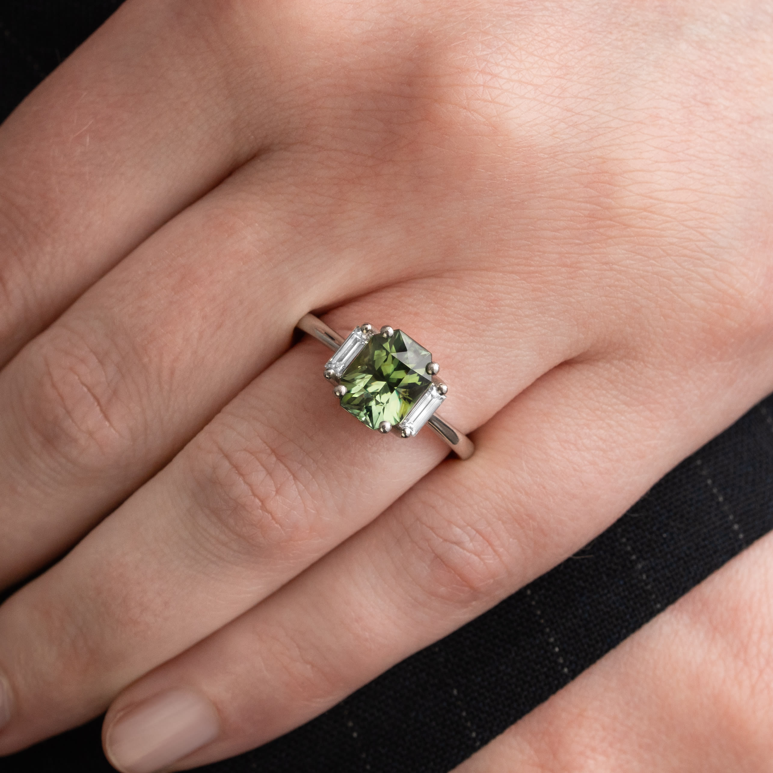Description: This art deco inspired fine jewellery engagement ring features a 3.20 carat radiant cut natural green sapphire centre stone, prong set in a classic 1920s style mount. The sapphire is accented by two baguette cut lab grown diamonds on either side. The ring has a band thickness of 1.7 mm.