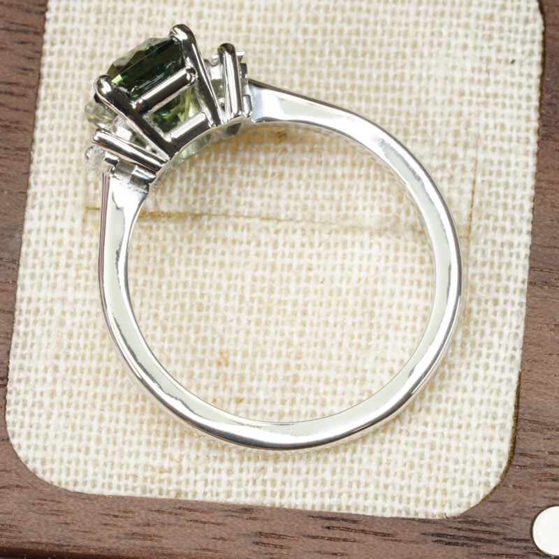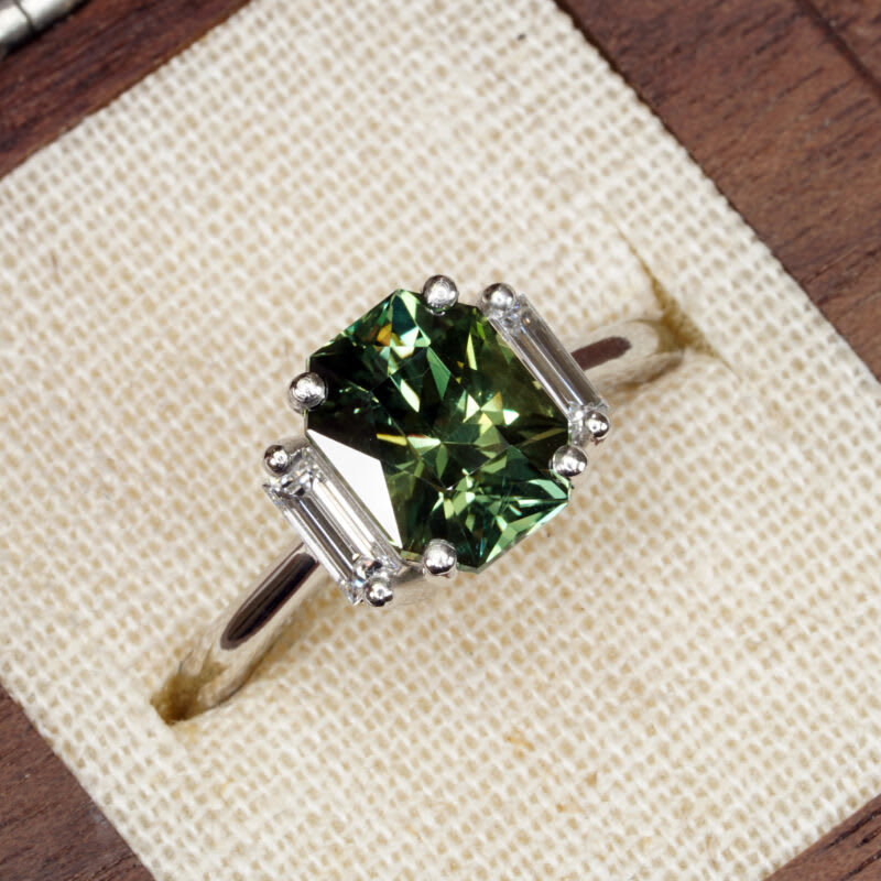 This brand new ring features a mesmerizing radiant cut natural green sapphire, that has been prong set with two baguette cut lab grown diamonds, in a classic 1920s style mount!