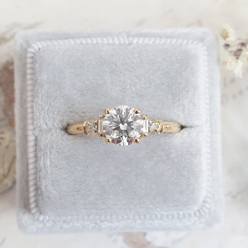 This brand new ring features a central 1 carat round brilliant cut lab grown diamond, that has been set with geometrically contrasting baguette and round cut accent diamonds to give a distinct 1920s feel.
