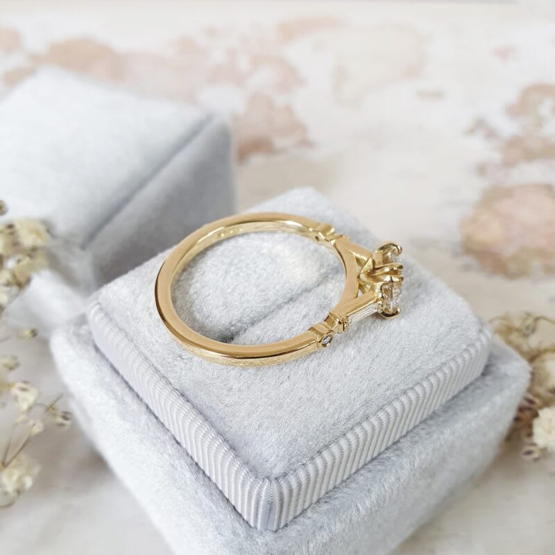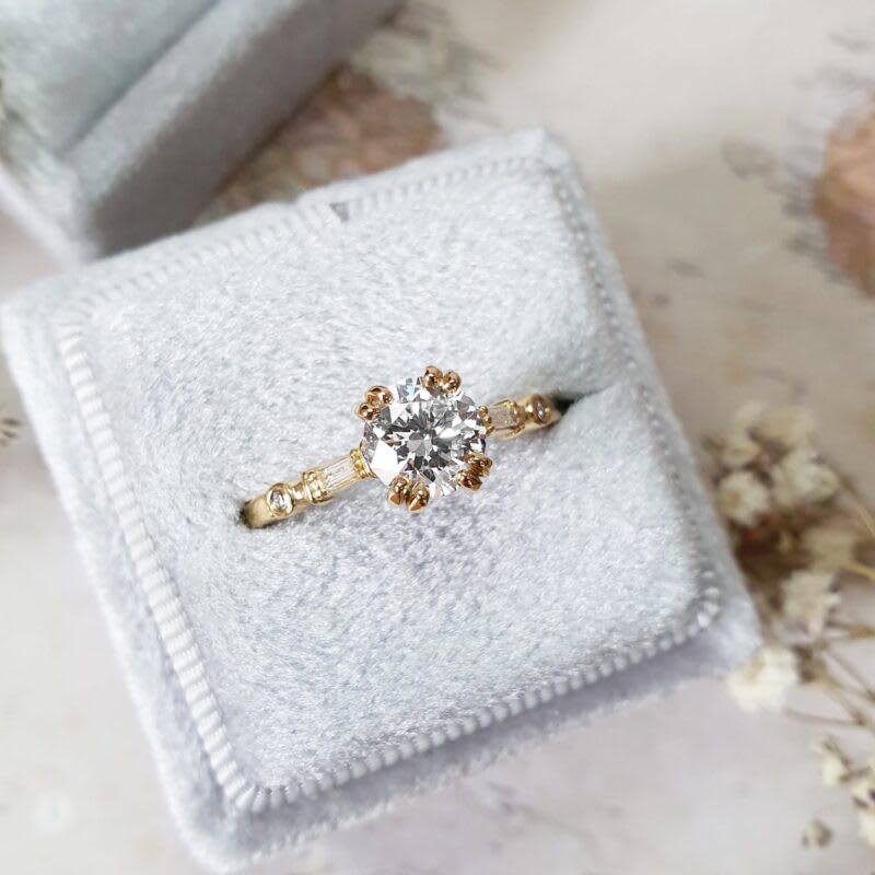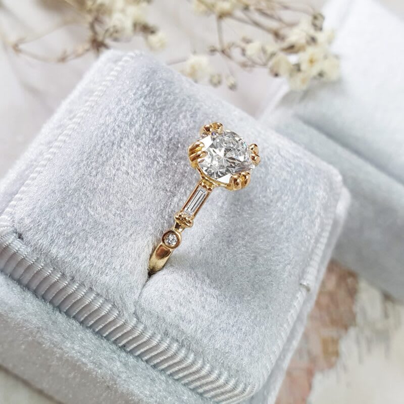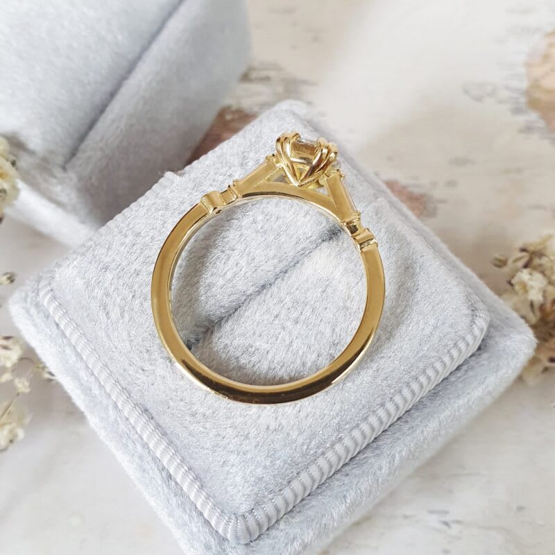 This brand new ring features a central 1 carat round brilliant cut lab grown diamond, that has been double prong set with geometrically contrasting baguette and round cut accent diamonds to give a distinct 1920s feel. Center Diamond: 1 carat, E colour, VS1 clarity, with IGI certification Accent lab diamonds: 0.1 carats total, VVS clarity, E/F colour Band thickness: 1.8 mm Metal: 18ct yellow gold