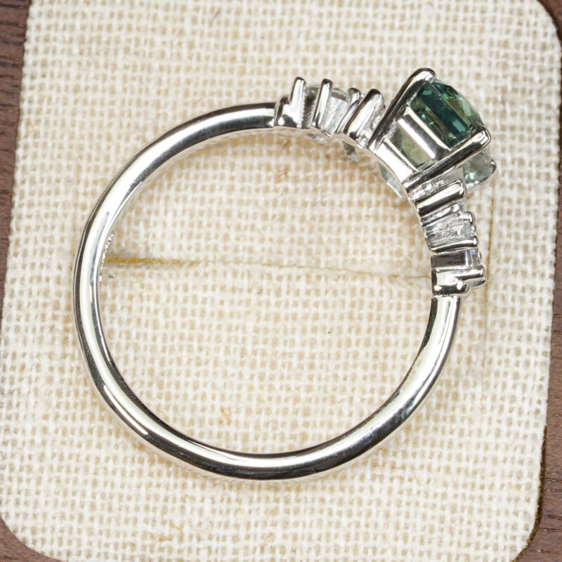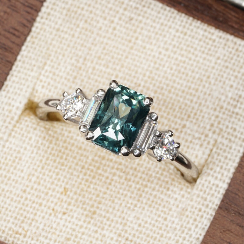 This brand new ring features a central 2.08ct carat natural radiant cut teal sapphire, that has been set with geometrically contrasting 2 baguette lab grown diamonds and 2 further round cut accent sapphires to give a distinct 1920s feel.