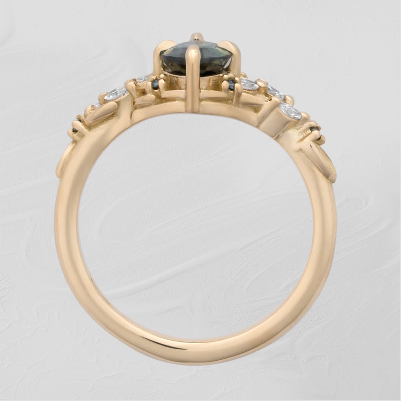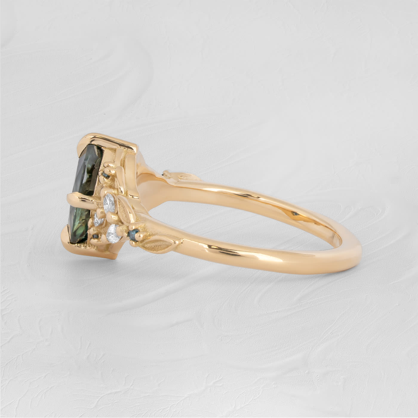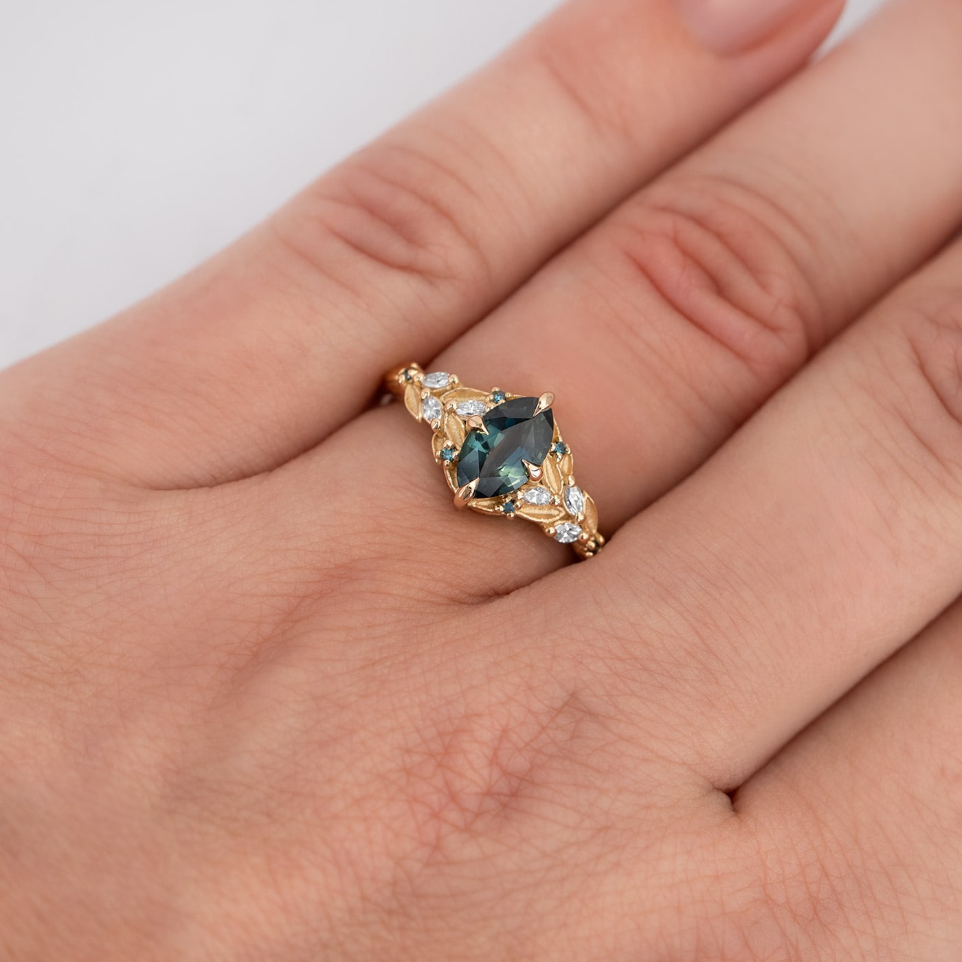 This beautiful new ring features a central marquise cut Australian sapphire. It has been set with accent teal and white lab grown diamonds, with accent leaf detailing, all in 18ct yellow gold