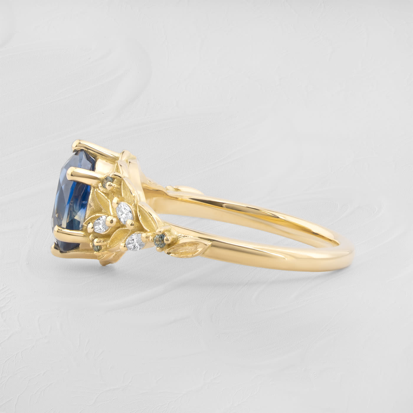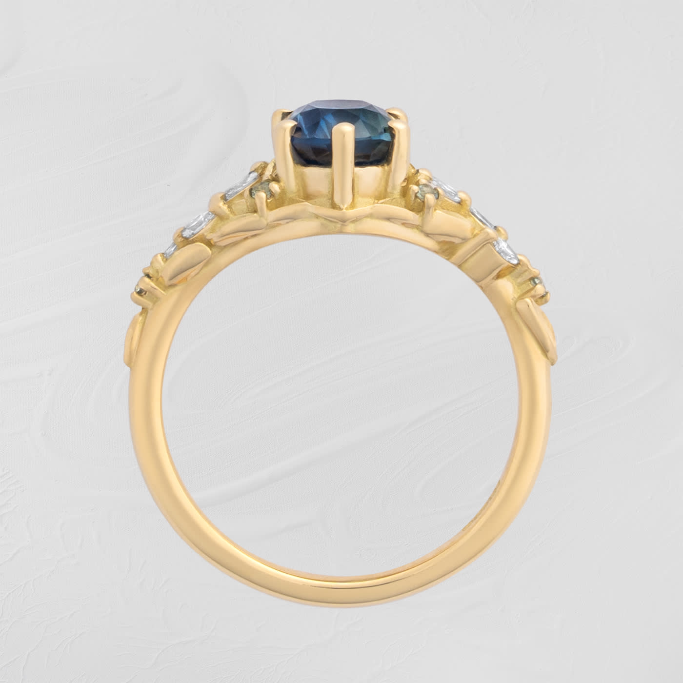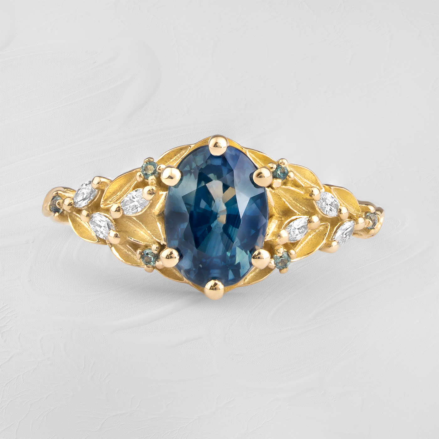 This oval teal sapphire and diamond ring features a natural sapphire of 1.94ct as the center stone. The fine jewellery engagement ring is crafted in 18ct yellow gold and includes accent leaf detailing. Accent stones include six marquise-cut diamonds and six round-cut teal sapphires totalling 0.15ct.