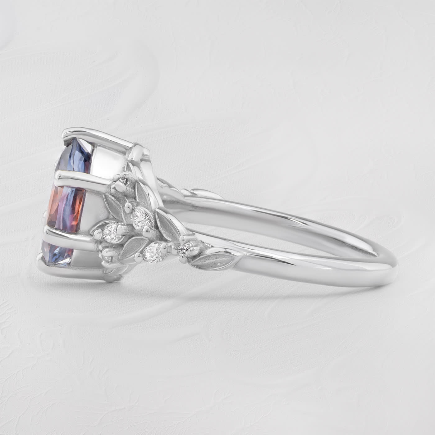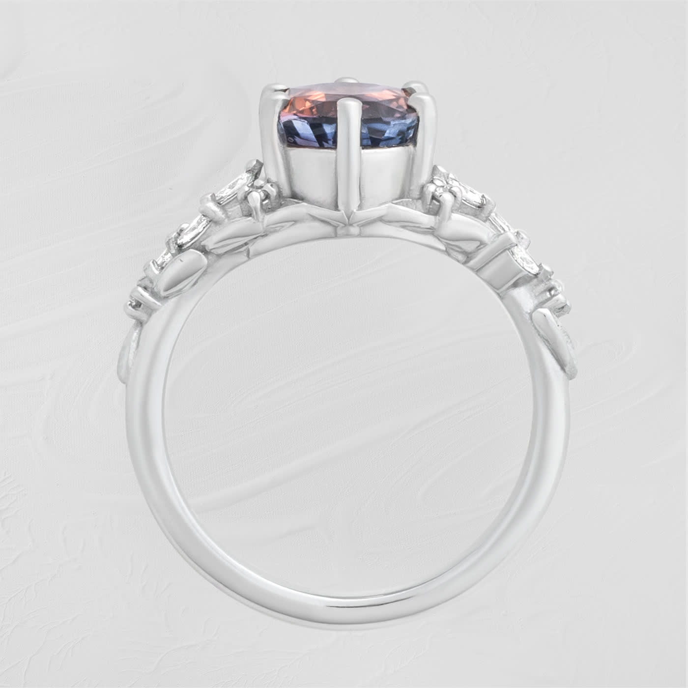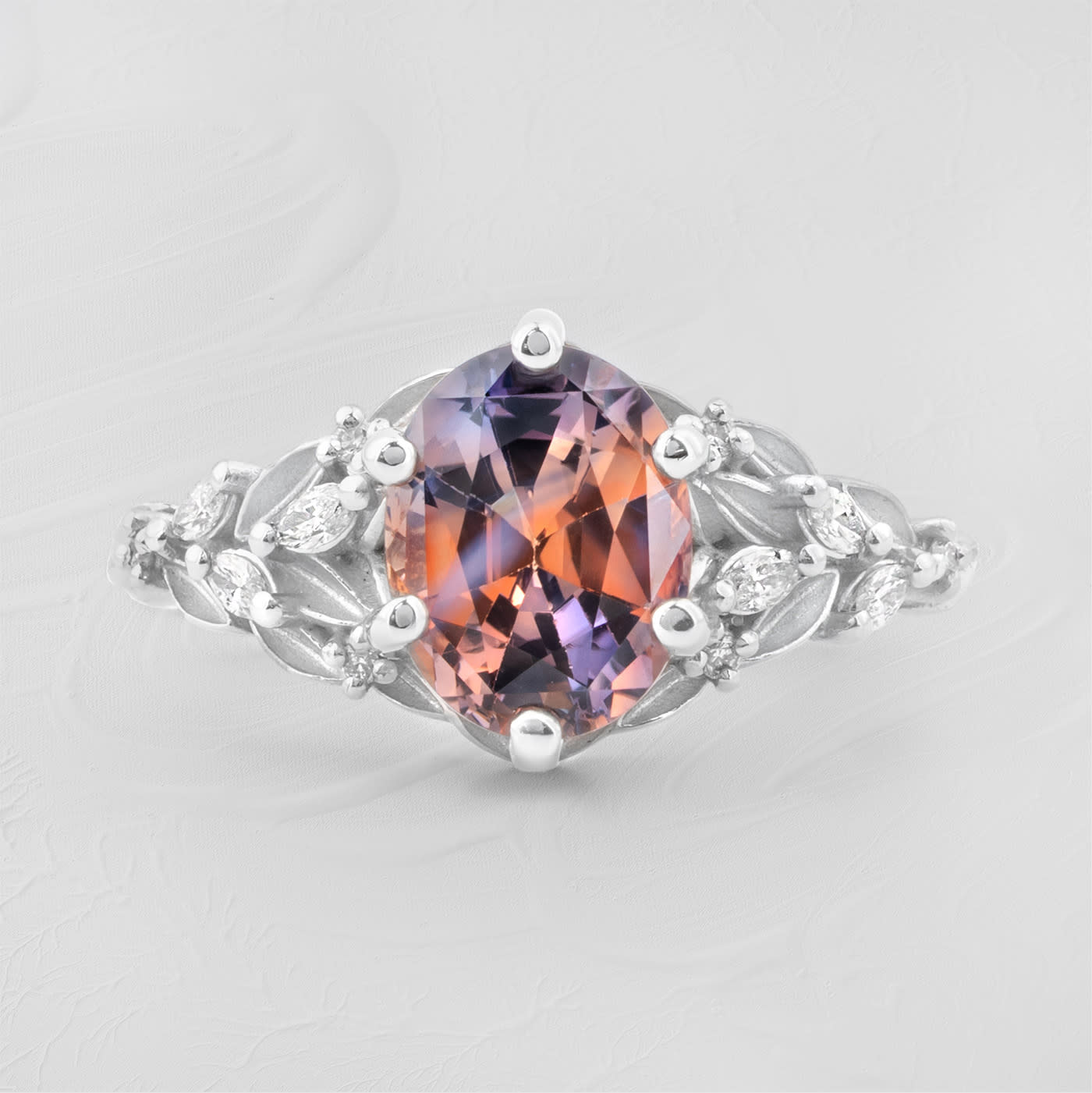 This unique sapphire and diamond ring features a one of a kind sapphire. This sapphire displays intense hues of orange, purple and pink. We have never seen anything quite like it and we probably won't see anything like it again. The fine jewellery engagement ring is crafted in platinum and includes accent leaf detailing. Accent stones include six marquise-cut and six round-cut lab grown diamonds totalling 0.15ct.