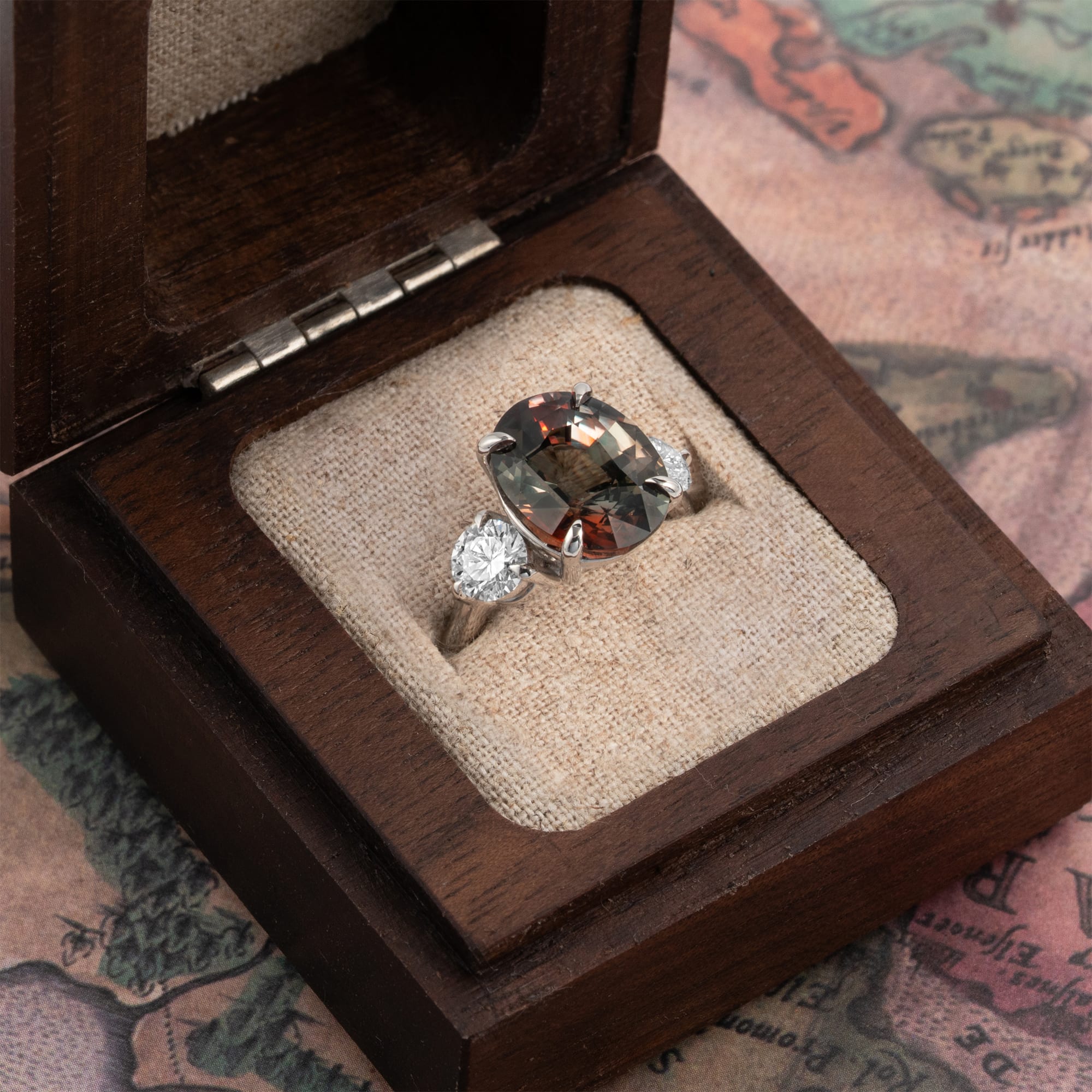 Description: This trilogy engagement ring features an 8ct natural oval parti sapphire centre stone, flanked by two 0.5ct lab-grown round diamonds totaling 1.05ct. The central gemstone measures 12.9x10mm and is set in a sleek platinum 950 setting. This fine jewellery piece is structurally designed as a trilogy setting, balancing the three stones securely on the band.