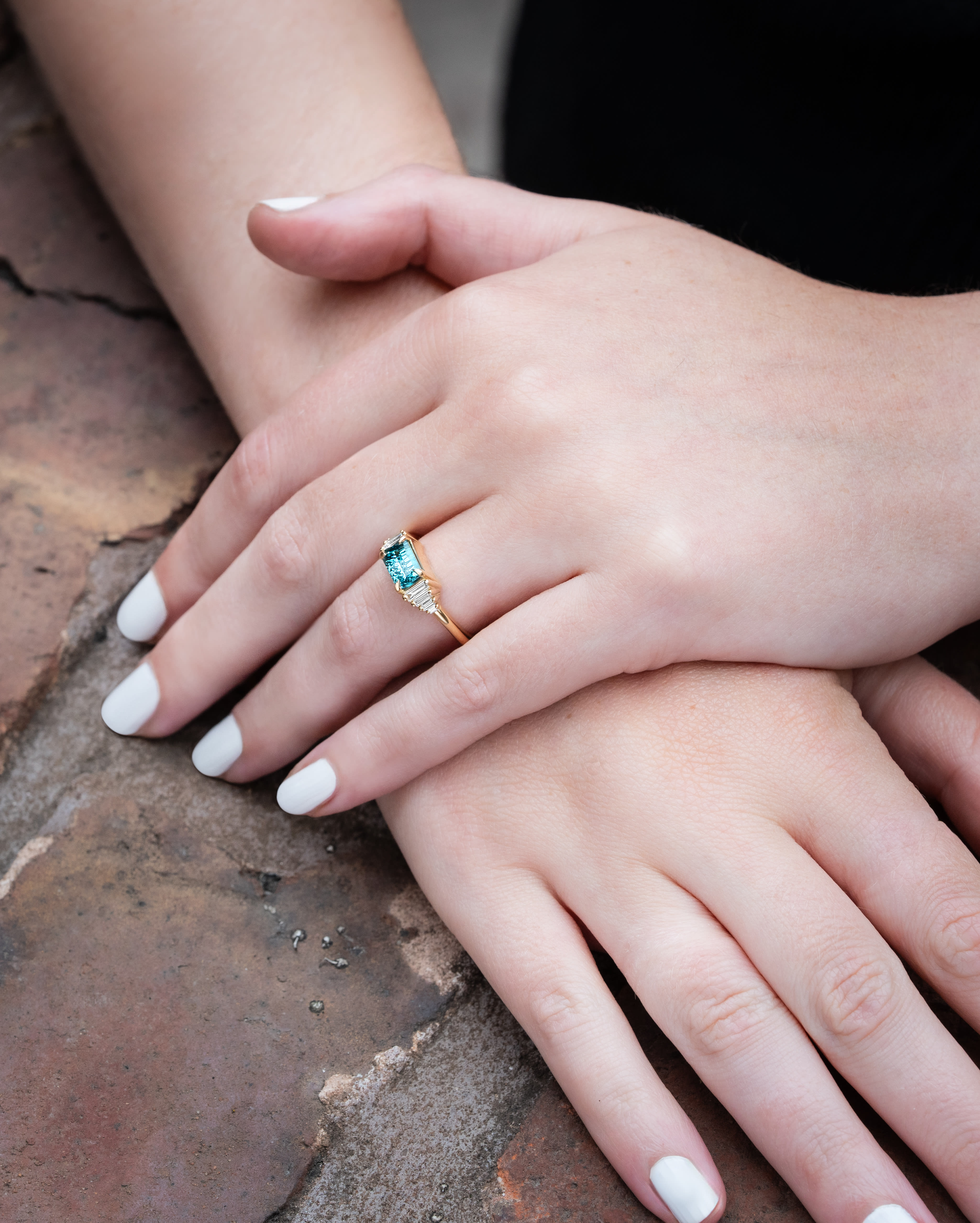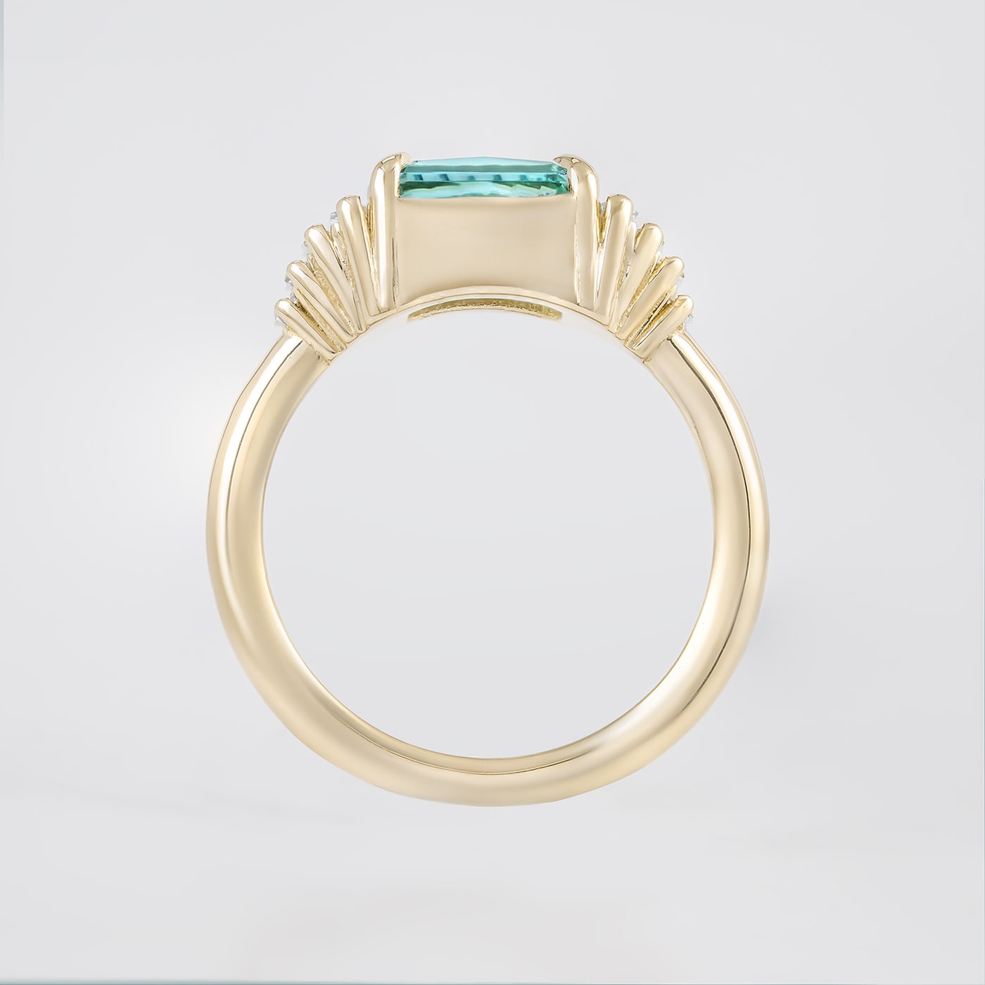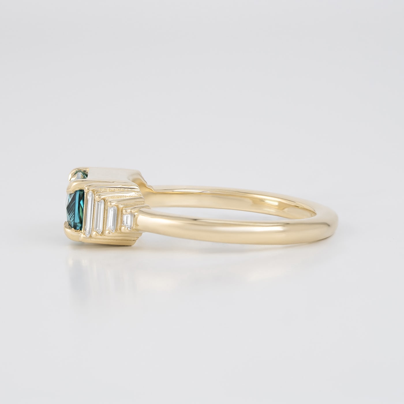 Cut by master lapidary Ramon Tesoro in Italy, this electric blue Tourmaline, sourced from Mozambique, features 44 ultra-precise facets and concave pavilion cuts. Set with graduating lab grown baguette diamonds, the ring exudes a classic 1920s art deco vibe, all in 18ct yellow gold!