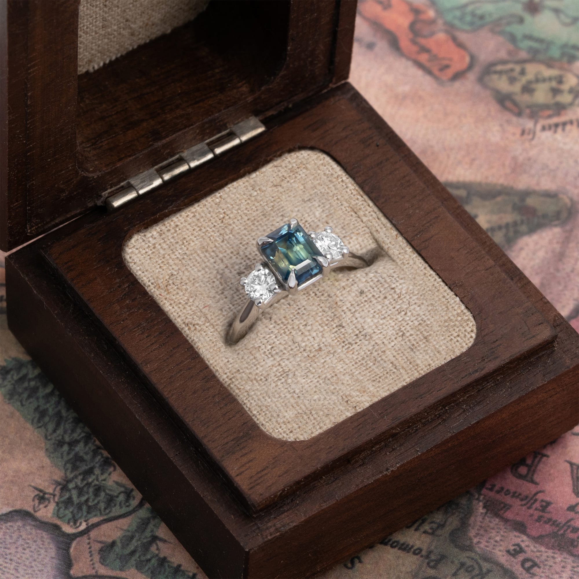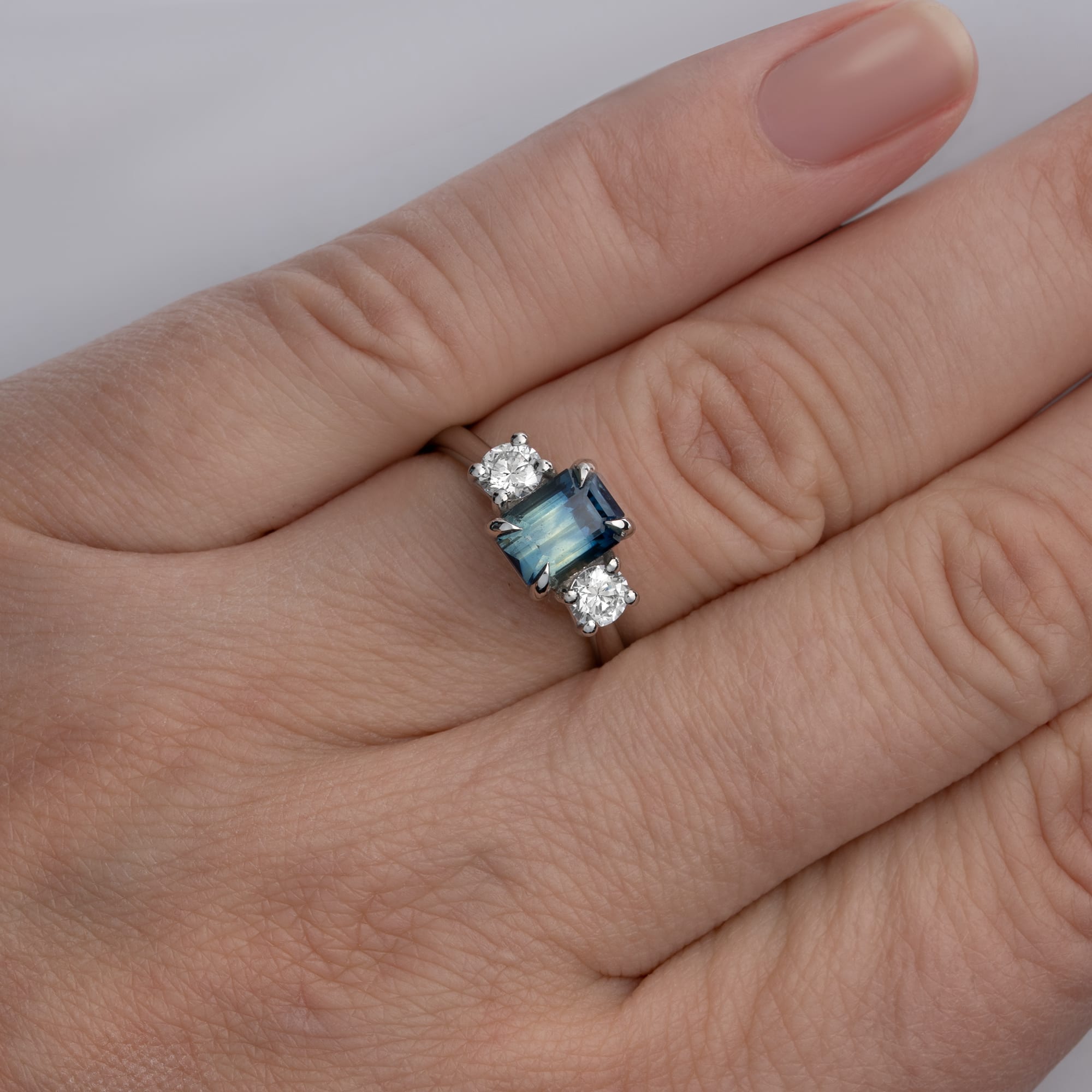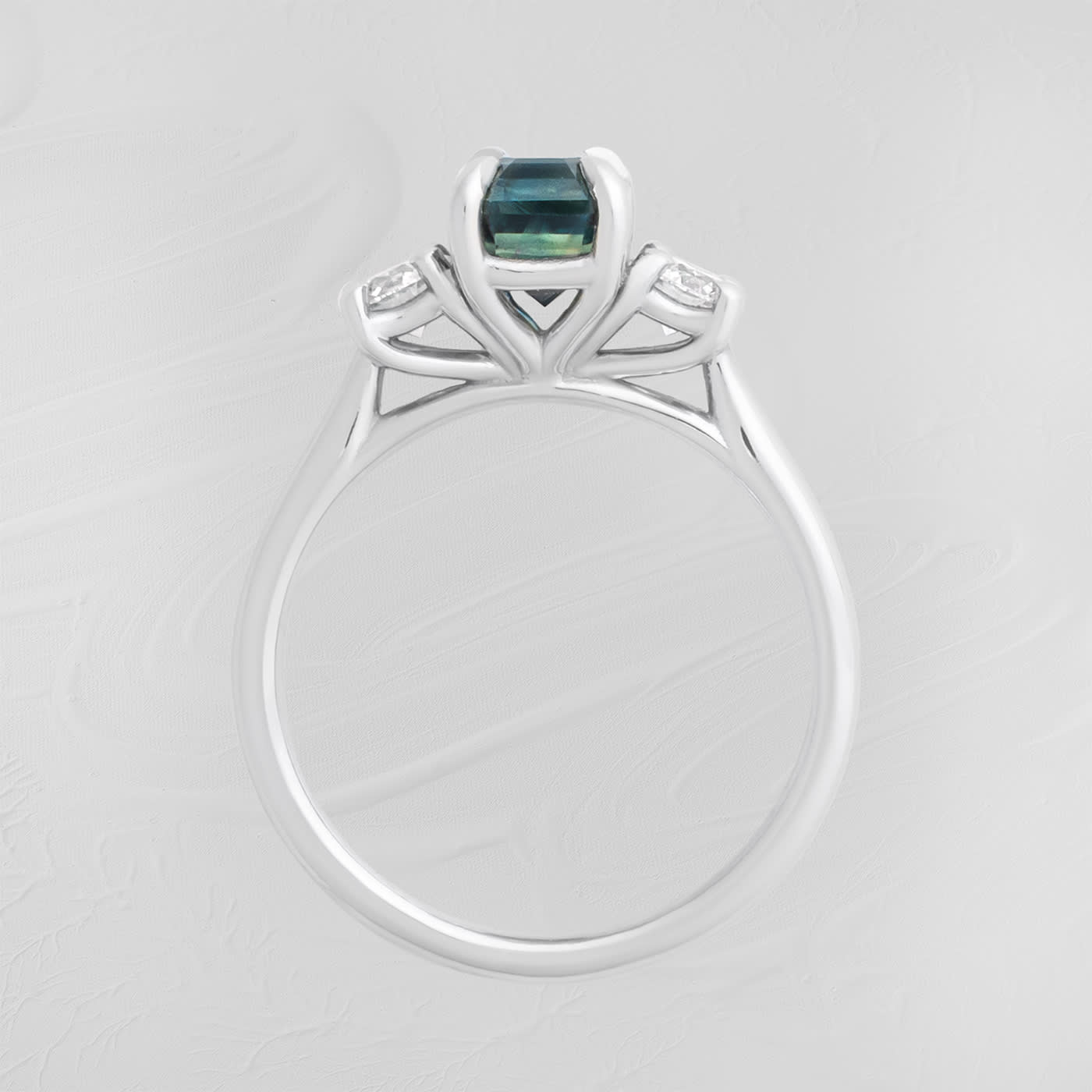 This trilogy engagement ring is set in an intricate platinum mount, featuring a natural, emerald cut bi colour sapphire of 2.14 carats secured in a four-talon setting. The central sapphire is flanked by two lab-grown, round brilliant cut diamond accent stones. The platinum mount provides a secure and durable setting for this fine jewellery piece.