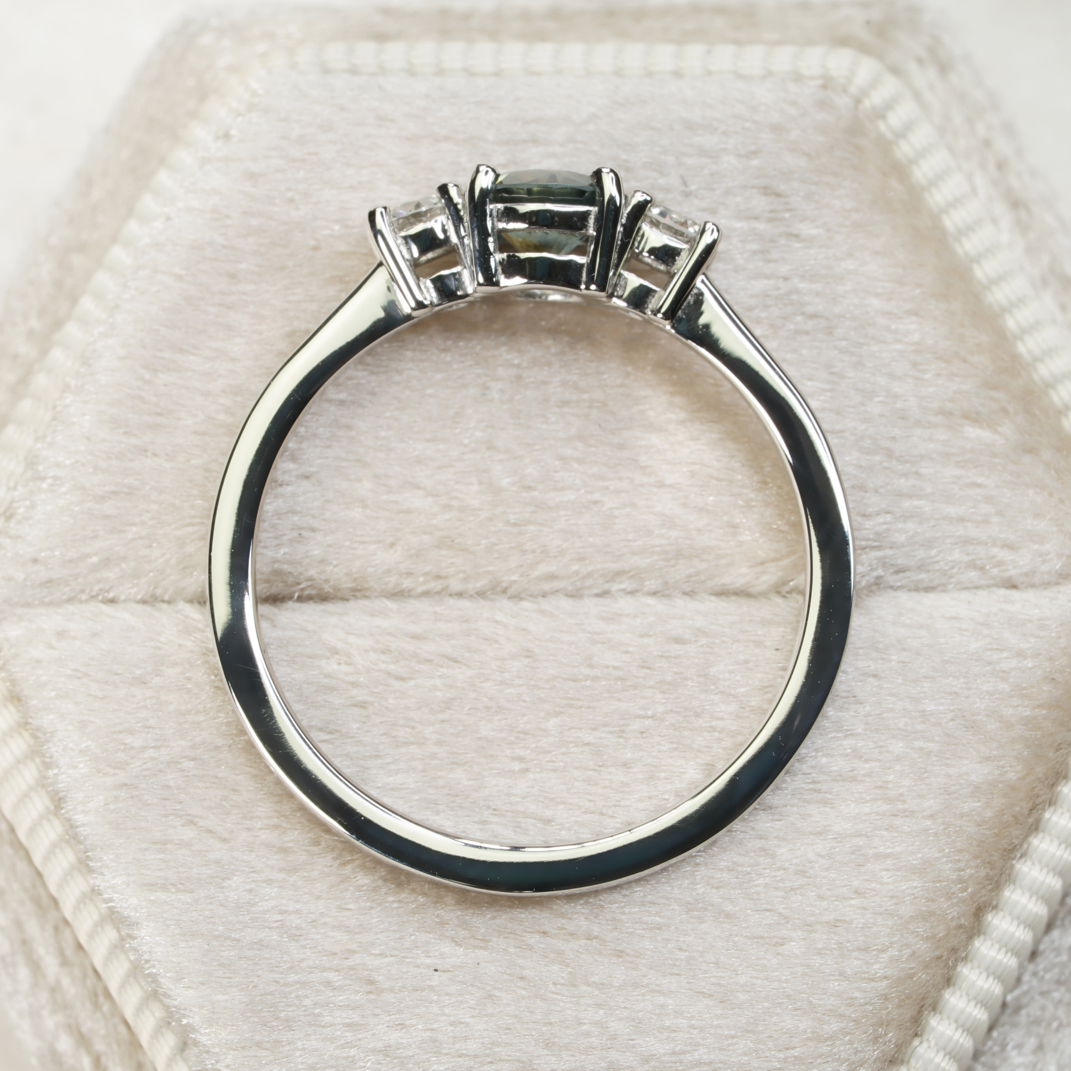 We have set the sapphire with two round brilliant diamonds in a classic platinum trilogy style setting.