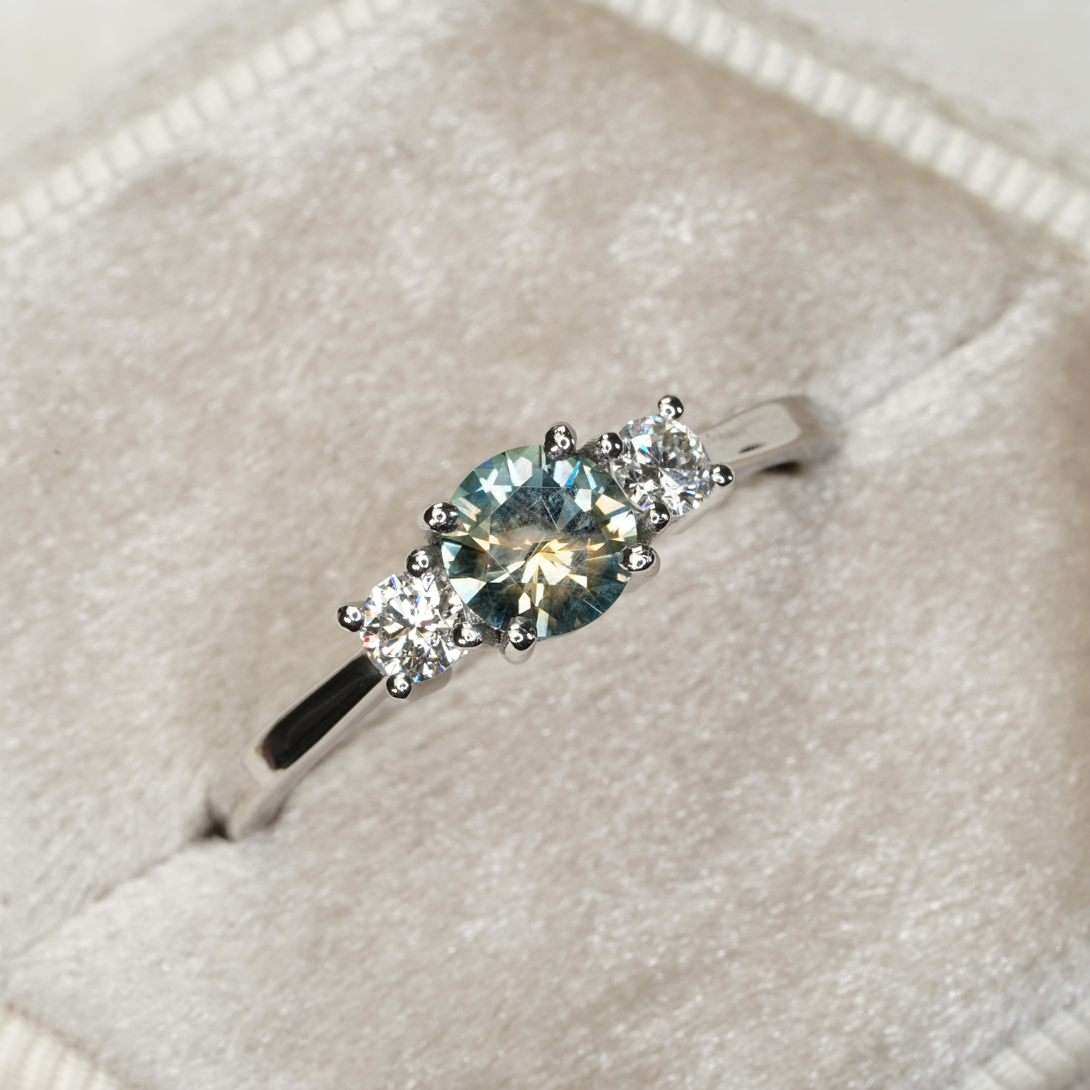 This beautiful new ring features a very unusual 0.63ct bi coloured sapphire from Rock Creek, Montana, USA. It displays distinct hues of steely teal (teal with grey undertones) and golden yellow. The golden yellow hue bursts through the centre of the gem like a ray of sunshine.