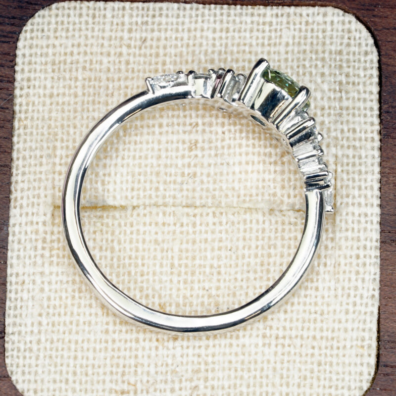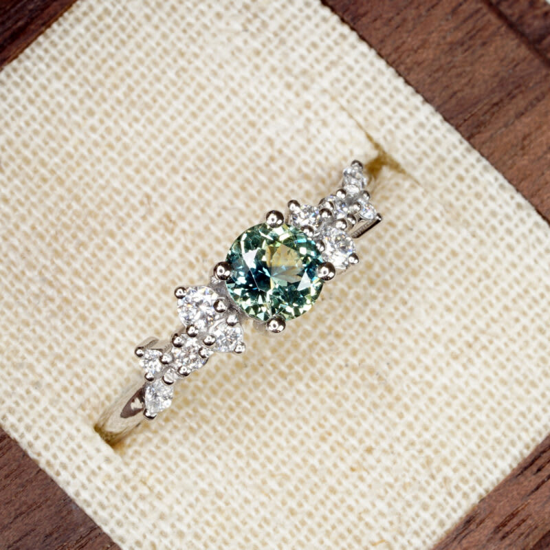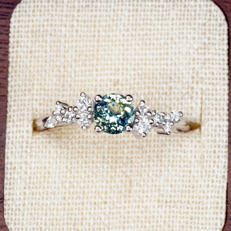 This brand new ring features a central natural 0.66ct, light blue and seafoam green, precision cut Sapphire. It is prong set with a mixture of round and marquise cut diamonds in a unique floral inspired mount!