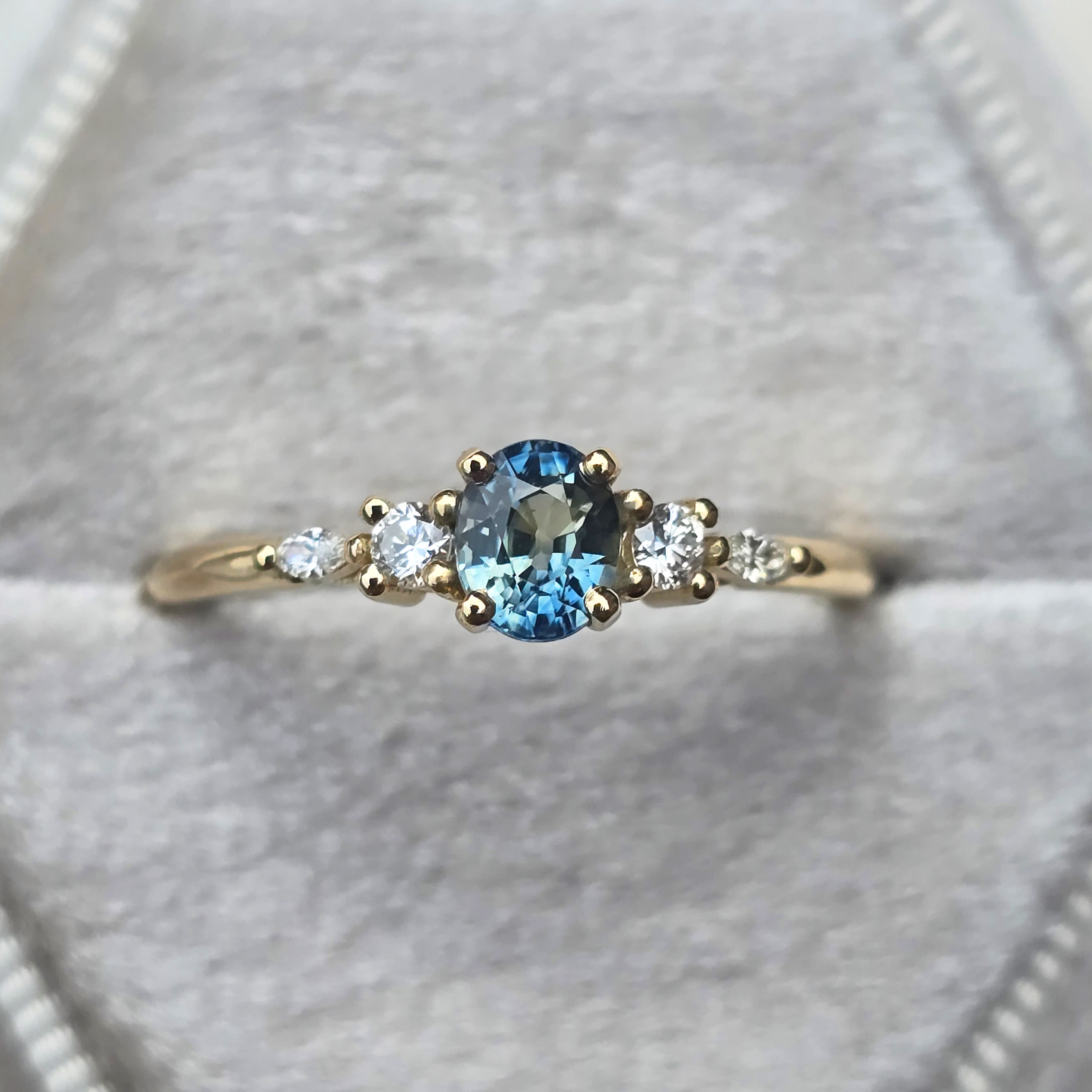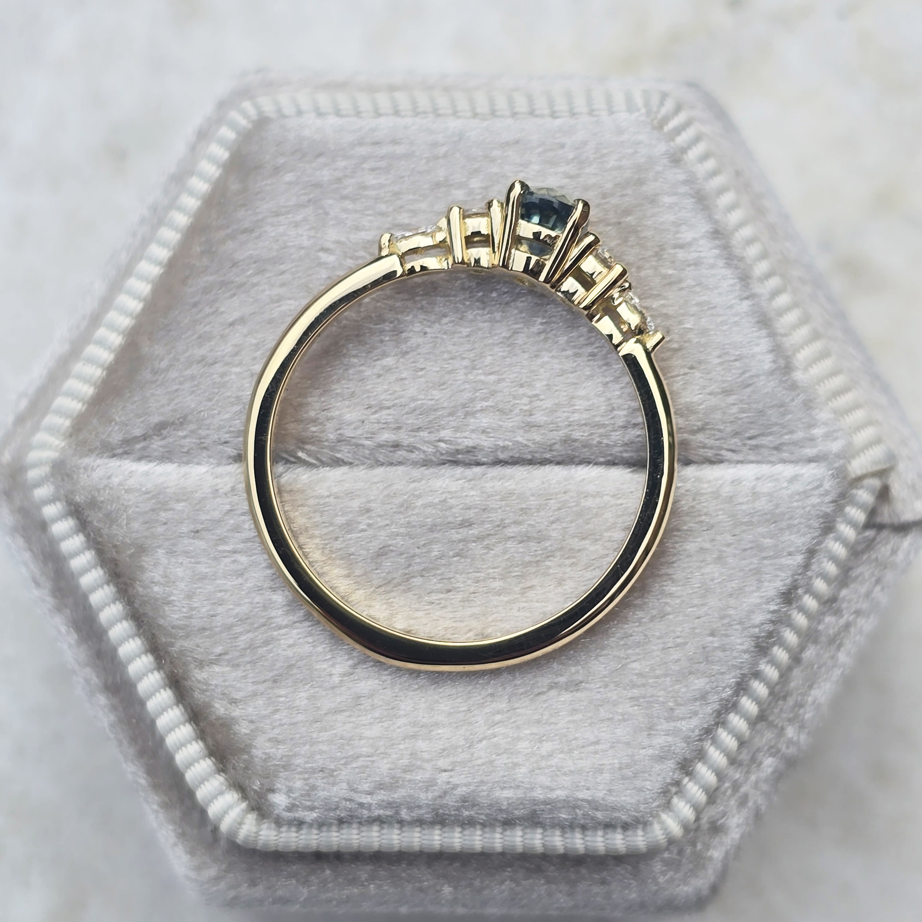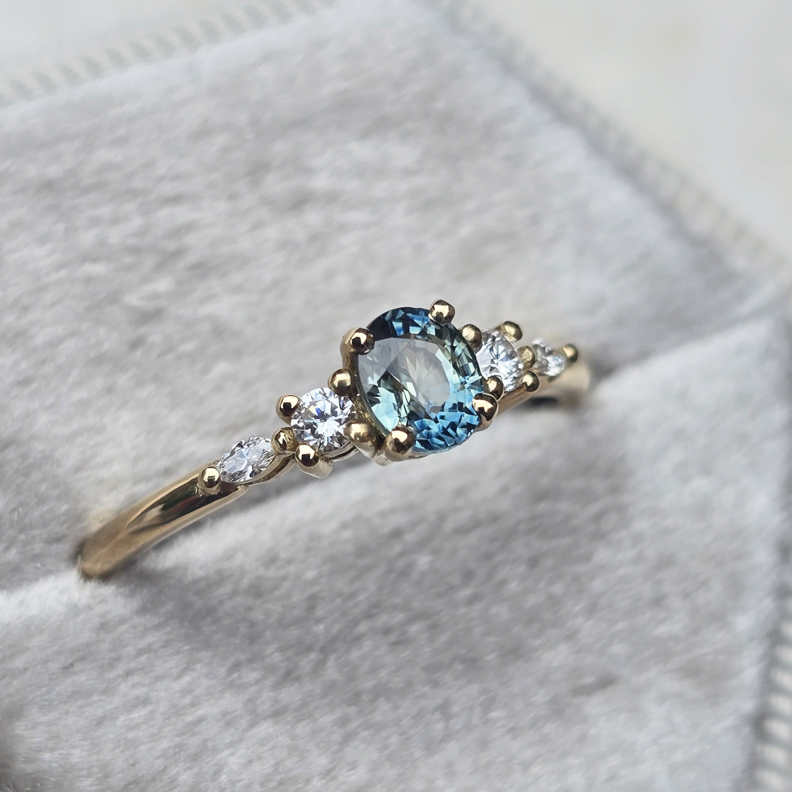 This elegant ring features a central 0.62ct bi colour green and blue sapphire. The sapphire has been 4 prong set with two round brilliant and two marquise lab diamonds in a classic 5 stone 18ct yellow gold setting!