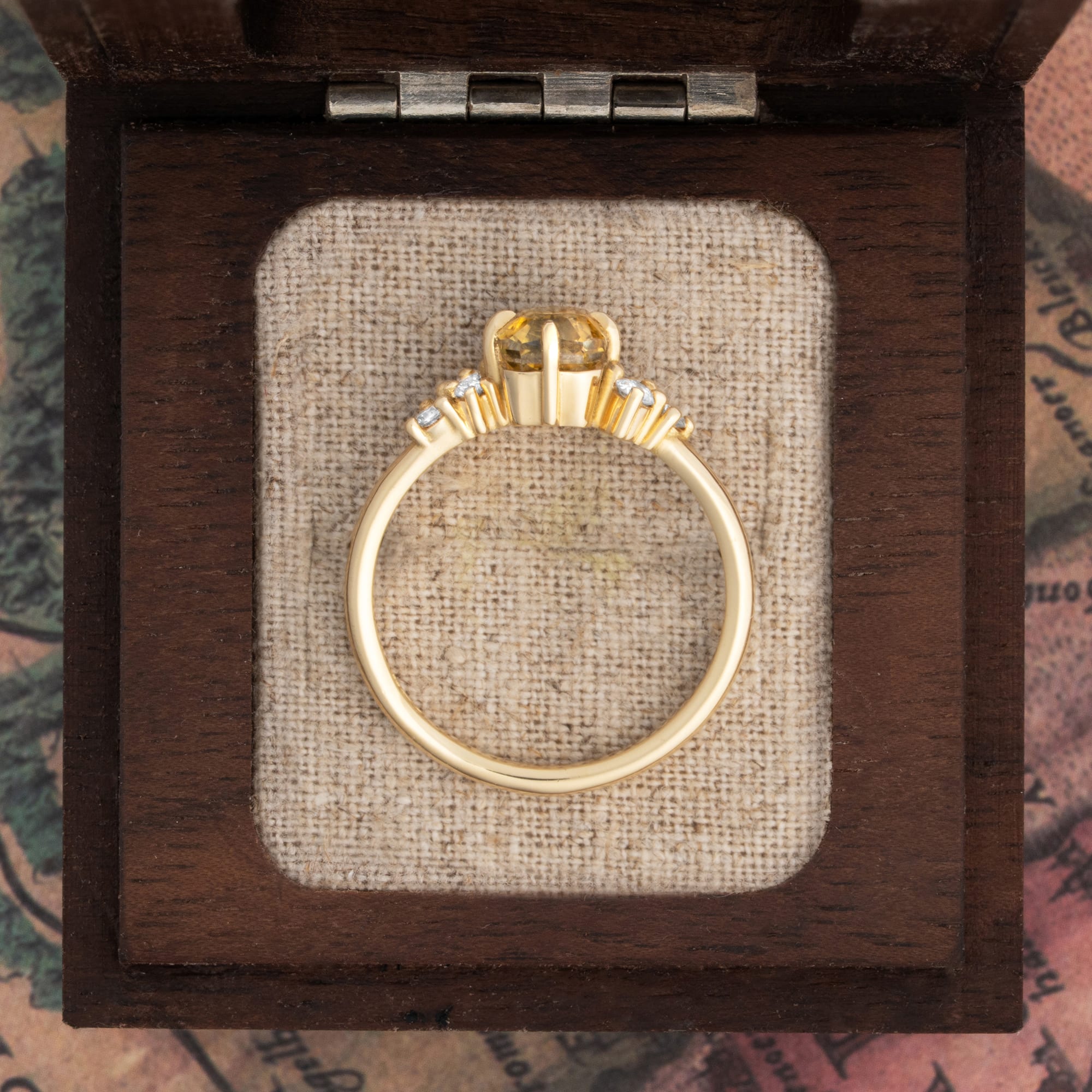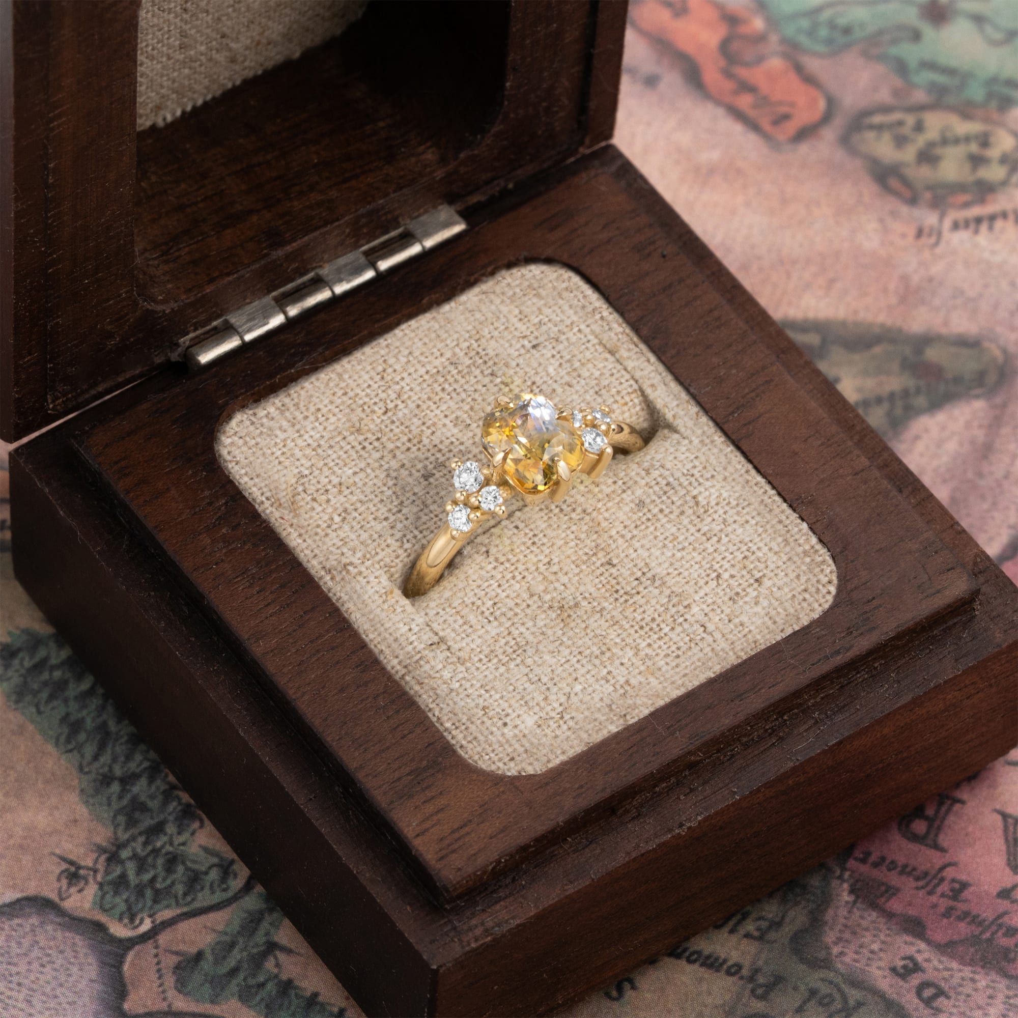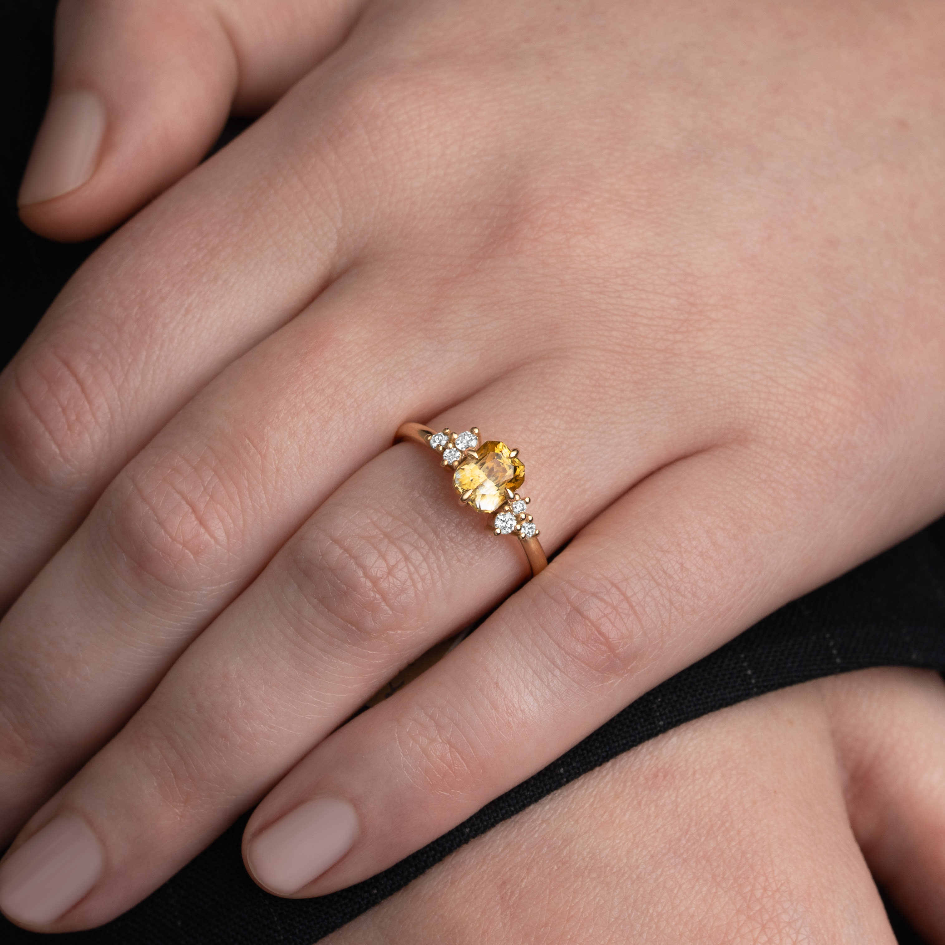 Description: This bi-colour sapphire and diamond cluster ring features a central natural 1.68ct radiant cut sapphire displaying distinct yellow and white hues. The center stone is prong set within a floral-inspired low-profile mount. The design is accented with six brilliant cut diamonds, contributing a total of 0.15ct, set into the 18ct yellow gold setting.