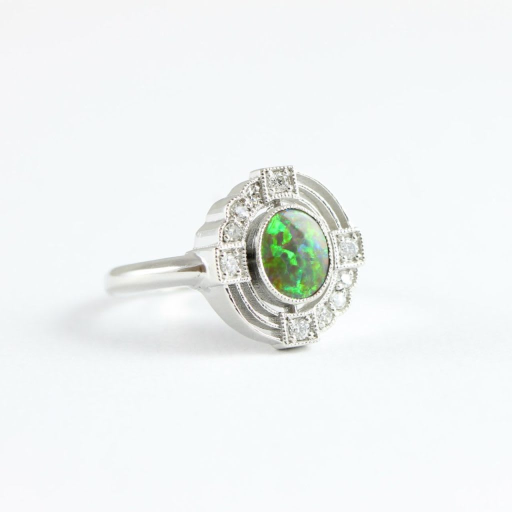 This is a one-off completely bespoke ring made from scratch, the only one of its kind! The ring features a central solid black opal with incredible green/orange/red fire. Diamonds are set around the ring face to resemble stars in a galactic orbit!