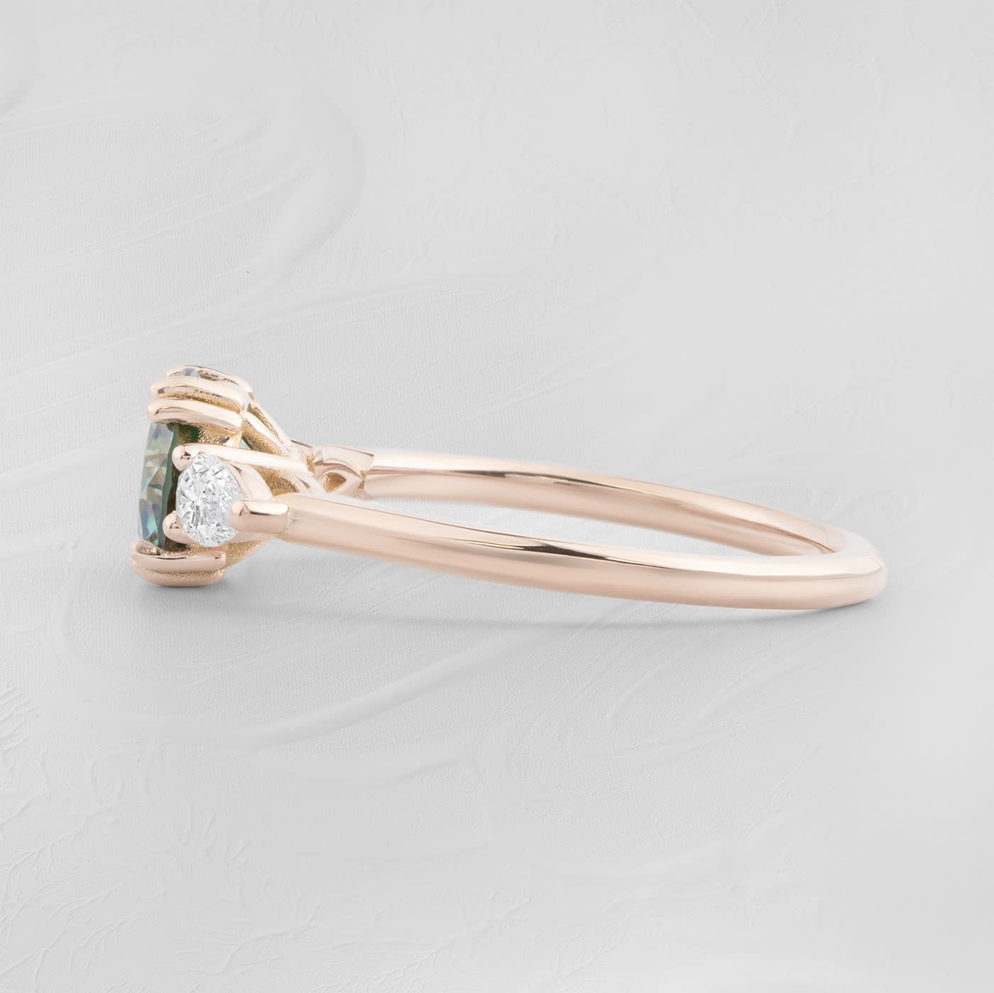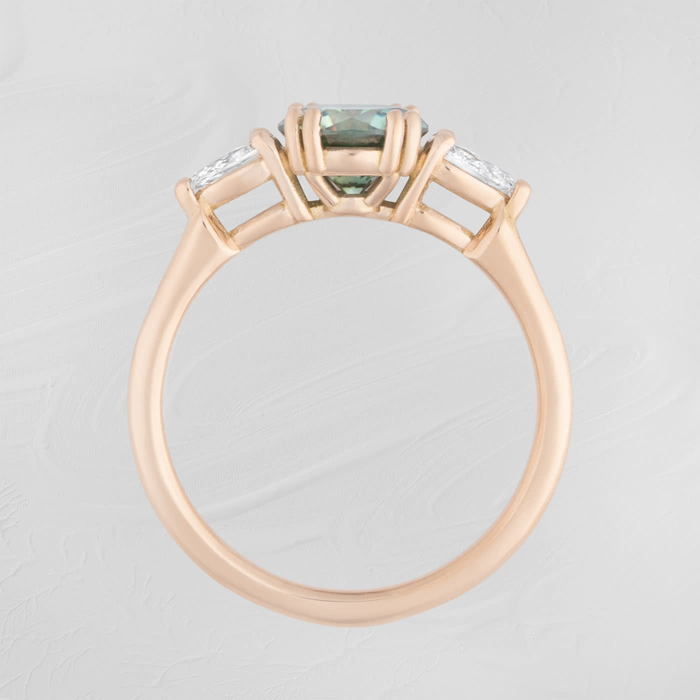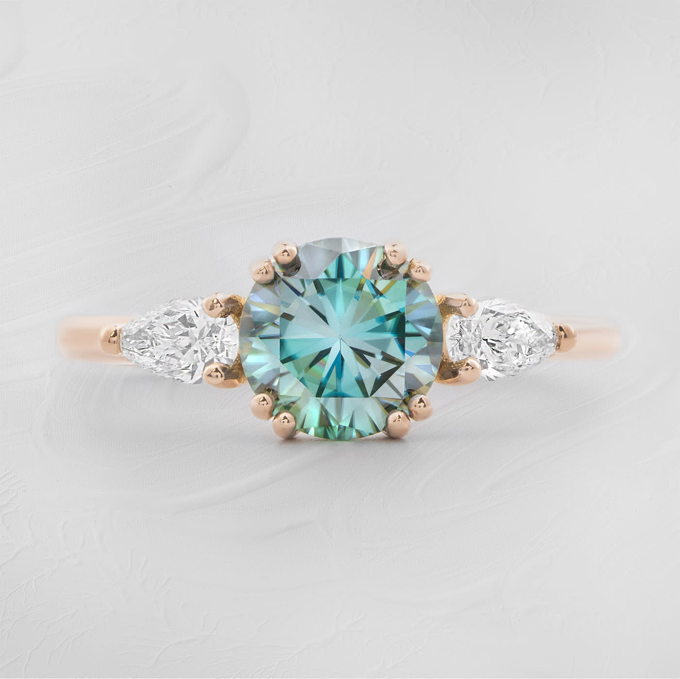 Description: This trilogy engagement ring features a lab grown blue moissanite centre stone, set with double prongs for security. The central moissanite is flanked by two pear cut lab-grown diamonds, creating a three-stone design. The design is secured on a slim 1.6mm band profile.