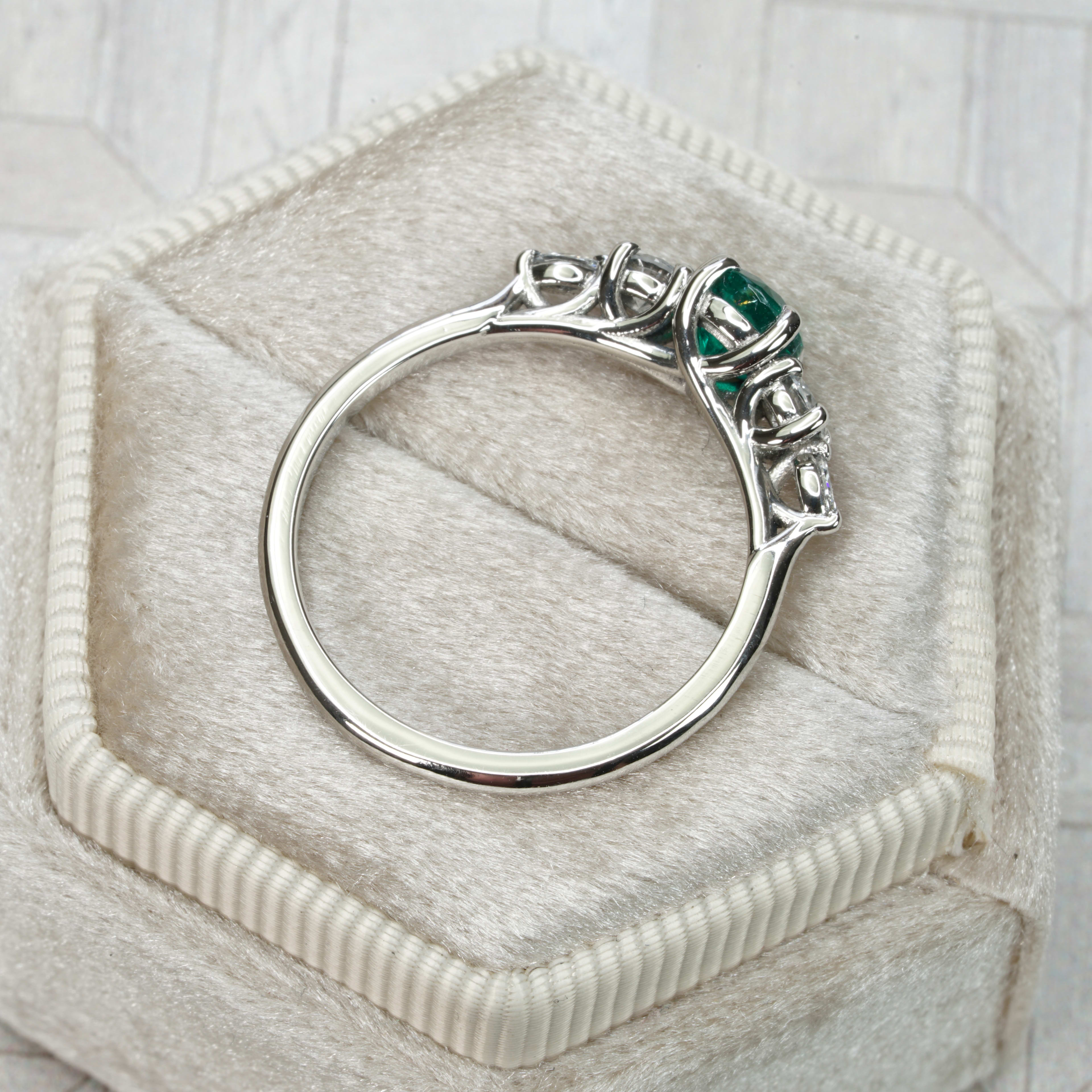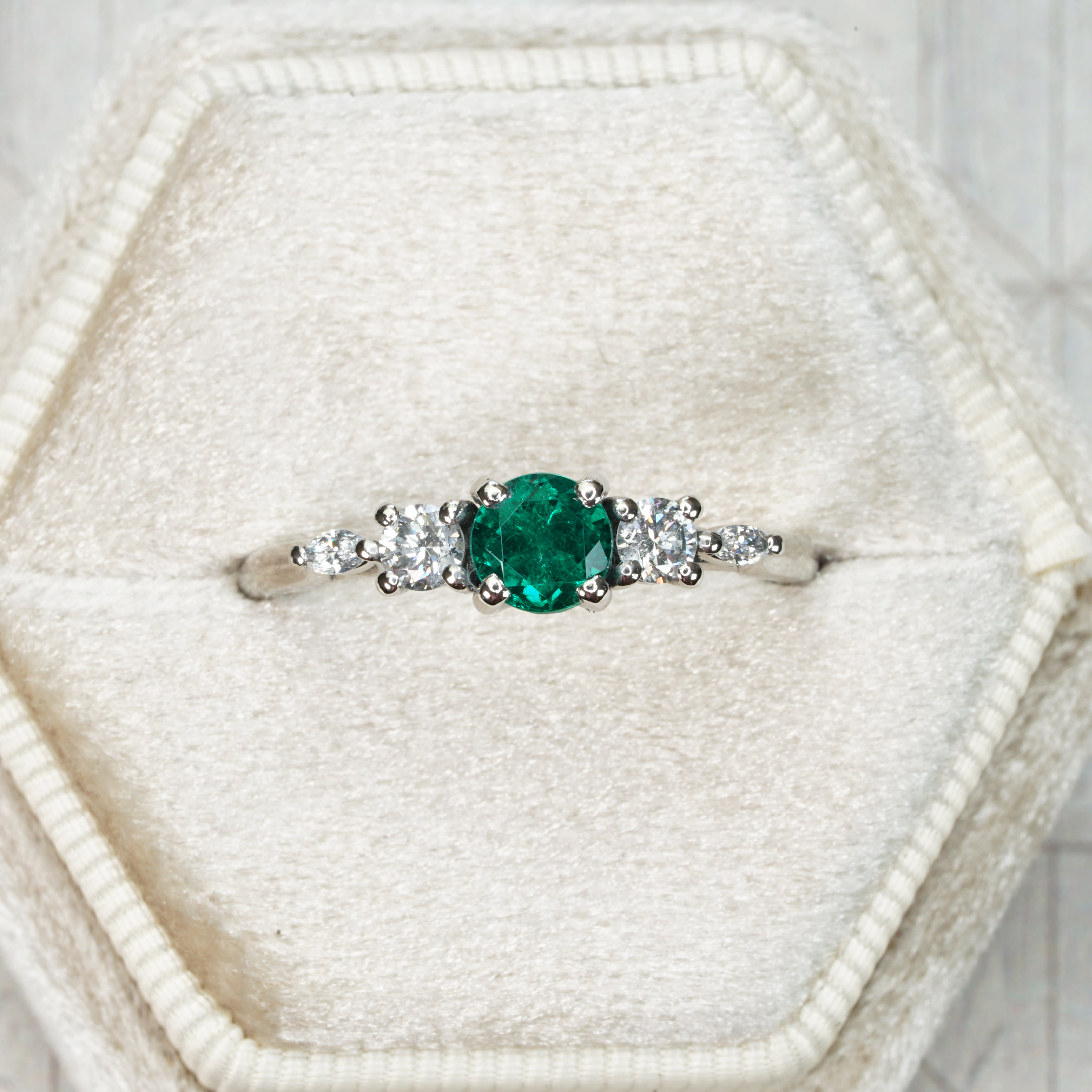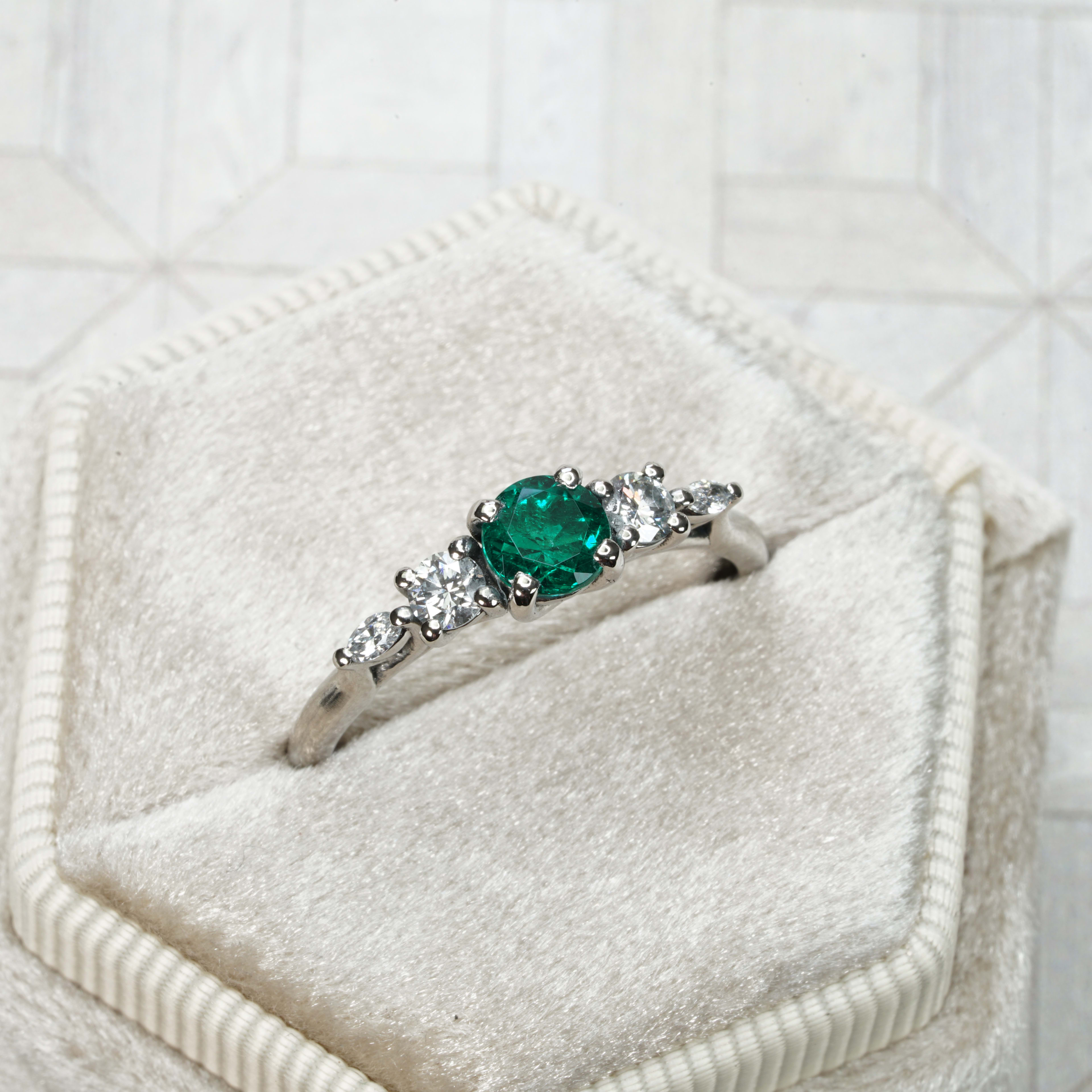 This beautiful new ring features a natural round cut Colombian emerald (minor oil), of vivid slightly blueish-green saturation. You don't see natural emeralds of this colour too often! It is flanked by round and marquise cut diamonds, in an intricate, weaving, trellis style platinum band!