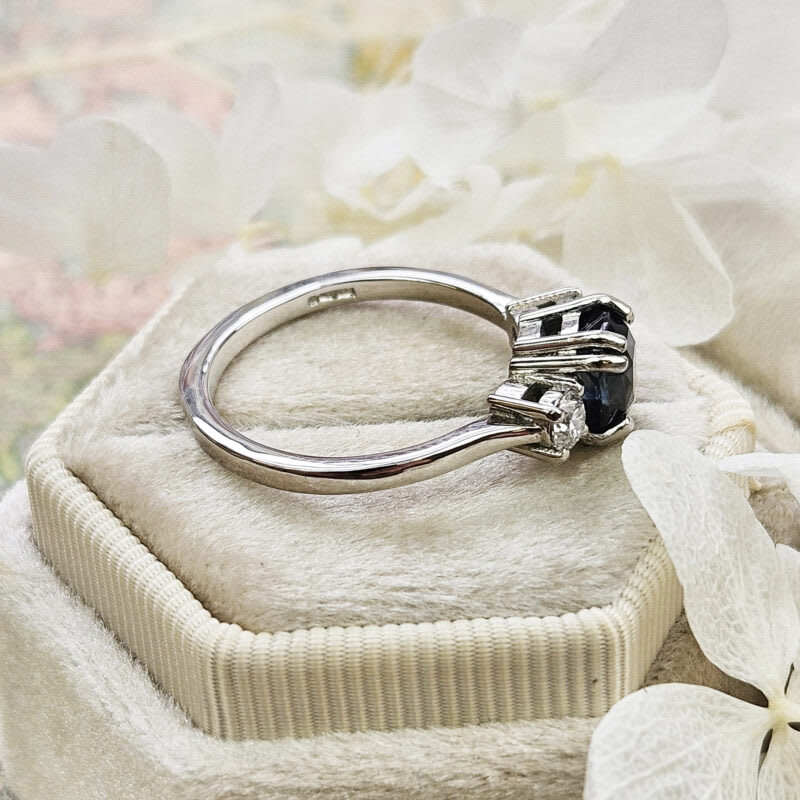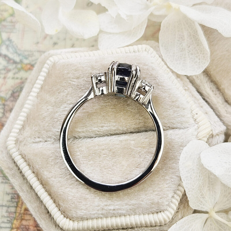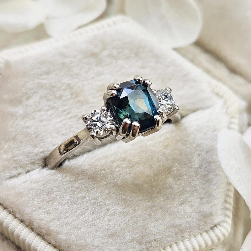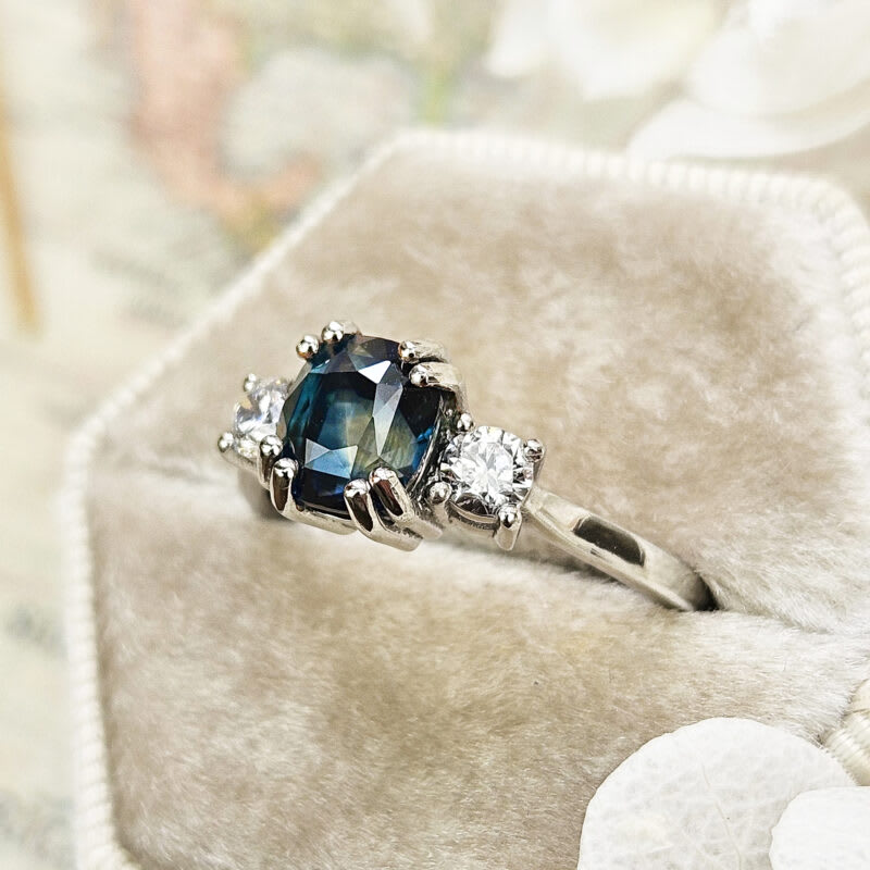 This brand new stunning ring features a central natural 2.11ct cushion cut teal sapphire, that has been double prong set with two brilliant cut lab grown diamonds, in a low profile platinum trilogy mount!