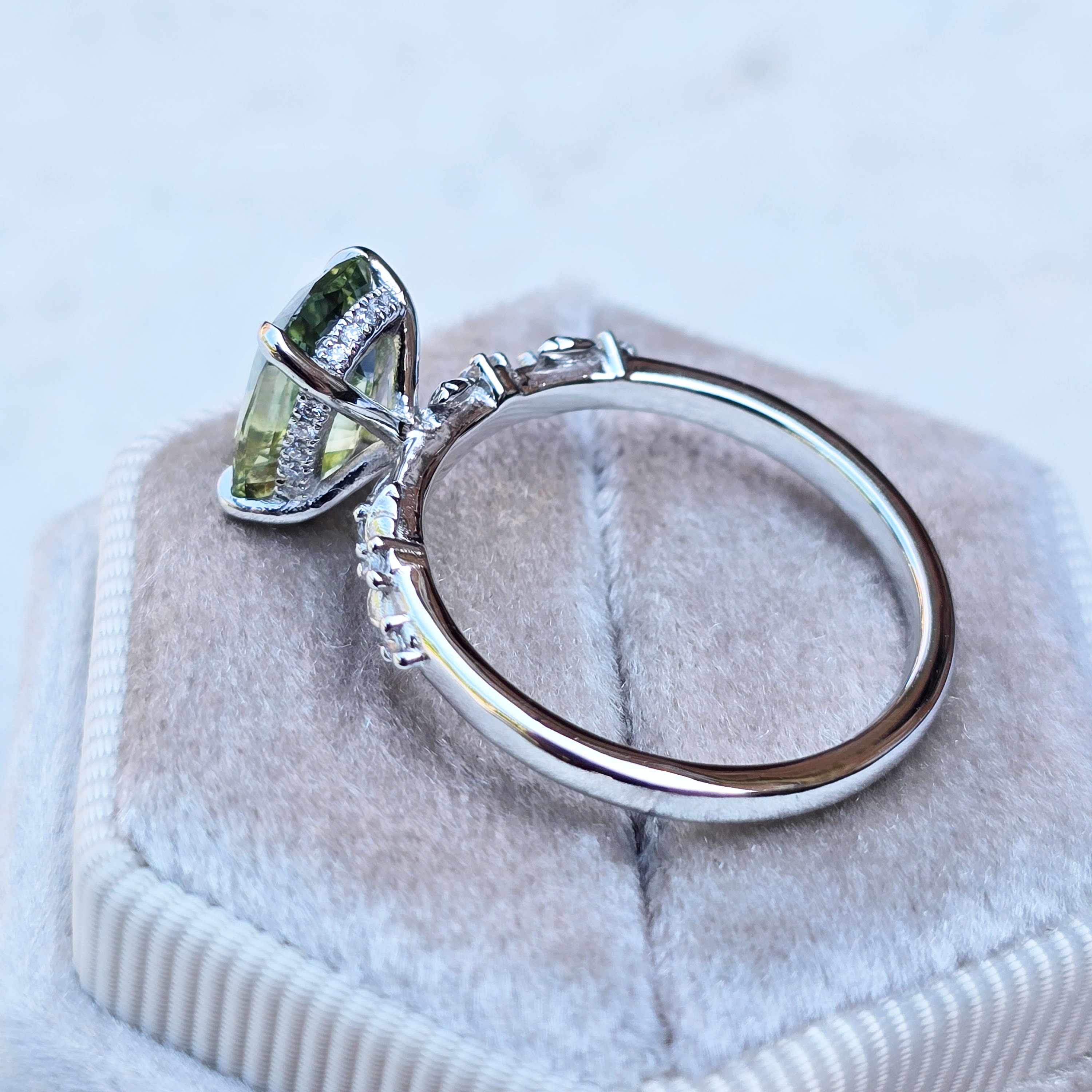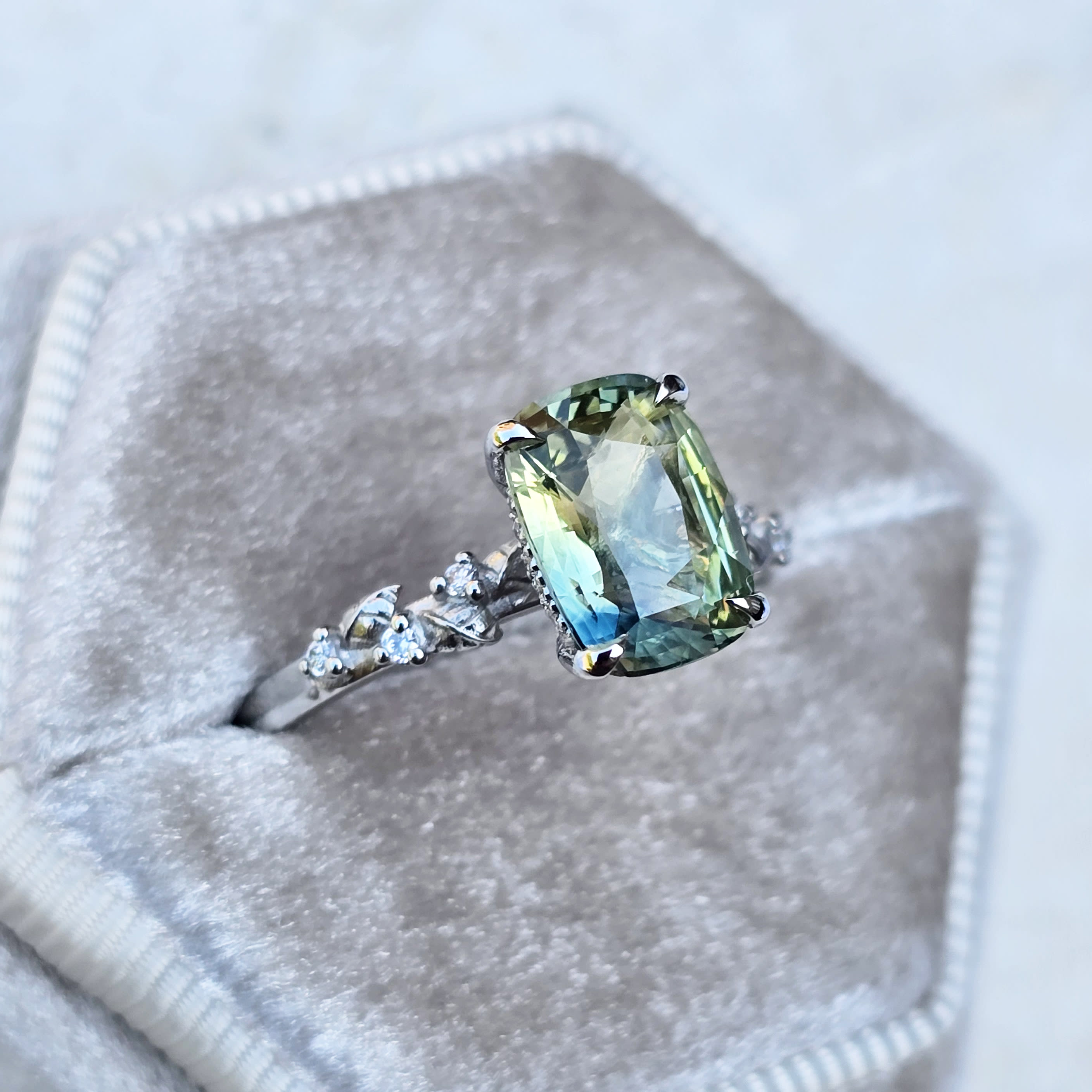 This elegant ring features a central stunning 2.88ct, unheated, cushion cut parti sapphire. The sapphire displays hues of seafoam green, sky blue and sandy yellow! It has been set in a 4 talon setting. The central gem is accented with a mixture of miniature leaves and round lab grown diamonds, with an additional secret hidden halo of lab grown diamonds all in platinum!