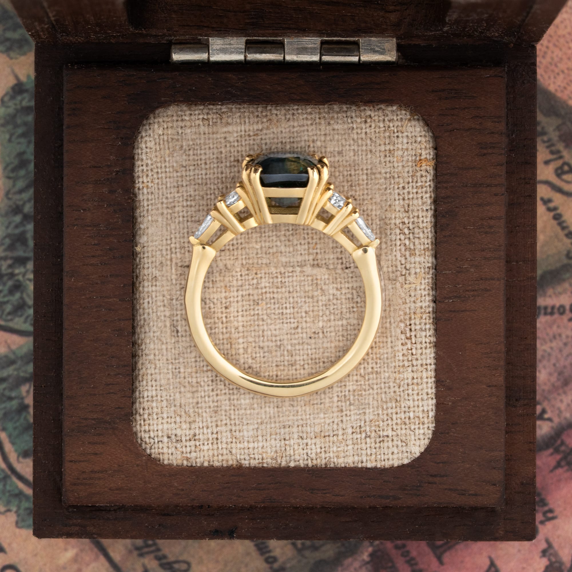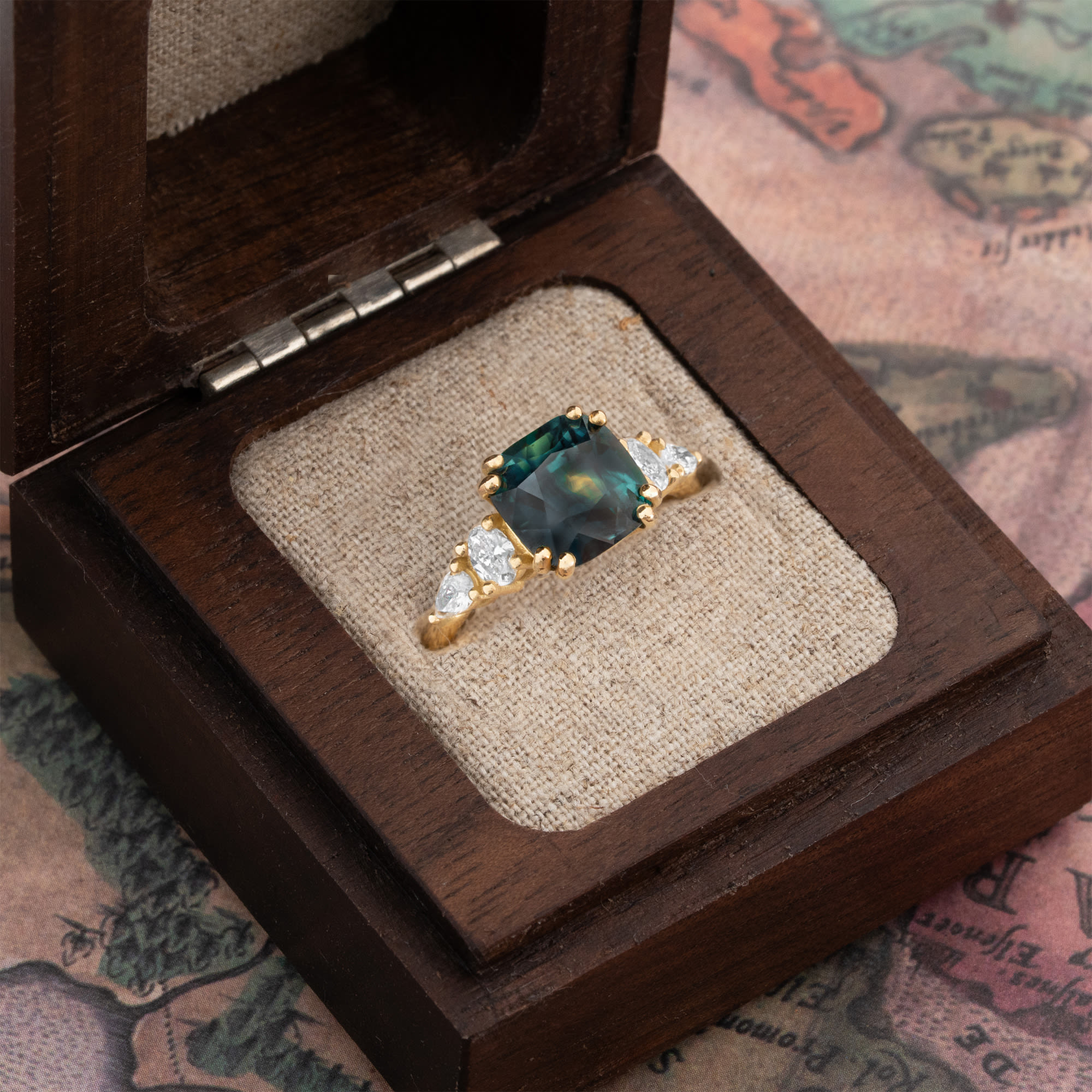 Description: This cushion teal sapphire and diamond ring is a fine jewellery piece featuring a 4.03ct natural cushion cut teal sapphire secured with double prongs. The centre stone is flanked by two oval and two pear cut lab-grown accent diamonds, creating an antique-inspired five-stone design. The ring is pre-made in an 18ct yellow gold mount.