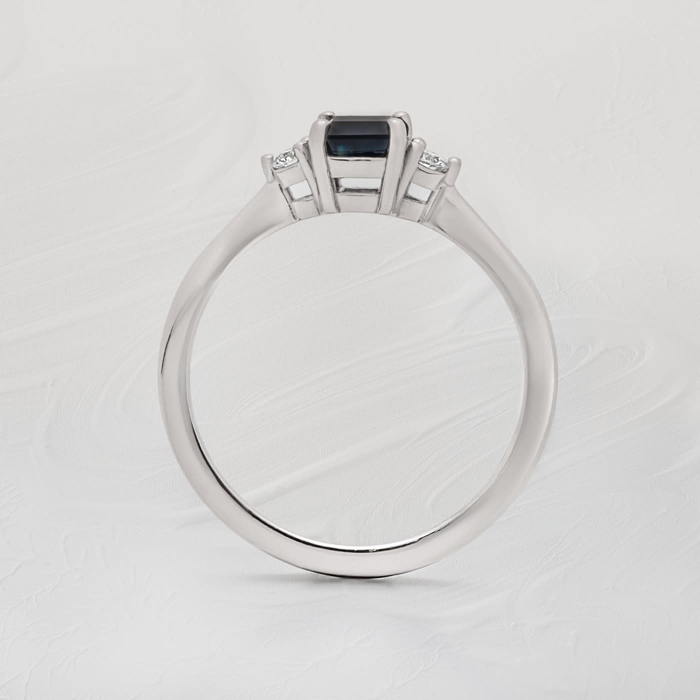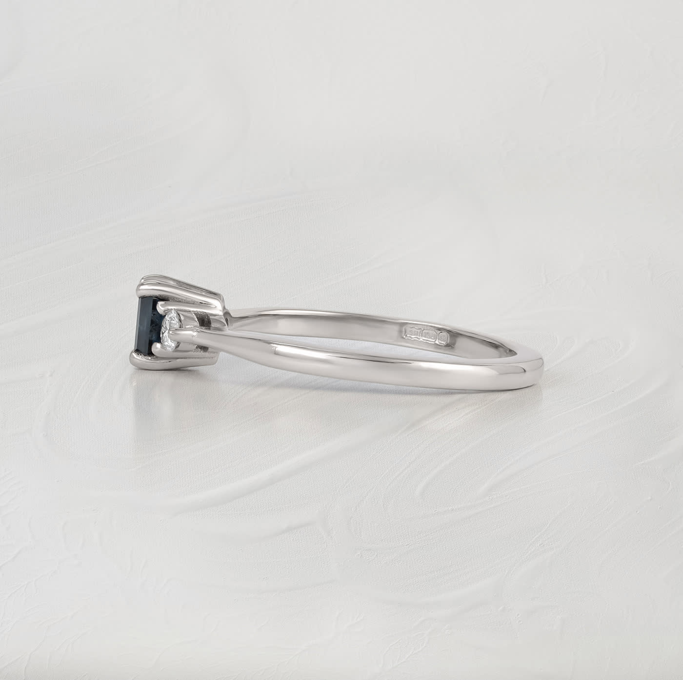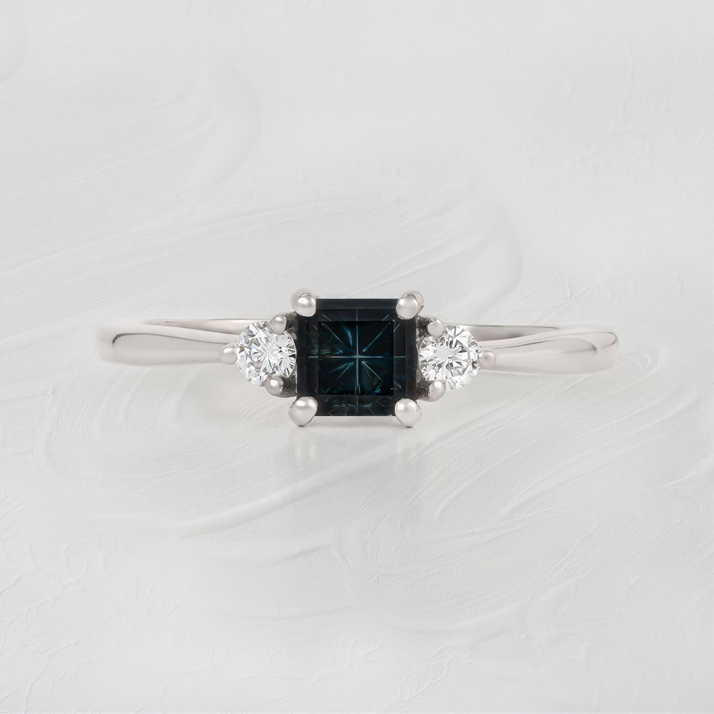 This brand new ring features a John Dyer square 'Starbrite' cut sapphire, from Australia. It has been prong set with two round brilliant cut lab grown diamonds, all in 18ct grey gold!
