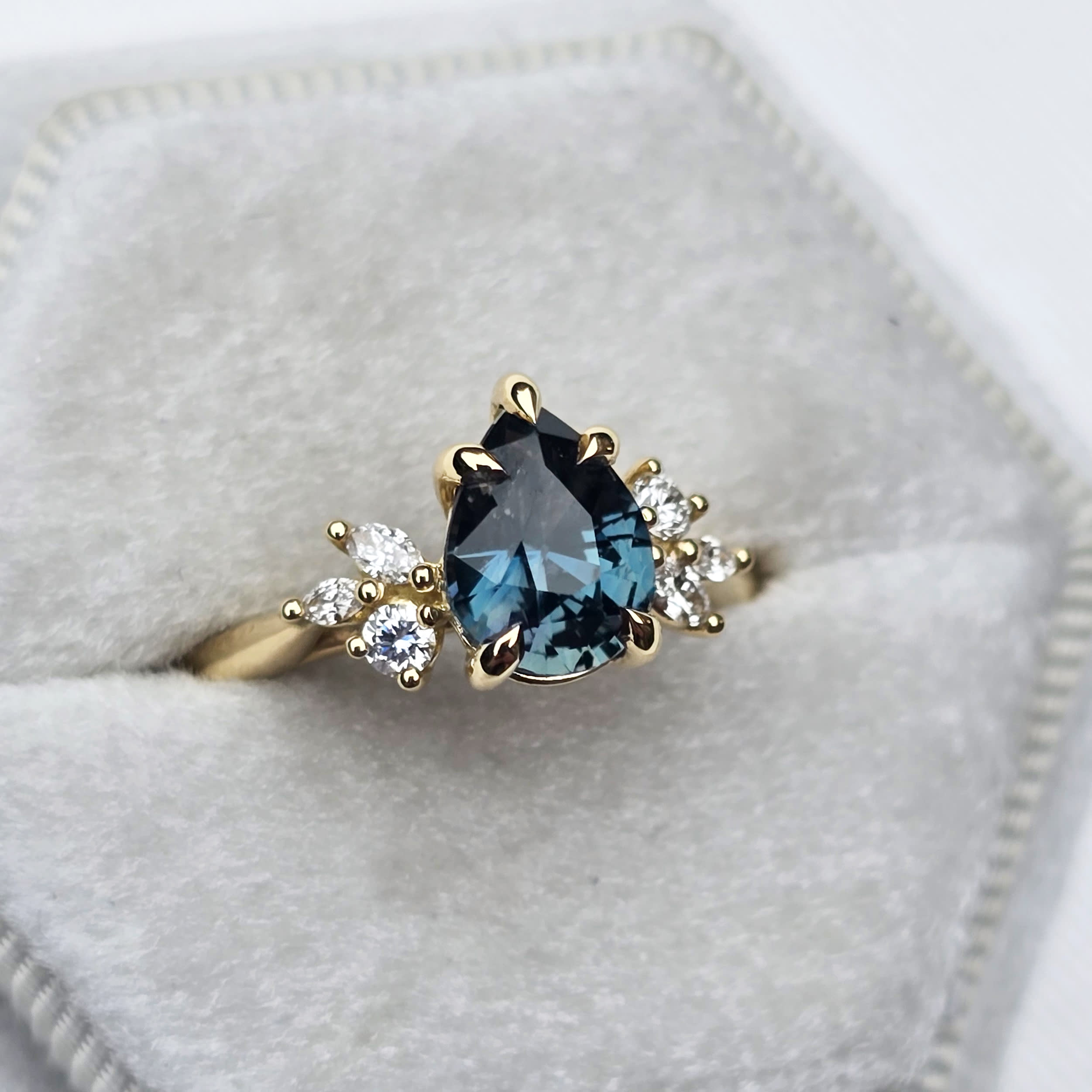 Description: This engagement ring features a central 1.58ct pear cut teal sapphire, set within a floral-inspired mount. The design is accented with two round and four marquise lab-grown diamonds integrated into either size of the center diamond.
