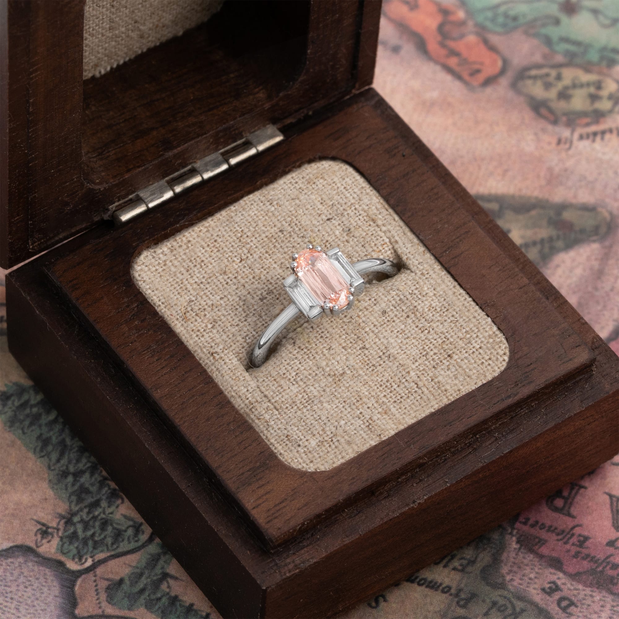 Description: This art deco inspired engagement ring features a central 0.82ct elongated cushion cut pink lab-grown diamond, secured by a double prong setting. The centre stone is flanked by two baguette cut lab-grown white accent diamonds, totalling 0.34ctw. The ring is set low on the finger and features a 1.5mm band thickness, providing a secure and balanced profile.