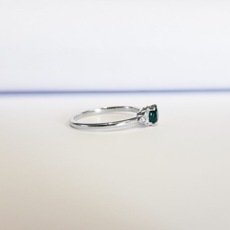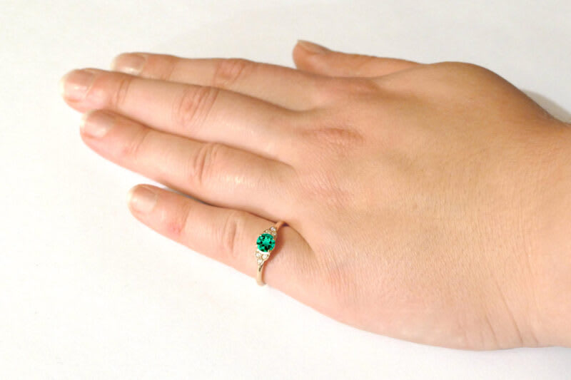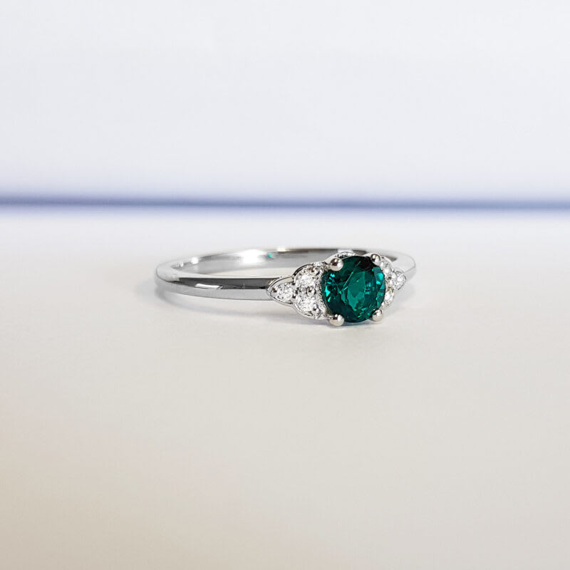 This brand new stunning ring features a central round cut lab grown emerald, flanked by 6 diamonds in a gold or platinum mount! Lab grown emeralds are identical to natural emeralds, but at a much more affordable price.