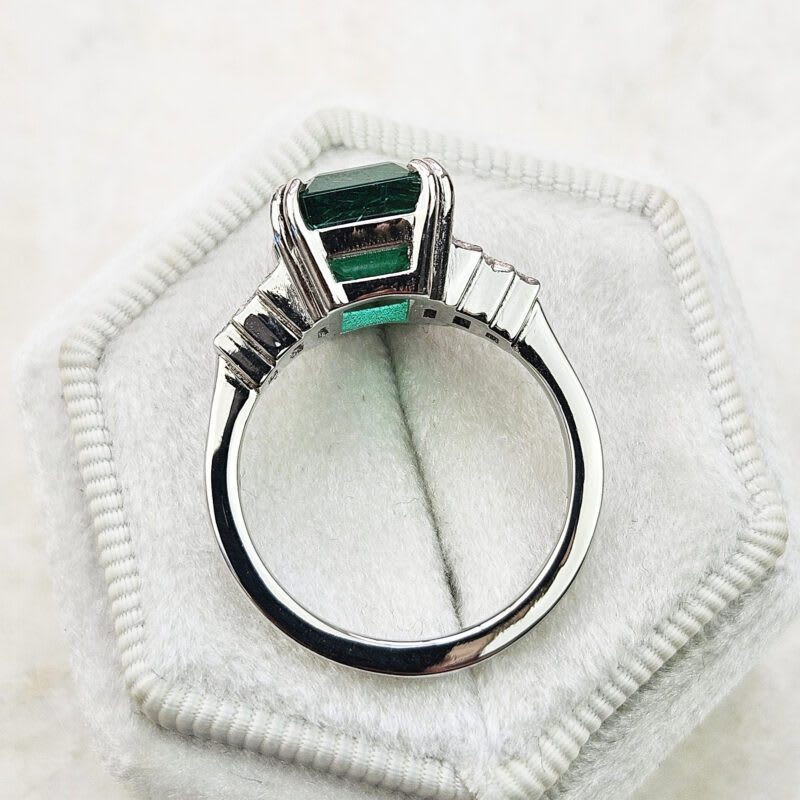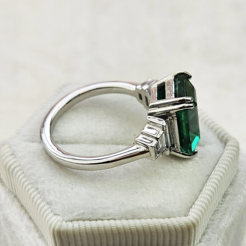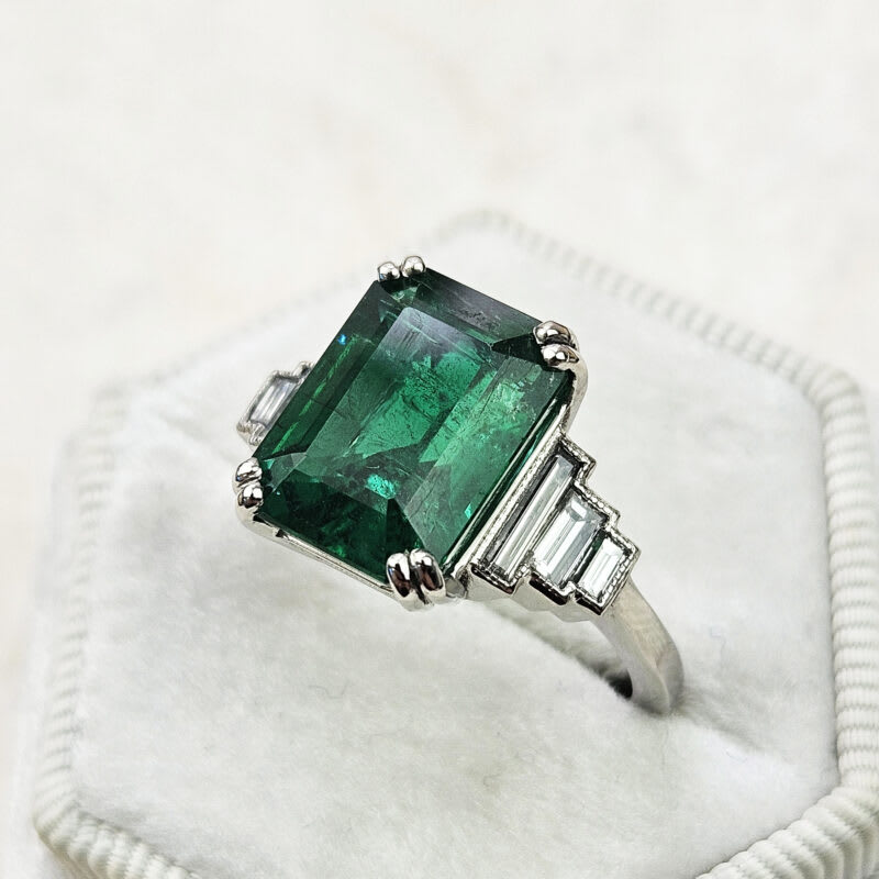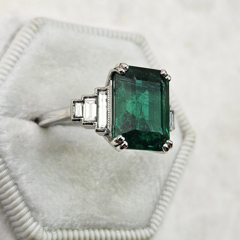 Here is a real showstopper. This one of a kind ring features a central natural 5.61ct emerald cut Colombian emerald. Colombia is legendary for its emeralds, producing the very best in the world. It has been double prong set with a graduating series of baguette cut natural diamonds, in a classic 1920s style art deco platinum arrangement. This ring would not be out of place in The Great Gatsby.