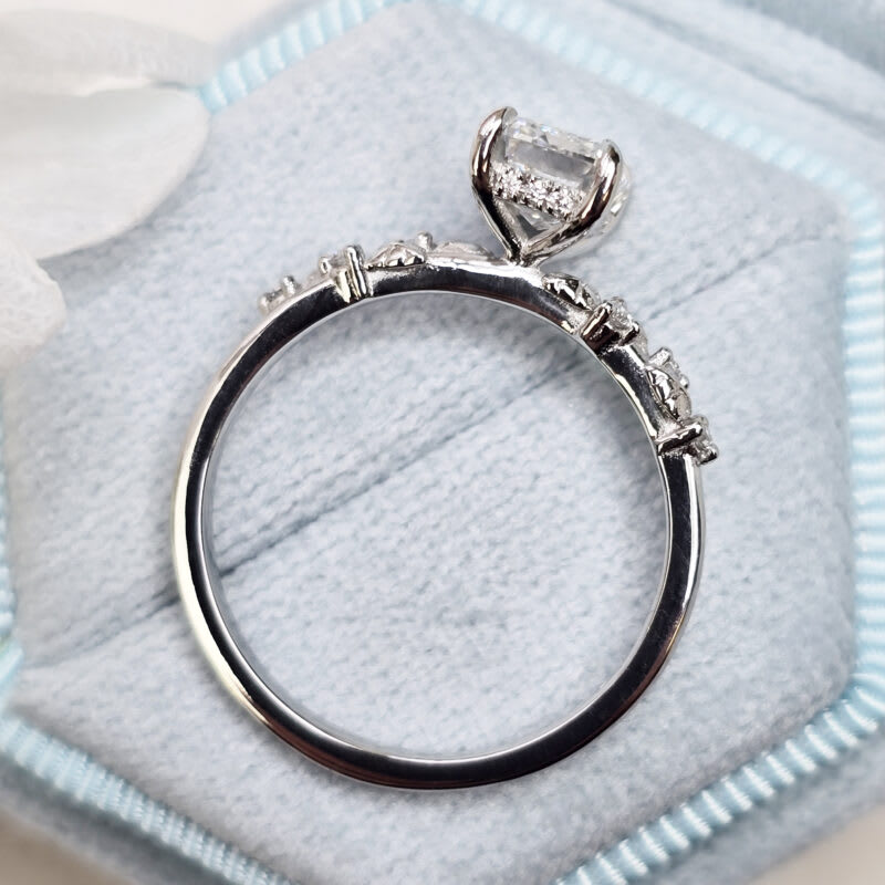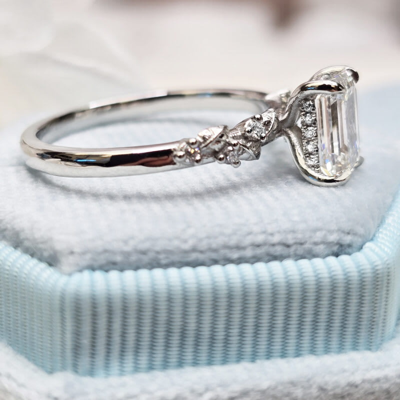 This elegant ring features a central 1.5ct Emerald cut lab grown diamond, in a 4 talon setting. The central diamond is accented with a mixture of miniature leaves and round diamonds, with an additional secret hidden halo of diamonds all in platinum!