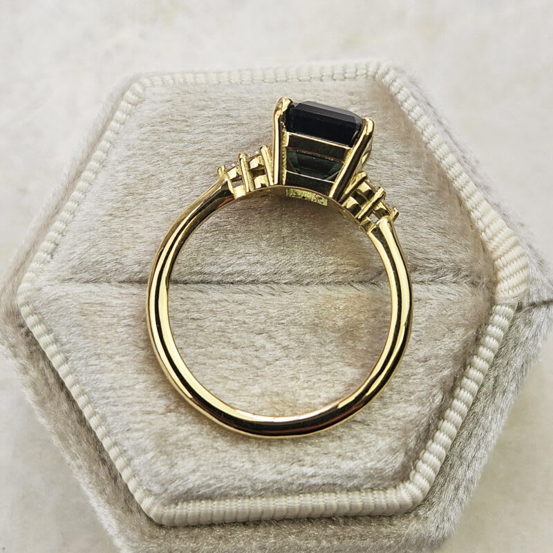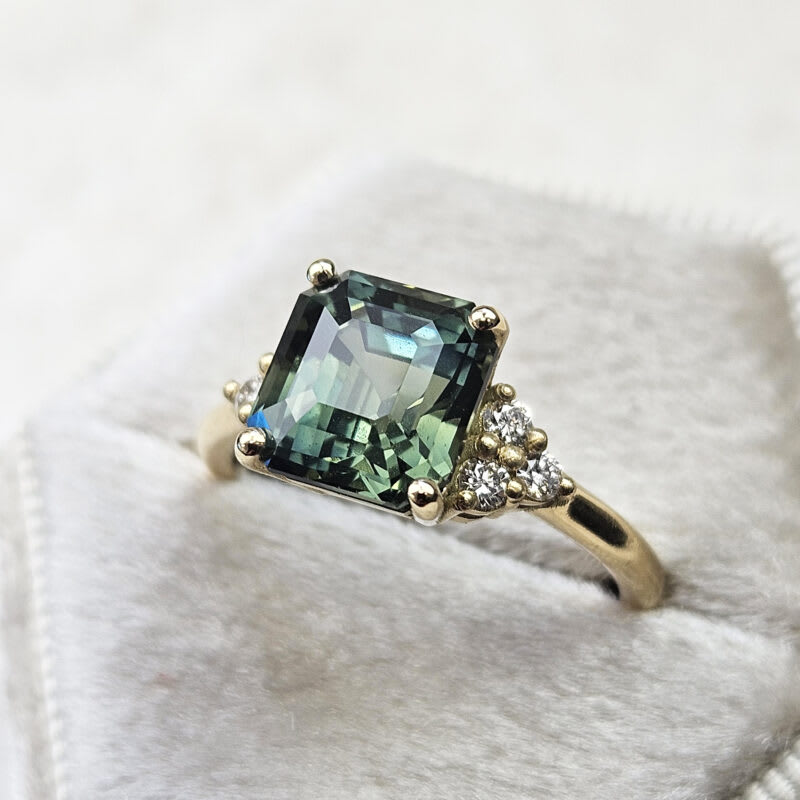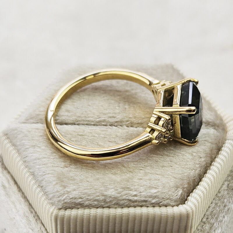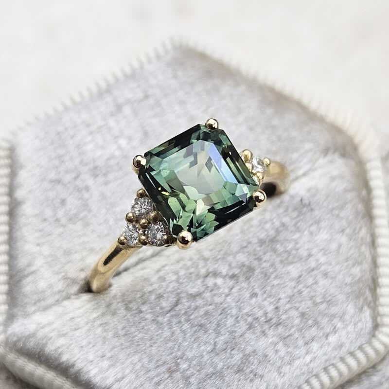This absolutely gorgeous ring features a beautiful 4.56ct natural green sapphire, set with 6 diamonds flanking on either side in an 18ct yellow gold mount!