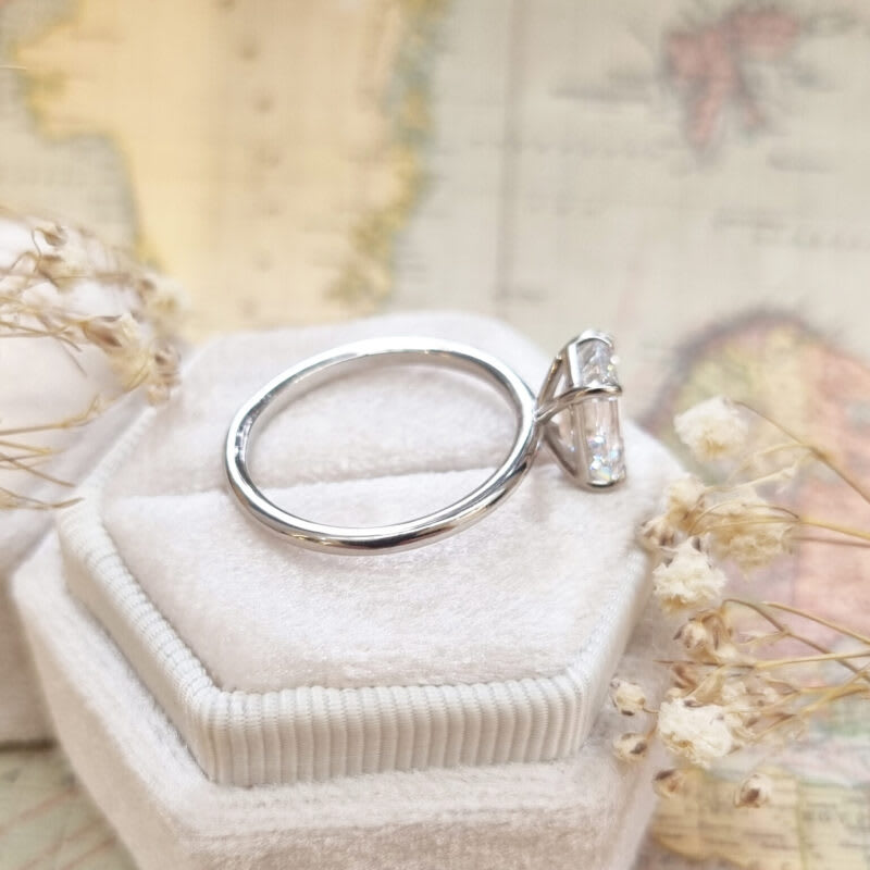 This brand new ring features a central stunning 2ct emerald cut lab grown diamond. It has been talon set in a sleek, slim style platinum mount!