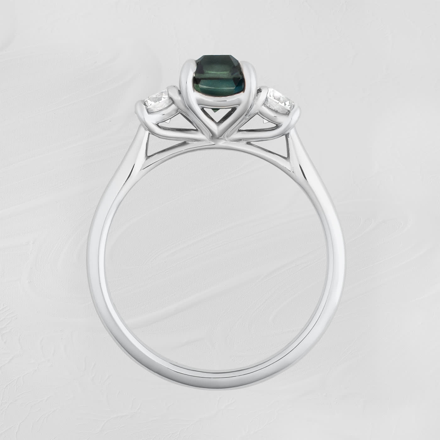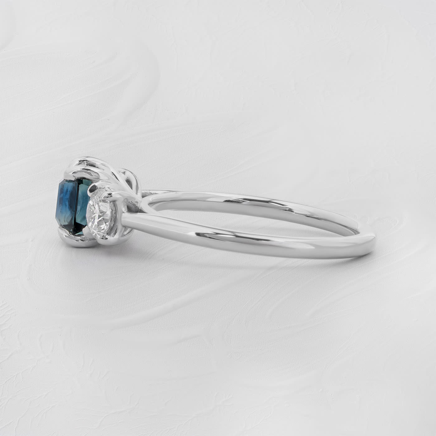 Description: This trilogy engagement ring is set in an intricate platinum mount, featuring a natural emerald cut teal sapphire of 1.35 carats secured in a four-talon setting. The central sapphire is flanked by two lab-grown, round brilliant cut diamond accent stones. The platinum mount provides a secure and durable setting for this fine jewellery piece.