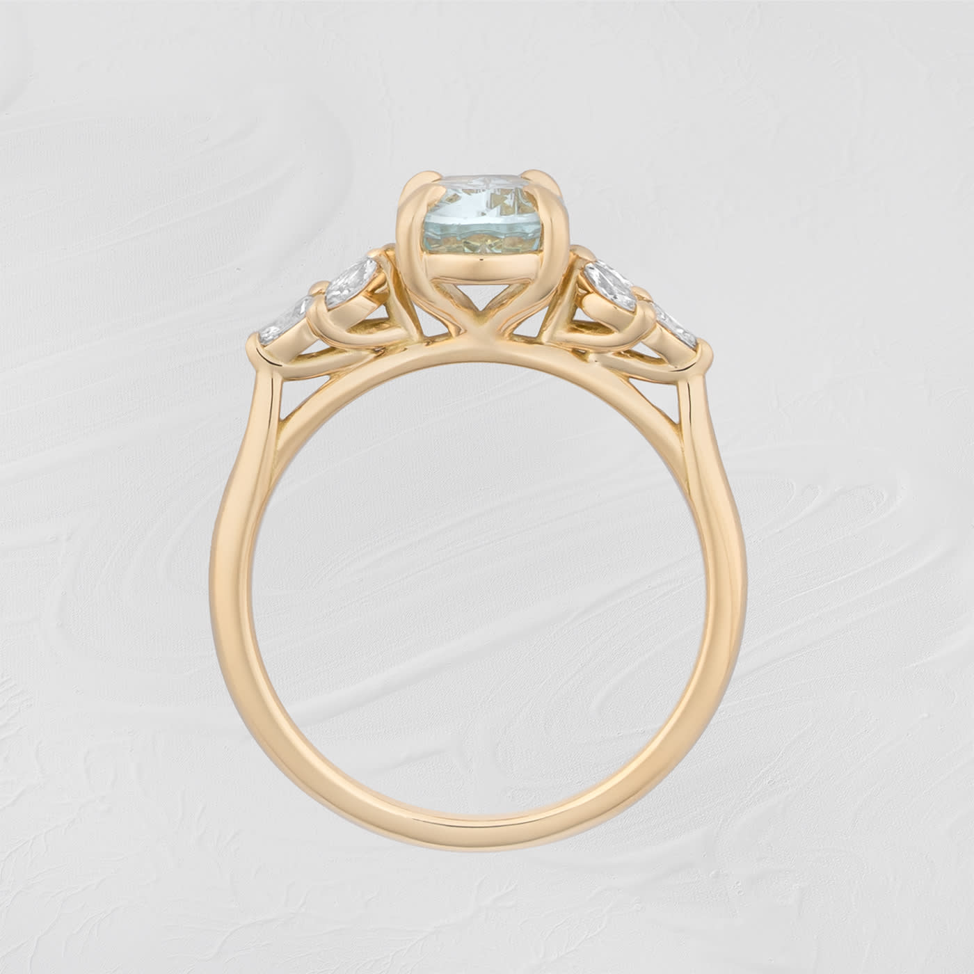 Description: This fine jewellery engagement ring features a central 1.30ct oval icy blue aquamarine, custom cut by lapidary Brett Kosnar. The aquamarine is complemented by six lab-grown marquise accent diamonds, totalling 0.23ct. The stones are secured in an 18ct yellow gold setting with a floral-inspired, flowing mount.