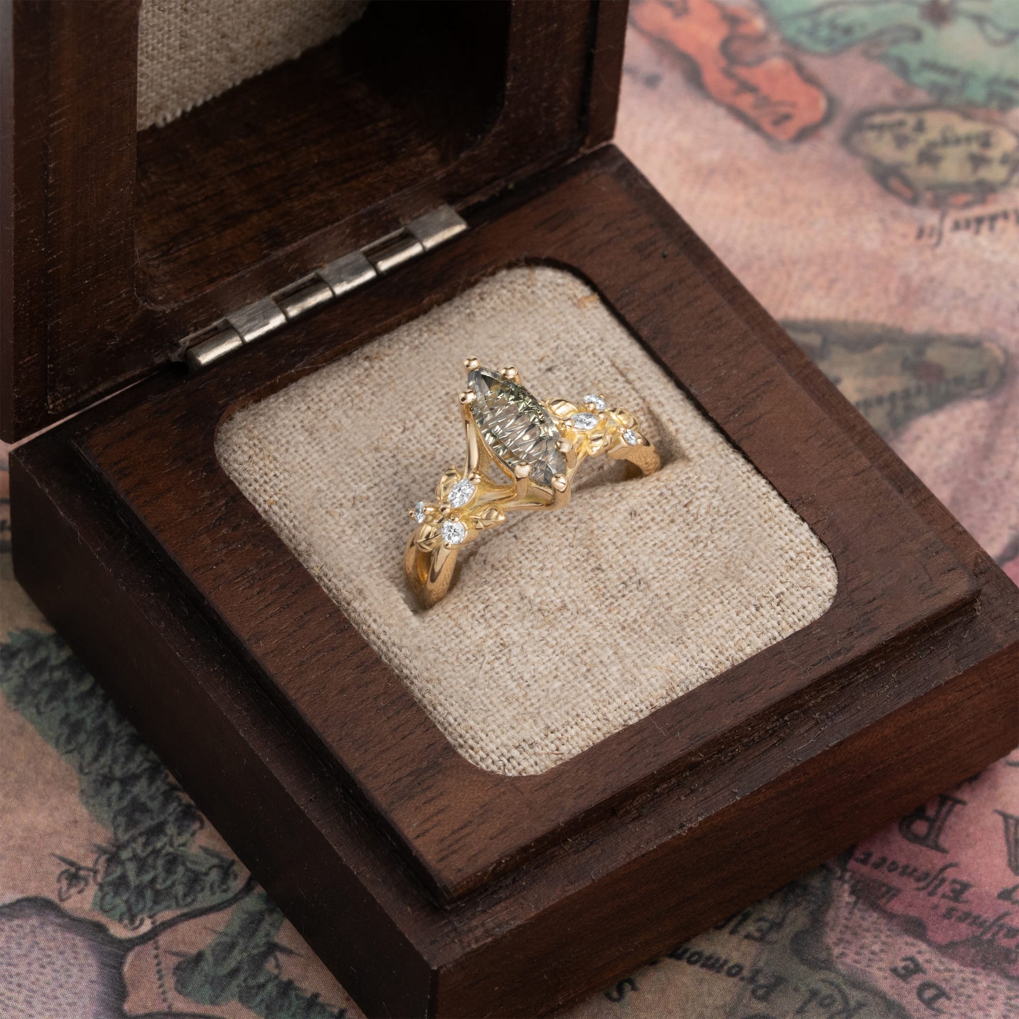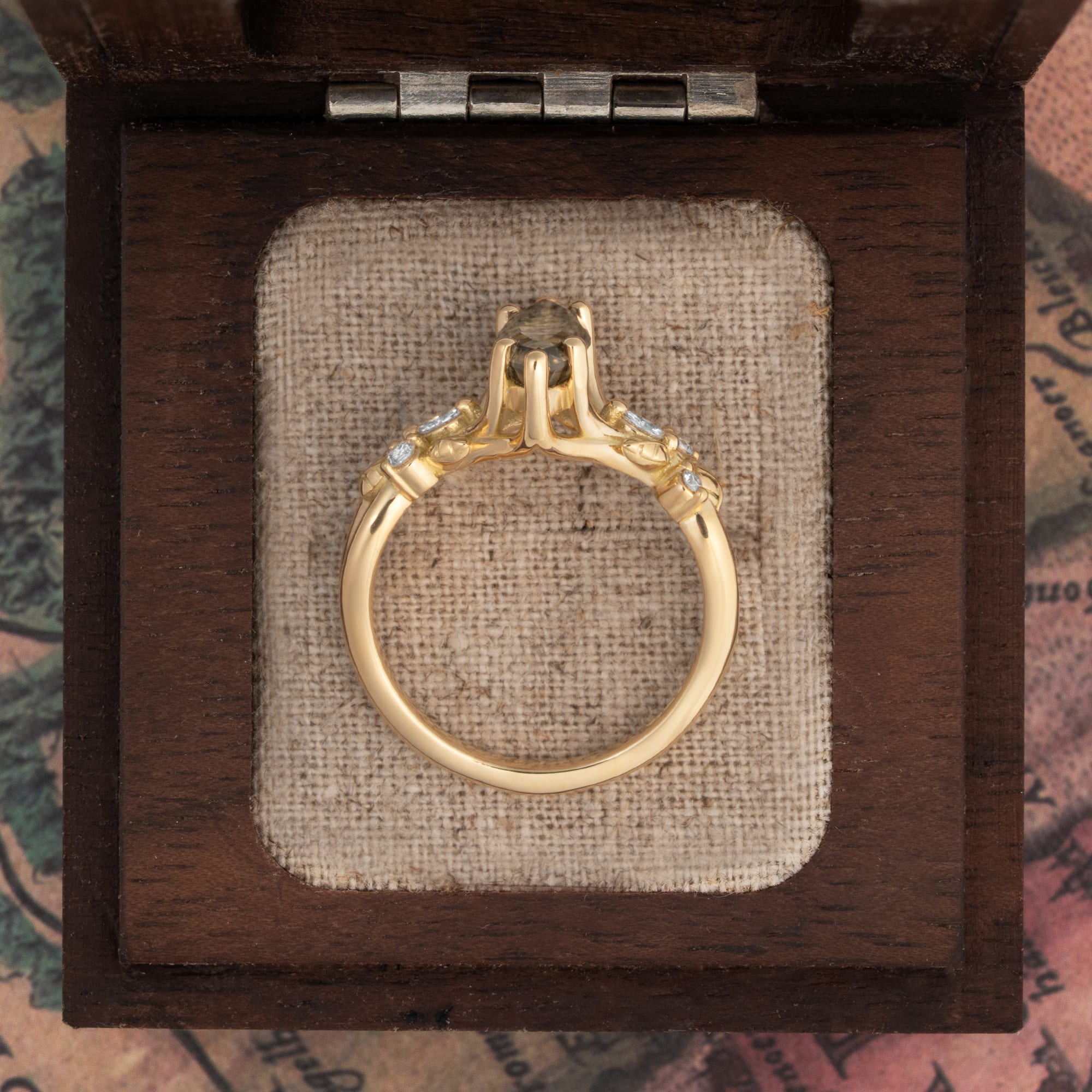 Description: The Flora Belle tourmaline and diamond ring features a marquise shape tourmaline, cut by world renowned lapidary John Dyer, in his signature 'Deep Concave' cut. The tourmaline displays a gorgeous colour changing hue of olive green and grey. The design is accented by a a cluster of miniature golden leaves and diamonds, in a weaving band, all in 18ct yellow gold.